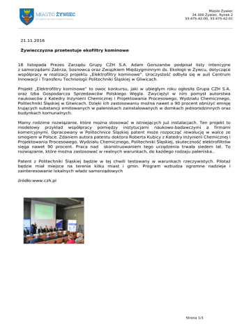 Miasto Żywiec 34-300 Żywiec, Rynek 2 33-475-42-00, 33-475-42-01 21.11.2016 Żywiecczyzna przetestuje ekofiltry kominowe 18 listopada Prezes Zarządu Grupy CZH S.A. Adam Gorszanów podpisał listy intencyjne z samorządami Zabrza, Sosnowca oraz Związkiem Międzygminnym ds. Ekologii w Żywcu, dotyczące współpracy w realizacji projektu „Elektrofiltry kominowe”. Uroczystość odbyła się w auli Centrum Innowacji i Transferu Technologii Politechniki Śląskiej w Gliwicach. Projekt „Elektrofiltry kominowe” to owoc konkursu, jaki w ubiegłym roku ogłosiła Grupa CZH S.A. oraz Izba Gospodarcza Sprzedawców Polskiego Węgla. Zwyciężył w nim pomysł autorstwa naukowców z Katedry Inżynierii Chemicznej i Projektowania Procesowego, Wydziału Chemicznego, Politechniki Śląskiej w Gliwicach. Dzięki ich zastosowaniu można nawet o 90 procent obniżyć emisję trujących substancji emitowanych w paleniskach zainstalowanych w domkach jednorodzinnych oraz budynkach komunalnych. Mamy rodzime rozwiązanie, które można stosować w istniejących już instalacjach. Ten projekt to modelowy przykład współpracy pomiędzy instytucjami naukowo-badawczymi a firmami komercyjnymi. Opracowany w Politechnice Śląskiej patent może rozpocząć rewolucję w walce ze smogiem w Polsce. Zdaniem autora patentu doktora Roberta Kubicy z Katedry Inżynierii Chemicznej i Projektowania Procesowego, Wydziału Chemicznego, Politechniki Śląskiej, skuteczność elektrofiltrów sięga nawet 90 procent. Praca nad skonstruowaniem tego urządzenia trwała siedem lat. To rozwiązanie, które można zastosować w realnych warunkach, do każdego rodzaju paleniska.. Patent z Politechniki Śląskiej będzie w tej chwili testowany w warunkach rzeczywistych. Pilotaż będzie miał miejsce na terenie kilku miast i gmin. Program wzbudza ogromne nadzieje i zainteresowanie lokalnych władz samorządowych źródło:www.czh.pl Strona 1/1 Powered by TCPDF (www.tcpdf.org)