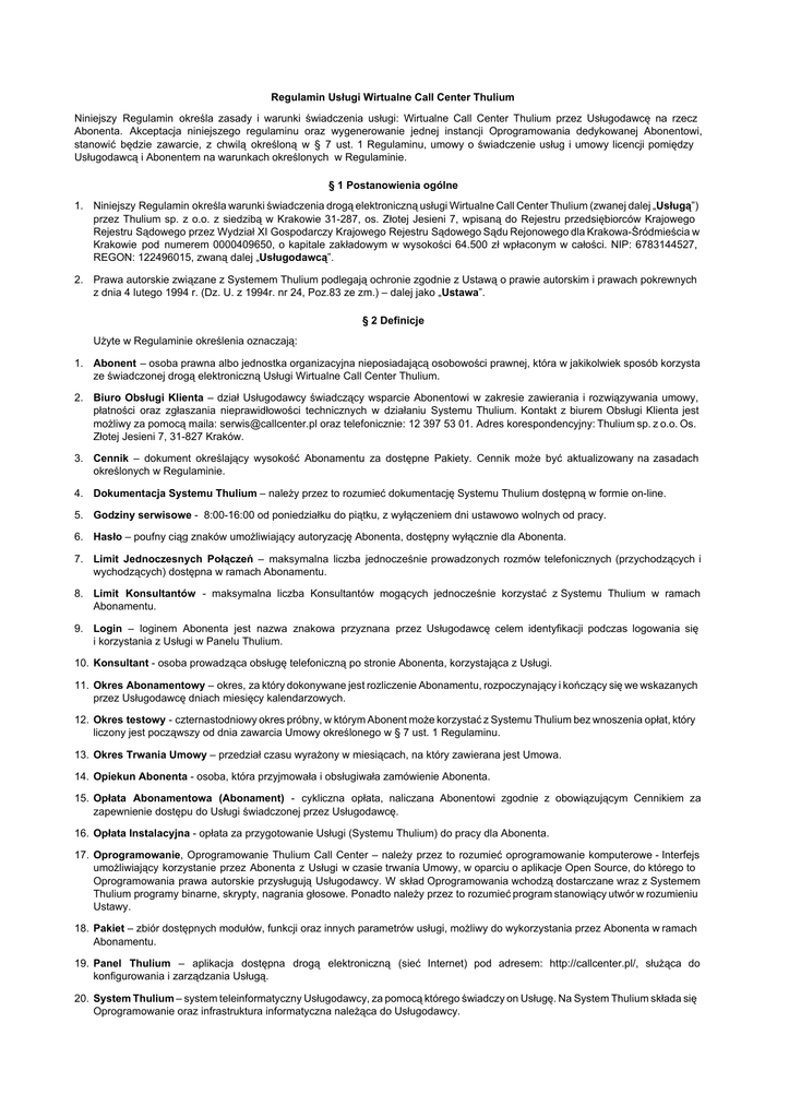 Regulamin Usługi Wirtualne Call Center Thulium Niniejszy Regulamin określa zasady i warunki świadczenia usługi: Wirtualne Call Center Thulium przez Usługodawcę na rzecz Abonenta. Akceptacja niniejszego regulaminu oraz wygenerowanie jednej instancji Oprogramowania dedykowanej Abonentowi, stanowić będzie zawarcie, z chwilą określoną w § 7 ust. 1 Regulaminu, umowy o świadczenie usług i umowy licencji pomiędzy Usługodawcą i Abonentem na warunkach określonych w Regulaminie. § 1 Postanowienia ogólne 1. Niniejszy Regulamin określa warunki świadczenia drogą elektroniczną usługi Wirtualne Call Center Thulium (zwanej dalej „Usługą”) przez Thulium sp. z o.o. z siedzibą w Krakowie 31-287, os. Złotej Jesieni 7, wpisaną do Rejestru przedsiębiorców Krajowego Rejestru Sądowego przez Wydział XI Gospodarczy Krajowego Rejestru Sądowego Sądu Rejonowego dla Krakowa-Śródmieścia w Krakowie pod numerem 0000409650, o kapitale zakładowym w wysokości 64.500 zł wpłaconym w całości. NIP: 6783144527, REGON: 122496015, zwaną dalej „Usługodawcą”. 2. Prawa autorskie związane z Systemem Thulium podlegają ochronie zgodnie z Ustawą o prawie autorskim i prawach pokrewnych z dnia 4 lutego 1994 r. (Dz. U. z 1994r. nr 24, Poz.83 ze zm.) – dalej jako „Ustawa”. § 2 Definicje Użyte w Regulaminie określenia oznaczają: 1. Abonent – osoba prawna albo jednostka organizacyjna nieposiadającą osobowości prawnej, która w jakikolwiek sposób korzysta ze świadczonej drogą elektroniczną Usługi Wirtualne Call Center Thulium. 2. Biuro Obsługi Klienta – dział Usługodawcy świadczący wsparcie Abonentowi w zakresie zawierania i rozwiązywania umowy, płatności oraz zgłaszania nieprawidłowości technicznych w działaniu Systemu Thulium. Kontakt z biurem Obsługi Klienta jest możliwy za pomocą maila: [email protected] oraz telefonicznie: 12 397 53 01. Adres korespondencyjny: Thulium sp. z o.o. Os. Złotej Jesieni 7, 31-827 Kraków. 3. Cennik – dokument określający wysokość Abonamentu za dostępne Pakiety. Cennik może być aktualizowany na zasadach określonych w Regulaminie. 4. Dokumentacja Systemu Thulium – należy przez to rozumieć dokumentację Systemu Thulium dostępną w formie on-line. 5. Godziny serwisowe - 8:00-16:00 od poniedziałku do piątku, z wyłączeniem dni ustawowo wolnych od pracy. 6. Hasło – poufny ciąg znaków umożliwiający autoryzację Abonenta, dostępny wyłącznie dla Abonenta. 7. Limit Jednoczesnych Połączeń – maksymalna liczba jednocześnie prowadzonych rozmów telefonicznych (przychodzących i wychodzących) dostępna w ramach Abonamentu. 8. Limit Konsultantów - maksymalna liczba Konsultantów mogących jednocześnie korzystać z Systemu Thulium w ramach Abonamentu. 9. Login – loginem Abonenta jest nazwa znakowa przyznana przez Usługodawcę celem identyfikacji podczas logowania się i korzystania z Usługi w Panelu Thulium. 10. Konsultant - osoba prowadząca obsługę telefoniczną po stronie Abonenta, korzystająca z Usługi. 11. Okres Abonamentowy – okres, za który dokonywane jest rozliczenie Abonamentu, rozpoczynający i kończący się we wskazanych przez Usługodawcę dniach miesięcy kalendarzowych. 12. Okres testowy - czternastodniowy okres próbny, w którym Abonent może korzystać z Systemu Thulium bez wnoszenia opłat, który liczony jest począwszy od dnia zawarcia Umowy określonego w § 7 ust. 1 Regulaminu. 13. Okres Trwania Umowy – przedział czasu wyrażony w miesiącach, na który zawierana jest Umowa. 14. Opiekun Abonenta - osoba, która przyjmowała i obsługiwała zamówienie Abonenta. 15. Opłata Abonamentowa (Abonament) - cykliczna opłata, naliczana Abonentowi zgodnie z obowiązującym Cennikiem za zapewnienie dostępu do Usługi świadczonej przez Usługodawcę. 16. Opłata Instalacyjna - opłata za przygotowanie Usługi (Systemu Thulium) do pracy dla Abonenta. 17. Oprogramowanie, Oprogramowanie Thulium Call Center – należy przez to rozumieć oprogramowanie komputerowe - Interfejs umożliwiający korzystanie przez Abonenta z Usługi w czasie trwania Umowy, w oparciu o aplikacje Open Source, do którego to Oprogramowania prawa autorskie przysługują Usługodawcy. W skład Oprogramowania wchodzą dostarczane wraz z Systemem Thulium programy binarne, skrypty, nagrania głosowe. Ponadto należy przez to rozumieć program stanowiący utwór w rozumieniu Ustawy. 18. Pakiet – zbiór dostępnych modułów, funkcji oraz innych parametrów usługi, możliwy do wykorzystania przez Abonenta w ramach Abonamentu. 19. Panel Thulium – aplikacja dostępna drogą elektroniczną (sieć Internet) pod adresem: http://callcenter.pl/, służąca do konfigurowania i zarządzania Usługą. 20. System Thulium – system teleinformatyczny Usługodawcy, za pomocą którego świadczy on Usługę. Na System Thulium składa się Oprogramowanie oraz infrastruktura informatyczna należąca do Usługodawcy. § 3 Rodzaje i zakres świadczonych usług 1. Na mocy zawartej umowy oraz dokonanej przez Abonenta akceptacji Regulaminu, Usługodawca zobowiązuje się świadczyć na rzecz Abonenta następujące usługi: a) skonfigurowanie serwerów Usługodawcy, w celu umożliwienia Abonentowi korzystania z Systemu Thulium, w zakresie określonym poprzez Pakiet wybrany przez Abonenta, udostępnienie Abonentowi zamówionego Pakietu usług dostępnych przez Panel Thulium, b) udostępnienie Abonentowi Loginów i Haseł, umożliwiających logowanie do Panelu Thulium, w liczbie zgodnej z Limitem Konsultantów ustalonym z Opiekunem Abonenta, c) zapewnienie dostępu do Dokumentacji Systemu Thulium on-line. 2. Usługodawca świadczy Usługę na rzecz Abonenta w zakresie ustalonym z Opiekunem Abonenta. 3. Usługodawca zastrzega możliwość zmiany funkcjonalności Pakietów Systemu Thulium rozbudowując go o nowe funkcje i udogodnienia dla Abonentów. 4. Usługodawca świadczy na rzecz Abonenta wsparcie w Godzinach Serwisowy