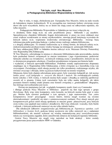 Tak było, czyli Noc Muzeów w Pedagogicznej Bibliotece Wojewódzkiej w Gdańsku Raz w roku, w maju, obchodzona jest Europejska Noc Muzeów, która na stale weszła do kalendarza imprez kulturalnych. W tę szczególną noc instytucje kultury otwierają swoje drzwi dla tych wszystkich, którzy na co dzień nie mają czasu na odkrywanie tajemnic, nie tylko muzeów. Pedagogiczna Biblioteka Wojewódzka w Gdańsku po raz trzeci włączyła się w działania, które mają m.in. na celu przybliżenie pracy biblioteki i jej zasobów. Specjalistyczny charakter biblioteki, bogate doświadczenie w pracy na rzecz edukacji oraz coraz większe oczekiwanie ze strony użytkowników, stawiają przed instytucją wyzwania do których należy m.in. wspieranie środowiska oświatowego. Biblioteka tworząc bazę informacyjną pełni podwójną funkcję: z jednej strony realizuje zadania biblioteczne, a z drugiej edukacyjne. Te ostatnie realizowane są w różnej formie, do których należy m.in. niekonwencjonalne przekazywanie wiedzy bazując na istniejącym potencjale biblioteki. Do bazy edukacyjnej PBW w Gdańsku można zaliczyć m.in. Muzeum Oświaty Pomorskiej oraz Regionalną Izbę Edukacyjną W Noc Muzeów, odwiedzając te miejsca w obecności bibliotekarza jako przewodnika, można było posłuchać historii związanych ze starym tornistrem i jego wyposażeniem, podziwiać fartuszki szkolne czy świadectwa , na których widnieją oceny z przedmiotów, których nie ma w dzisiejszym programie szkolnym. Z każdym przedmiotem związana jest historia ludzi i wydarzeń, o których opowiadał bibliotekarz. Podobnie zostały zaprezentowane eksponaty znajdujące się w Regionalnej Izbie Edukacyjnej, a które związane są z kaszubską wsią i jej zwyczajami. Zwiedzający mieli okazję poznać nie tylko przedmioty codziennego użytku, ale również zwyczaje i obrzędy, które są jeszcze kultywowane na terenie wiejskim. Miejscem, które było chętnie odwiedzane przez gości, były warsztaty kaligrafii pt. Jak można ładnie pisać, czyli kaligrafia w zeszycie dla dużych i małych. Na zwiedzających czekały ławki szkolne z XIX wieku, w których można było usiąść i obsadką ze stalówką spróbować swoich sił w pisaniu. Celem tych warsztatów była nie tylko nauka kaligrafii, ale także poznanie historii trudnej sztuki pisania oraz historii związanej z „pradziadkiem” długopisu, bez którego niewyobrażalne jest życie. Dzisiaj nie pamiętamy już jak wyglądały komputery marki Atari czy Commodor i dlatego podczas Nocy Muzeów w bibliotece pojawili się fani tego sprzętu z grupy Retrokomp. Były więc retro komputery, retro konsole, na których można było grać w retro gry. Można było również posłuchać o tym sprzęcie i jego zastosowaniu. Ten „retro komputerowy świat” przyciągnął rzesze fanów, którzy mogli wymieć się swoimi doświadczeniami i podzielić się nimi z zainteresowanymi osobami. Przy okazji starych gier komputerowych goście mieli okazję spotkania ze starymi grami planszowymi, przy których swój wolny czas spędzali nasi rodzice i dziadkowie. Był więc chińczyk i warcaby, były bierki i młynek, z którymi próbowali zmierzyć się nie tylko młodzi ludzie. Dla młodszych odbiorów zorganizowano grę biblioteczną pt. Tajemniczy opiekun, czyli bibliotekarz w krainie liczb, podczas której uczniowie nie tylko zmierzyli się z zadaniami bibliotekarskimi, ale musieli wykazać się wiedzą matematyczną przy rozszyfrowywaniu tekstu czy rozwiązaniu zagadek, które umożliwiały dotarcie do kolejnych tajemnic biblioteki. Goście Nocy Muzeów nie mogli więc narzekać na brak atrakcji , które zostały przygotowane przez pracowników PBW w Gdańsku.