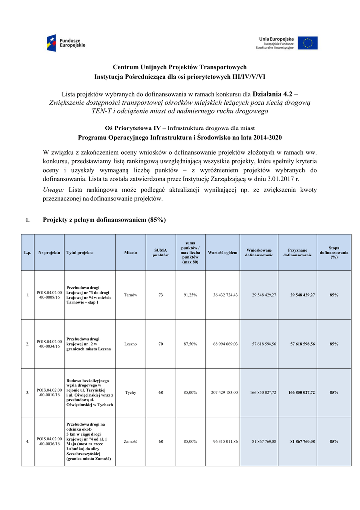 Centrum Unijnych Projektów Transportowych Instytucja Pośrednicząca dla osi priorytetowych III/IV/V/VI Lista projektów wybranych do dofinansowania w ramach konkursu dla Działania 4.2 – Zwiększenie dostępności transportowej ośrodków miejskich leżących poza siecią drogową TEN-T i odciążenie miast od nadmiernego ruchu drogowego Oś Priorytetowa IV – Infrastruktura drogowa dla miast Programu Operacyjnego Infrastruktura i Środowisko na lata 2014-2020 W związku z zakończeniem oceny wniosków o dofinansowanie projektów złożonych w ramach ww. konkursu, przedstawiamy listę rankingową uwzględniającą wszystkie projekty, które spełniły kryteria oceny i uzyskały wymaganą liczbę punktów – z wyróżnieniem projektów wybranych do dofinansowania. Lista ta została zatwierdzona przez Instytucję Zarządzającą w dniu 3.01.2017 r. Uwaga: Lista rankingowa może podlegać aktualizacji wynikającej np. ze zwiększenia kwoty przeznaczonej na dofinansowanie projektów. 1. Projekty z pełnym dofinansowaniem (85%) Miasto POIS.04.02.00 -00-0008/16 Przebudowa drogi krajowej nr 73 do drogi krajowej nr 94 w mieście Tarnowie – etap I Tarnów 73 91,25% 36 432 724,43 29 548 429,27 29 548 429,27 85% POIS.04.02.00 -00-0034/16 Przebudowa drogi krajowej nr 12 w granicach miasta Leszna Leszno 70 87,50% 68 994 669,03 57 618 598,56 57 618 598,56 85% POIS.04.02.00 -00-0010/16 Budowa bezkolizyjnego węzła drogowego w rejonie ul. Turyńskiej i ul. Oświęcimskiej wraz z przebudową ul. Oświęcimskiej w Tychach Tychy 68 85,00% 207 429 183,00 166 850 027,72 166 850 027,72 85% POIS.04.02.00 -00-0036/16 Przebudowa drogi na odcinku około 5 km w ciągu drogi krajowej nr 74 od al. 1 Maja (most na rzece Łabuńka) do ulicy Szczebrzeszyńskiej (granica miasta Zamość) Zamość 68 85,00% 96 315 011,86 81 867 760,08 81 867 760,08 85% Nr projektu 1. 2. 4. Wartość ogółem Wnioskowane dofinansowanie Przyznane dofinansowanie Stopa dofinansowania (%) Tytuł projektu L.p. 3. suma punktów / max liczba punktów (max 80) SUMA punktów 5. POIS.04.02.00 -00-0045/16 Przebudowa DK 78 na odcinku od ronda Wileńskiego do ronda Gliwickiego w Rybniku Rybnik 68 85,00% 17 140 493,83 14 405 442,16 14 405 442,16 85% 6. POIS.04.02.00 -00-0006/16 Przebudowa ul. Grunwaldzkiej na odcinku od Węzła Zachodniego do granicy miasta Bydgoszczy Bydgoszcz 67 83,75% 147 999 998,34 113 028 133,94 113 028 133,94 85% 7. POIS.04.02.00 -00-0043/16 Rozbudowa DK-46 – ulicy Głównej i ulicy Przejazdowej wraz z budową obejścia ul. Św. Barbary do ul. Pułaskiego w Częstochowie Częstochowa 66 82,50% 120 169 200,86 96 697 572,99 96 697 572,99 85% 8. POIS.04.02.00 -00-0012/16 Przebudowa układu komunikacyjnego Łomży w ciągu drogi krajowej nr 63 Łomża 65 81,25% 19 803 414,12 16 832 902,00 16 832 902,00 85% 9. POIS.04.02.00 -00-0009/16 Budowa obwodnicy Wałbrzycha w ciągu drogi krajowej nr 35 Wałbrzych 62 77,50% 397 480 381,71 296 792 459,33 296 792 459,33 85% 10. POIS.04.02.00 -00-0041/16 Rozbudowa ulicy Igołomskiej w Krakowie Kraków 62 77,50% 436 827 377,36 310 215 655,20 310 215 655,20 85% 11. POIS.04.02.00 -00-0015/16 Budowa odcinka drogi od ul. Daszyńskiego do ul. Rybnickiej w Gliwicach - Zachodnia część obwodnicy miasta Gliwice 60 75,00% 152 583 271,22 116 729 909,79 116 729 909,79 85% POIS.04.02.00 -00-0021/16 Usprawnienie połączenia komunikacyjnego pomiędzy wyspami Uznam i Wolin w Świnoujściu – budowa tunelu pod Świną Świnoujście 60 75,00% 912 562 026,68 775 677 722,67 775 677 722,67 85% 12. 2. Projekty z dofinansowaniem obniżonym (27%) z uwagi na dostępną wartość alokacji L.p. Nr projektu Tytuł projektu Miasto SUMA punktów suma punktów / max liczba punktów (max 80) Nowy Sącz 59 73,75% 90 813 990,00 77 191 891,50 24 511 403,44 27% Wartość ogółem Wnioskowane dofinansowanie Przyznane dofinansowanie Stopa dofinansowania (%) 13. POIS.04.02.00 -00-0013/16 Przebudowa układu komunikacyjnego ulic Krakowska, Legionów, Bulwar Narwiku w Nowym Sączu w ciągu dróg krajowych nr 75 i 28 14. POIS.04.02.00 -00-0022/16 Przebudowa i rozbudowa ul. Łódzkiej na odcinku od ul. Lipnowskiej do ul. Zdrojowej w Toruniu Toruń 59 73,75% 37 738 302,28 31 831 080,31 10 107 595,97 27% 15. POIS.04.02.00 -00-0028/16 Rozbudowa i przebudowa DK 94 w Sosnowcu - Etap I Rozbudowa skrzyżowania DK 94 z ul. Długosza Sosnowiec 59 73,75% 88 950 000,00 73 907 500,00 23 468 482,43 27% POIS.04.02.00 -00-0040/16 Modernizacja wschodniego wylotu DK nr 22 w Gorzowie Wlkp. na odcinku od ronda Sybiraków do granic miasta Gorzów Wielkopols ki 59 73,75% 57 977 460,95 49 278 750,81 15 647 904,45 27% 16. 3. Projekty, które z uwagi na dostępną wartość alokacji nie uzyskały dofinansowania (lista rezerwowa) L.p. Nr projektu 17. POIS.04.02.0000-0018/16 Tytuł projektu Miasto SUMA punktów Rozbudowa DK 52 (ul. Krakowskiej / ul. Żywieckiej) w Bielsku-Białej BielskoBiała 58 suma punktów / max liczba punktów (max 80) 72,50% Wartość ogółem 151 331 195,72 Wnioskowane dofinansowanie 126 073 948,75 Przyznane dofinansowanie 0,00 Stopa dofinansowania (%) 18. POIS.04.02.0000-0035/16 Poprawa warunków komunikacyjnych w ciągu drogi krajowej nr 92 w Poznaniu Poznań 58 72,50% 244 443 500,63 121 668 705,17 0,00 19. POIS.04.02.0000-0019/16 Rozbudowa Drogi Krajowej Nr 81 od węzła autostrady A4 z DK86 do budowanego węzła z ul. Armii Krajowej – Etap I Katowice 57 71,25% 400 018 137,92 338 262 714,14 0,00 20. POIS.04.02.0000-0020/16 Rozbudowa Drogi Krajowej Nr 81 od węzła autostrady A4 z DK86 do budowanego węzła z ul. Armii Krajowej, etap IV – Rozbudowa DK81 na odcinku ul. Kościuszki z budową węzła Armii Krajowej Katowice 57 71,25% 132 841 828,93 111 407 158,50 0,00 21. POIS.04.02.0000-0024/16 Wiadukt Biskupia Górka w Gdańsku Gdańsk 57 71,25% 138 469 158,91 117 693 557,57 0,00 22. POIS.04.02.0000-0031/16 Przebudowa układu drogowego na pl. Bpa Chrapka w Toruniu Toruń 57 71,25% 26 316 488,65 22 214 856,37 0,00 23. POIS.
