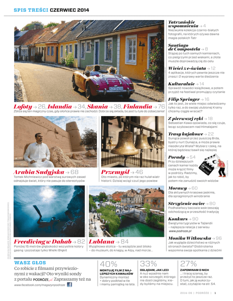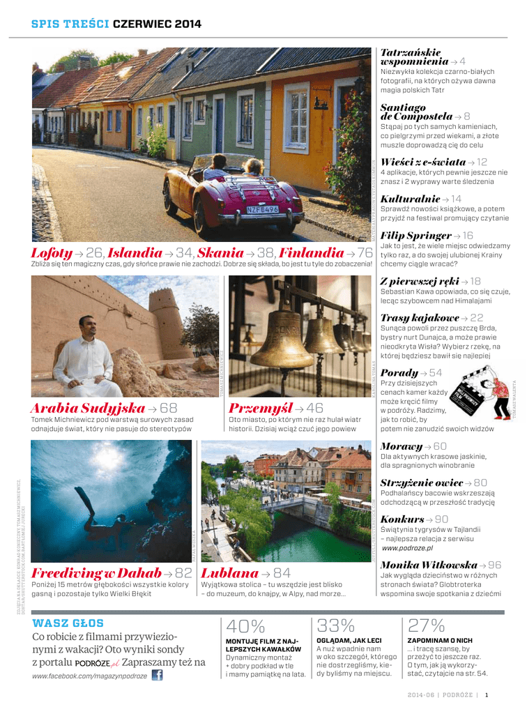 SPIS TREŚCI CZERWIEC 2014 Tatrzańskie wspomnienia / 4 Niezwykła kolekcja czarno-białych fotografii, na których ożywa dawna magia polskich Tatr Santiago de Compostela / 8 MATERIAŁY PRASOWE YSTADS KOMMUN Stąpaj po tych samych kamieniach, co pielgrzymi przed wiekami, a złote muszle doprowadzą cię do celu Lofoty / 26, Islandia / 34, Skania / 38, Finlandia / 76 Zbliża się ten magiczny czas, gdy słońce prawie nie zachodzi. Dobrze się składa, bo jest tu tyle do zobaczenia! Wieści z e-świata / 12 4 aplikacje, których pewnie jeszcze nie znasz i 2 wyprawy warte śledzenia Kulturalnie / 14 Sprawdź nowości książkowe, a potem przyjdź na festiwal promujący czytanie Filip Springer / 16 Jak to jest, że wiele miejsc odwiedzamy tylko raz, a do swojej ulubionej Krainy chcemy ciągle wracać? Z pierwszej ręki / 18 Sebastian Kawa opowiada, co się czuje, lecąc szybowcem nad Himalajami Trasy kajakowe / 22 Arabia Sudyjska / 68 Przemyśl / 46 Tomek Michniewicz pod warstwą surowych zasad odnajduje świat, który nie pasuje do stereotypów Oto miasto, po którym nie raz hulał wiatr historii. Dzisiaj wciąż czuć jego powiew Porady / 54 Przy dzisiejszych cenach kamer każdy może kręcić filmy w podróży. Radzimy, jak to robić, by potem nie zanudzić swoich widzów Morawy / 60 JOYFULL/SHUTTERSTOCK.COM Strzyżenie owiec / 80 RAFAŁ MESZKA ZDJĘCIA NA OKŁADCE: KONRAD KONIECZNY, TOMASZ MICHNIEWICZ, DOHTAR/SHUTTERSTOCK.COM, BARTŁOMIEJ JURECKI Dla aktywnych krasowe jaskinie, dla spragnionych winobranie Freediving w Dahab / 82 Lublana / 84 Poniżej 15 metrów głębokości wszystkie kolory gasną i pozostaje tylko Wielki Błękit Wyjątkowa stolica – tu wszędzie jest blisko – do muzeum, do knajpy, w Alpy, nad morze... WASZ GŁOS Co robicie z filmami przywiezionymi z wakacji? Oto wyniki sondy Zapraszamy też na z portalu www.facebook.com/magazynpodroze Podhalańscy bacowie wskrzeszają odchodzącą w przeszłość tradycję Konkurs / 90 Świątynia tygrysów w Tajlandii – najlepsza relacja z serwisu www.podroze.pl Monika Witkowska / 96 Jak wygląda dzieciństwo w różnych stronach świata? Globtroterka wspomina swoje spotkania z dziećmi 40% 33% 27% MONTUJĘ FILM Z NAJLEPSZYCH KAWAŁKÓW OGLĄDAM, JAK LECI ZAPOMINAM O NICH A nuż wpadnie nam w oko szczegół, którego nie dostrzegliśmy, kiedy byliśmy na miejscu. ... i tracę szansę, by przeżyć to jeszcze raz. O tym, jak ją wykorzystać, czytajcie na str. 54. Dynamiczny montaż + dobry podkład w tle i mamy pamiątkę na lata. 2014 - 06 | P O DR ÓŻ E | 1 TOMASZ WALENTA KAROLINA TOMAS TOMASZ MICHNIEWICZ Sunąca powoli przez puszczę Brda, bystry nurt Dunajca, a może prawie nieodkryta Wisła? Wybierz rzekę, na której będziesz bawił się najlepiej