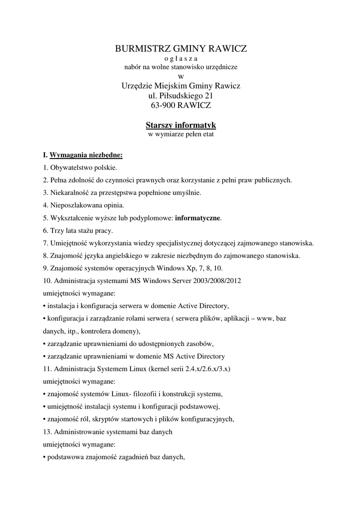 BURMISTRZ GMINY RAWICZ ogłasza nabór na wolne stanowisko urzędnicze w Urzędzie Miejskim Gminy Rawicz ul. Piłsudskiego 21 63-900 RAWICZ Starszy informatyk w wymiarze pełen etat I. Wymagania niezbędne: 1. Obywatelstwo polskie. 2. Pełna zdolność do czynności prawnych oraz korzystanie z pełni praw publicznych. 3. Niekaralność za przestępstwa popełnione umyślnie. 4. Nieposzlakowana opinia. 5. Wykształcenie wyższe lub podyplomowe: informatyczne. 6. Trzy lata stażu pracy. 7. Umiejętność wykorzystania wiedzy specjalistycznej dotyczącej zajmowanego stanowiska. 8. Znajomość języka angielskiego w zakresie niezbędnym do zajmowanego stanowiska. 9. Znajomość systemów operacyjnych Windows Xp, 7, 8, 10. 10. Administracja systemami MS Windows Server 2003/2008/2012 umiejętności wymagane: • instalacja i konfiguracja serwera w domenie Active Directory, • konfiguracja i zarządzanie rolami serwera ( serwera plików, aplikacji – www, baz danych, itp., kontrolera domeny), • zarządzanie uprawnieniami do udostępnionych zasobów, • zarządzanie uprawnieniami w domenie MS Active Directory 11. Administracja Systemem Linux (kernel serii 2.4.x/2.6.x/3.x) umiejętności wymagane: • znajomość systemów Linux- filozofii i konstrukcji systemu, • umiejętność instalacji systemu i konfiguracji podstawowej, • znajomość ról, skryptów startowych i plików konfiguracyjnych, 13. Administrowanie systemami baz danych umiejętności wymagane: • podstawowa znajomość zagadnień baz danych, • instalacja i konfiguracja serwerów podstawowych typu baz danych (MS SQL, MySQL, Firebird) • podstawowa znajomość składni SQL 14. Zagadnienia sieci lokalnych i urządzeń sieciowych • znajomość zasad funkcjonowania sieci komputerowych w szczególności sieci Ethernet • konfiguracja zarządzanych przełączników sieciowych, • konfiguracja różnorodnych urządzeń UTM, ADSL, routerów i Access Point'ów WiFi, itp. II. Wymagania dodatkowe: 1. Znajomość systemów z grupy RADIX, zagadnień CEPIK, ŻRÓDŁO. 2. Umiejętność stosowania i interpretowania przepisów prawa. 3.Umiejętność pracy pod presją czasu i odporność na stres. 4.Prawo jazdy kat. B 5.Dyspozycyjność. II. Zakres zadań wykonywanych na stanowisku: 1. Administracja Polityką Bezpieczeństwa. 2. Nadzór nad prawidłowym zabezpieczeniem systemu informatycznego Urzędu 3. Wdrażanie systemów i programów informatycznych. 4. Prowadzenie spraw związanych z prawidłową eksploatacją programów i sprzętu komputerowego, usuwanie drobnych usterek i nieprawidłowości. 5. Kontrola działania sieci komputerowej oraz zapewnienie prawidłowego jej funkcjonowania. 6. Konfigurowanie i przyłączanie do sieci nowych urządzeń komputerowych. 7. Planowanie potrzeb w zakresie sprzętu komputerowego i oprogramowania 8. Obsługa systemów informatycznych wspomagających wybory i referenda. 9. Administracja oprogramowaniem specjalistycznym , użytkowym i merytorycznym. III. Warunki pracy na stanowisku: Praca w budynku i poza budynkiem Urzędu Miejskiego Gminy Rawicz. Zatrudnienie na czas określony, w pełnym wymiarze czasu pracy od listopad 2015 r. (z możliwością przedłużenia na czas nieokreślony). Wskaźnik zatrudnienia osób niepełnosprawnych w rozumieniu przepisów o rehabilitacji zawodowej i społecznej oraz zatrudnianiu osób niepełnosprawnych poprzedzającym opublikowanie ogłoszenia jest większy niż 6%. IV. Wykaz dokumentów wymaganych przy składaniu ofert: 1. CV z uwzględnieniem przebiegu pracy zawodowej, w miesiącu 2. list motywacyjny, 3. kwestionariusz osobowy, 4. kopie dokumentów potwierdzających wykształcenie oraz staż pracy (brak udokumentowania stażu pracy wyklucza udział w dalszej procedurze naboru), 5. oświadczenie: - o posiadaniu obywatelstwa polskiego, - oświadczenie kandydata, stwierdzające, iż posiada pełną zdolność do czynności prawnych oraz korzysta z pełni praw publicznych, - oświadczenie kandydata o niekaralności za przestępstwo popełnione umyślnie, - oświadczenie kandydata o wyrażeniu zgody na przetwarzanie danych osobowych zawartych w ofercie dla potrzeb niezbędnych do realizacji procesu rekrutacji, zgodnie z ustawą z dnia 29 sierpnia 1997 roku o ochronie danych osobowych (t.j. Dz. U. z 2014 r. poz. 1182 z późn. zm.), 6. kopie innych zaświadczeń dokumentujących posiadane umiejętności, ukończone kursy specjalistyczne, studia podyplomowe itp. V. Termin i miejsce składania dokumentów: Dokumenty należy składać w terminie do dnia 2 listopada 2015 roku w zamkniętej kopercie z umieszczonym imieniem, nazwiskiem i adresem kandydata oraz z dopiskiem „nabór na starszego informatyka - nie otwierać ” a) osobiście w godzinach pracy urzędu w Biurze Obsługi Klienta, b) listownie na adres Urząd Miejski Gminy Rawicz Wydział Organizacji i Nadzoru, ul. Piłsudskiego 21, 63-900 Rawicz (decyduje data wpływu do Urzędu Miejskiego). Oferty, które wpłyną do Urzędu po wyżej określonym terminie nie będą rozpatrywane. Dodatkowe informacje można uzyskać pod nr telefonu 65 546 5405. Szczegółowe informacje o naborze znajdują się na stronie: www.rawicz.pl Rawicz, dnia 15 października 2015 roku Burmistrz Gminy Rawicz (-) Grzegorz Kubik