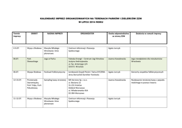 KALENDARZ IMPREZ ORGANIZOWANYCH NA TERENACH PARKÓW I ZIELEŃCÓW ZZM W LIPCU 2014 ROKU Termin imprezy OBIEKT NAZWA IMPREZY ORGANIZATOR 4-5.07. Wysp a Słodowa Muzyka Młodego Wrocławia i kino plenerowe Centrum Informacji i Rozwoju Społecznego Agata Jurczyk 06.07. Park Słowackiego Joga w Parku Fabryka Energii – Centrum Jogi Wrocław Justyna Andrzejewska ul. Św. Antoniego 2/4 50-073 Wrocław Joanna Kowalewska Joga nieodpłatnie dla mieszkańców Wrocławia 06.07. Wyspa Słodowa Festiwal Folklorystyczny Agata Jurczyk Koncerty zespołów folklorystycznych 12-13.07. Promenada Staromiejska, Park Tołpy, Park Południowy Sampling kawy mrożonej MS Services Sp. z o.o. ul. Bociana 22 31-231 Kraków Oddział Warszawa ul. Włodarzewska 45A 02-384 Warszawa Joanna Kowalewska Rozdawanie mrożonej kawy z pojazdu mobilnego w postaci roweru 11-12.07. Wysp a Słodowa Muzyka Młodego Wrocławia i kino plenerowe Centrum Informacji i Rozwoju Społecznego Agata Jurczyk Łemkowski Zespól Pieśni i Tańca KYCZERA Jerzy Starzyński Dyrektor Festiwalu Osoba odpowiedzialna ze strony ZZM Działania w ramach imprezy 13.07. Park Słowackiego Joga w Parku 12-13.07. Wyspa Piasek Sportowa Wyspa 13.07. Wyspa Słodowa Wyspa na Weekend 14.07. 16.07. Wyspa Słodowa 18-19.07. Wysp a Słodowa 19-20.07. Fabryka Energii – Centrum Jogi Wrocław Justyna Andrzejewska ul. Św. Antoniego 2/4 50-073 Wrocław Joanna Kowalewska Joga nieodpłatnie dla mieszkańców Wrocławia Agata Jurczyk Prezentowanie sportów nieolimpijskich Centrum Informacji i Rozwoju Społecznego Agata Jurczyk Piknik rodzinny Brave Festival – Przeciw wypędzeniom z kultury 2014 – „Święte ciało” Stowarzyszenie Kultury Teatralnej „PIEŚŃ KOZŁA” Agata Jurczyk Dwa plenerowe spektakle „Mudijettu. Rytualny teatr ze świątyń Kerali” Centrum Informacji i Rozwoju Społecznego Agata Jurczyk Wyspa Piasek Muzyka Młodego Wrocławia i kino plenerowe Sportowa Wyspa Centrum Informacji i Rozwoju Społecznego Agata Jurczyk Prezentowanie sportów nieolimpijskich 20.07. Wyspa Słodowa Wyspa na Weekend Centrum Informacji i Rozwoju Społecznego Agata Jurczyk Piknik rodzinny 20.07. Park Słowackiego Joga w Parku Fabryka Energii – Centrum Jogi Wrocław Justyna Andrzejewska ul. Św. Antoniego 2/4 50-073 Wrocław Joanna Kowalewska Joga nieodpłatnie dla mieszkańców Wrocławia 25-26.07. Wysp a Słodowa Muzyka Młodego Wrocławia i kino plenerowe Centrum Informacji i Rozwoju Społecznego Agata Jurczyk 26-27.07. Wyspa Piasek Sportowa Wyspa Centrum Informacji i Rozwoju Społecznego Agata Jurczyk Centrum Informacji i Rozwoju Społecznego 2 Prezentowanie sportów nieolimpijskich 27.07. Park Słowackiego Joga w Parku 27.07. Park Kasprowicza Wyspa Słodowa Teatr Lalek Wyspa na Weekend Fabryka Energii – Centrum Jogi Wrocław Justyna Andrzejewska ul. Św. Antoniego 2/4 50-073 Wrocław Joanna Kowalewska Joga nieodpłatnie dla mieszkańców Wrocławia Teatr Lalek Maria de Lurdes Małgorzata Nowak Teatrzyk dla dzieci Centrum Informacji i Rozwoju Społecznego Agata Jurczyk 27.07. 3