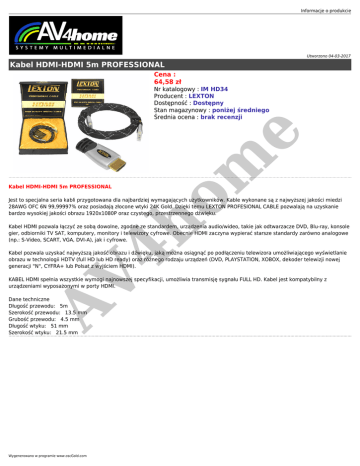 Informacje o produkcie Utworzono 04-03-2017 Kabel HDMI-HDMI 5m PROFESSIONAL Cena : 64,58 zł Kabel HDMI-HDMI 5m PROFESSIONAL om e Nr katalogowy : IM HD34 Producent : LEXTON Dostępność : Dostępny Stan magazynowy : poniżej średniego Średnia ocena : brak recenzji 4h Jest to specjalna seria kabli przygotowana dla najbardziej wymagających użytkowników. Kable wykonane są z najwyższej jakości miedzi 28AWG OFC 6N 99,99997% oraz posiadają złocone wtyki 24K Gold. Dzięki temu LEXTON PROFESIONAL CABLE pozwalają na uzyskanie bardzo wysokiej jakości obrazu 1920x1080P oraz czystego, przestrzennego dźwięku. Kabel HDMI pozwala łączyć ze sobą dowolne, zgodne ze standardem, urządzenia audio/wideo, takie jak odtwarzacze DVD, Blu-ray, konsole gier, odbiorniki TV SAT, komputery, monitory i telewizory cyfrowe. Obecnie HDMI zaczyna wypierać starsze standardy zarówno analogowe (np.: S-Video, SCART, VGA, DVI-A), jak i cyfrowe. AV Kabel pozwala uzyskać najwyższą jakość obrazu i dźwięku, jaką można osiągnąć po podłączeniu telewizora umożliwiającego wyświetlanie obrazu w technologii HDTV (full HD lub HD ready) oraz różnego rodzaju urządzeń (DVD, PLAYSTATION, XOBOX, dekoder telewizji nowej generacji "N", CYFRA+ lub Polsat z wyjściem HDMI). KABEL HDMI spełnia wszystkie wymogi najnowszej specyfikacji, umożliwia transmisję sygnału FULL HD. Kabel jest kompatybilny z urządzeniami wyposażonymi w porty HDMI. Dane techniczne Długość przewodu: 5m Szerokość przewodu: 13.5 mm Grubość przewodu: 4.5 mm Długość wtyku: 51 mm Szerokość wtyku: 21.5 mm Wygenerowano w programie www.oscGold.com