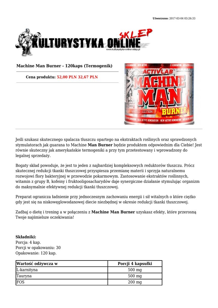 Utworzono: 2017-03-04 03:26:33 Machine Man Burner - 120kaps (Termogenik) Cena produktu: 52,00 PLN 32,67 PLN Jeśli szukasz skutecznego spalacza tłuszczu opartego na ekstraktach roślinych oraz sprawdzonych stymulatorach jak guarana to Machine Man Burner będzie produktem odpowiednim dla Ciebie! Jest równie skuteczny jak amerykańskie termogeniki a przy tym przetestowany i wprowadzony do legalnej sprzedaży. Bogaty skład powoduje, że jest to jeden z najbardziej kompleksowych reduktorów tłuszczu. Prócz skutecznej redukcji tkanki tłuszczowej przyspiesza przemianę materii i sprzyja naturalnemu rozwojowi flory bakteryjnej w przewodzie pokarmowym. Zastosowanie ekstraktów roślinnych, witamin z grupy B, kofeiny i fruktooligosacharydów daje synergiczne działanie stymulując organizm do maksymalnie efektywnej redukcji tkanki tłuszczowej. Preparat ogranicza ładnienie przy jednoczesnym zachowaniu energii i sił witalnych o które ciężko gdy jest się na niskowęglowodanowej diecie niezbędnej w okresie redukcji tkanki tłuszczowej. Zadbaj o dietę i trening a w połączeniu z Machine Man Burner uzyskasz efekty, które przerosną Twoje najśmielsze oczekiwania! Składniki: Porcja: 4 kap. Porcji w opakowaniu: 30 Opakowanie: 120 kap. Wartość odżywcza w Porcji 4 kapsułki L-karnityna 500 mg Tauryna 500 mg FOS 200 mg Kofeina 156 mg L-tryptofan 150 mg L-tyrozyna 200 mg L-fenyloalanina 100 mg Inulina 200 mg Kwas alfa-liponowy 100 mg Inozytol 50 mg Ekstrakt z gorzkiej pomarańczy 335 mg Ekstrakt z zielonej herbaty 223 mg Ekstrakt z Garcinia cambogia 167 mg Ekstrakt z guarany 200 mg Ekstrakt z mniszka lekarskiego 150 mg Ekstraktt ze skrzypu polnego 150 mg Ekstrakt z morszczynu pęcherzykowatego 150 mg Ekstrakt z pieprzu czarnego 5.3 mg Pieprz Cayenne 100 mg Witamina B1 1.1 mg Witamina B2 1.4 mg Niacyna 16 mg Kwas pantotenowy 6 mg Witamina B6 1.4 mg Biotyna 50 µg Kwas foliowy 200 mg Witamina B12 2.5 mcg Chrom 200 mg Sposób użycia: Rekomendowane dawkowanie odżywki to 2 kapsułki 2 razy dziennie. Adres: http://www.ko.sklep.pl/ Telefon: kom. 782 010 880 Email: [email protected]