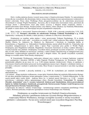 Parafia św. Franciszka z Asyżu i św. Piotra z Alkantary w Namysłowie NIEDZIELA WIELKANOCNA I OKTAWA WIELKANOCY Namysłów, 5.04-12.04.2015 r. OGŁOSZENIA DUSZPASTERSKIE Dziś z wielką radością chcemy wyrazić naszą wiarę w Zmartwychwstanie Pańskie. To najważniejsze święta dla nas wszystkich, dla chrześcijan, którzy swoją wiarę budują na tym najważniejszym wydarzeniu w historii człowieka. Przez okres Wielkiego Postu przygotowywaliśmy się do odnowienia przyrzeczeń chrzcielnych w Liturgii Wigilii Paschalnej. Życzymy, aby te święta były ożywieniem wiary, powrotem do swojego chrztu i odnowieniem więzi jaką mamy wszyscy z Bogiem dzięki cierpieniu, śmierci i zmartwychwstaniu Syna Bożego. Rozpoczynamy czas Oktawy, która zakończy się Niedzielą Miłosierdzia. (W piątek w czasie oktawy nie obowiązuje nas post od pokarmów mięsnych). Msze święte w uroczystość Zmartwychwstania o 20.00, 6.00 z procesją rezurekcyjną, 8.30, 9.45, 11.00, 12.15 i 18. Nieszpory chrzcielne na zakończenie Świętego Triduum Paschalnego o g. 17.00. Zapraszamy i zachęcamy do udziału, a także prosimy o zabranie ze sobą świec chrzcielnych. Dziękujemy za wspólne, pełne piękna i wiary przeżywanie Triduum Paschalnego. W to dzieło zaangażowanych było wiele osób – wszystkim za wszelki trud i wkład serdeczne Bóg zapłać. Liturgicznej Służbie Ołtarza, ks. Adamowi, ks. Markowi, ks. Bartoszowi i klerykom za wspaniałą służbę, p. Kościelnemu, p. Organiście i p. Aleksandrowi Szachnowskiemu, naszej scholii Kwiatki św. Franciszka oraz wszystkim zaangażowanym w śpiew chóru i śpiew Pasji i czuwanie przy grobie w Wielki Piątek. Dziękujemy pani Magdalenie Urbaniak, Magdalenie i Krystynie Żurawkom za troskę o piękno dekoracji i wystrój kościoła oraz plebanii. Dziękujemy wszystkim którzy przekazali życzenia świąteczne., za wszelkie dary na stół, ofiary składane na inwestycje i remonty, a także Grupie Charytatywnej za zaangażowanie przy przekazaniu i rozprowadzeniu pokarmów dla osób z ubogich rodzin. Nie sposób wszystkich wymienić, dlatego za wszelkie dobro Wam Drodzy dziękujemy! W Poniedziałek Wielkanocny tradycyjnie ofiarami przy wyjściu ze świątyni będziemy wspierać nasze seminarium i kleryków MWSD, a także Papieski Wydział Teologiczny we Wrocławiu. Także w poniedziałek odbędzie się po mszy św. o g. 11.00 zmiana tajemnic różańcowych. Ufamy, że spotkanie z Chrystusem Zmartwychwstałym przyczyni się do pogłębienia naszej więzi z Bogiem i członkami rodziny, w tym także z chorymi i osobami w podeszłym wieku. Msze Święte w naszym kościele w tym dniu wg stałego porządku. • Zapraszamy w czwartek i przyszłą niedzielę o g. 19.00 do wysłuchania już ostatnich KATECHEZ ZWIASTOWANIA. • Za tydzień – druga niedziela wielkanocna, zwana także Niedzielą Białą lub niedzielą Miłosierdzia Bożego. W tym dniu obchodzić będziemy święto patronalne Caritas i rozpoczniemy 71. Tydzień Miłosierdzia. To dla naszej parafii także ważny dzień – podczas Mszy św. w intencji naszej Ojczyzny o g. 11.00 – zostanie poświęcona i odsłonięta tablica upamiętniająca ofiary Zbrodni Katyńskiej. Uroczystość 75. rocznicy Zbrodni „Katyńskiej” oraz 5. rocznicy katastrofy lotniczej pod Smoleńskiem, której przewodniczył będzie ks. Infułat Kazimierz Jandziszak, przygotowało Stowarzyszenie Pamięci Armii Krajowej oraz Zarząd Starostwa Powiatu Namysłowskiego. • Zapraszamy do nabycia i lektury świątecznego - kwietniowego numeru czasopisma parafialnego Pokój i Dobro. Również polecamy świąteczne egzemplarze Gościa Niedzielnego oraz Niedzielę. Dziękujemy za wspólne świętowanie tej Niedzieli Zmartwychwstania. Składamy gościom i parafianom serdeczne życzenia Bożego Błogosławieństwa w rozpoczętej Oktawie Wielkanocy, kierując szczególne życzenia w stronę wszystkich jubilatów i solenizantów. Na ten nowy tydzień niech nam wszystkim błogosławi Pan Bóg Wszechmogący! Duszpasterze