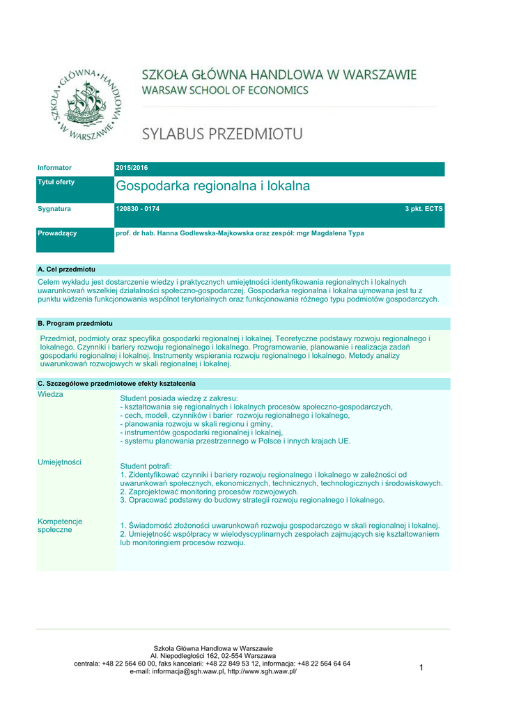 Informator 2015/2016 7\WXáRIHUW\ Gospodarka regionalna i lokalna Sygnatura 120830 - 0174 3URZDG]ąF\ SURIGUKDE+DQQD*RGOHZVND0DMNRZVNDRUD]]HVSyáPJU0DJGDOHQD7\SD 3 pkt. ECTS A. Cel przedmiotu &HOHPZ\NáDGXMHVWGRVWDUF]HQLHZLHG]\LSUDNW\F]Q\FKXPLHMĊWQRĞFLLGHQW\ILNRZDQLDUHJLRQDOQ\FKLORNDOQ\FK XZDUXQNRZDĔZV]HONLHMG]LDáDOQRĞFLVSRáHF]QRJRVSRGDUF]HM*RVSRGDUNDUHJLRQDOQDLORNDOQDXMPRZDQDMHVWWX] SXQNWXZLG]HQLDIXQNFMRQRZDQLDZVSyOQRWWHU\WRULDOQ\FKRUD]IXQNFMRQRZDQLDUyĪQHJRW\SXSRGPLRWyZJRVSRGDUF]\FK B. Program przedmiotu Przedmiot, podmioty oraz specyfika gospodarki regionalnej i lokalnej. Teoretyczne podstawy rozwoju regionalnego i ORNDOQHJR&]\QQLNLLEDULHU\UR]ZRMXUHJLRQDOQHJRLORNDOQHJR3URJUDPRZDQLHSODQRZDQLHLUHDOL]DFMD]DGDĔ gospodarki regionalnej i lokalnej. Instrumenty wspierania rozwoju regionalnego i lokalnego. Metody analizy XZDUXQNRZDĔUR]ZRMRZ\FKZVNDOLUHJLRQDOQHMLORNDOQHM &6]F]HJyáRZHSU]HGPLRWRZHHIHNW\NV]WDáFHQLD Wiedza 6WXGHQWSRVLDGDZLHG]Ċ]]DNUHVX NV]WDáWRZDQLDVLĊUHJLRQDOQ\FKLORNDOQ\FKSURFHVyZVSRáHF]QRJRVSRGDUF]\FK - cech, modeli, czynników i barier rozwoju regionalnego i lokalnego, - planowania rozwoju w skali regionu i gminy, - instrumentów gospodarki regionalnej i lokalnej, - systemu planowania przestrzennego w Polsce i innych krajach UE. 8PLHMĊWQRĞFL Kompetencje VSRáHF]QH Student potrafi: 1=LGHQW\ILNRZDüF]\QQLNLLEDULHU\UR]ZRMXUHJLRQDOQHJRLORNDOQHJRZ]DOHĪQRĞFLRG XZDUXQNRZDĔVSRáHF]Q\FKHNRQRPLF]Q\FKWHFKQLF]Q\FKWHFKQRORJLF]Q\FKLĞURGRZLVNRZ\FK 2=DSURMHNWRZDüPRQLWRULQJSURFHVyZUR]ZRMRZ\FK 32SUDFRZDüSRGVWDZ\GREXGRZ\VWUDWHJLLUR]ZRMXUHJLRQDOQHJRLORNDOQHJR 1ĝZLDGRPRĞü]áRĪRQRĞFLXZDUXQNRZDĔUR]ZRMXJRVSRGDUF]HJRZVNDOLUHJLRQDOQHMLORNDOQHM 28PLHMĊWQRĞüZVSyáSUDF\ZZLHORG\VF\SOLQDUQ\FK]HVSRáDFK]DMPXMąF\FKVLĊNV]WDáWRZDQLHP lub monitoringiem procesów rozwoju. 6]NRáD*áyZQD+DQGORZDZ:DUV]DZLH $O1LHSRGOHJáRĞFL162, 02-554 Warszawa centrala: +48 22 564 60 00, faks kancelarii: +48 22 849 53 12, informacja: +48 22 564 64 64 e-mail: [email protected], http://www.sgh.waw.pl/ 1 c.d.Gospodarka regionalna i lokalna '6HPHVWUDOQ\SODQ]DMĊü 1 5HJLRQDOQHLORNDOQH]MDZLVNDVSRáHF]QRJRVSRGDUF]HDSROLW\NDPDNURHNRQRPLF]QD 2 *RVSRGDUNDUHJLRQDOQDLORNDOQDSRGVWDZRZHSRMĊFLDLGHILQLFMHSU]HGPLRWLSRGPLRW\ gospodarki region. i lokalnej. 3 6SHF\ILNDUR]ZRMXUHJLRQDOQHJRLORNDOQHJRFHFK\PRGHOHF]\QQLNLVSUDZF]HPRĪOLZRĞFL sterowania rozwojem. 4 Teoretyczne podstawy rozwoju regionalnego i lokalnego. 5 &]\QQLNLLEDULHU\UR]ZRMXUHJLRQDOQHJRLORNDOQHJRSRWU]HE\VSRáHF]QRĞFLORNDOQ\FK]DVRE\ ĞURGRZLVND 6 &]\QQLNLLEDULHU\UR]ZRMXUHJLRQDOQHJRLORNDOQHJRFG]DVRE\SUDF\LQIUDVWUXNWXUDSRWHQFMDá JRVSRGDUF]\U\QHN]E\WXNDSLWDáLQZHVW\F\MQ\L]DVRE\ILQDQVRZHQDXNDWHFKQRORJLD innowacje itp. 7 3RGVWDZRZHPHWRG\VSRáHF]QRJRVSRGDUF]\FKDQDOL]UHJLRQDOQ\FK 8 6SRáHF]Q\LHNRQRPLF]Q\Z\PLDUJRVSRGDURZDQLDZSU]HVWU]HQLLJRVSRGDURZDQLDSU]HVWU]HQLą 9 System planów zagospodarowania przestrzennego w Polsce na tle wybranych krajów UE. 10 Programowanie i planowanie rozwoju regionalnego i lokalnego. 11 *áyZQLDNWRU]\JRVSRGDUNLUHJLRQDOQHMLORNDOQHM 12 Ocena i monitoring procesów rozwojowych. 13 ,QVWUXPHQWDOL]DFMDJRVSRGDUNLUHJLRQDOQHMLORNDOQHMĞURGNLILQDQVRZHED]DLQIRUPDF\MQD doradztwo, kadry, innowacje. 14 3UDNW\F]QHPRĪOLZRĞFLRGG]LDá\ZDQLDQDUR]ZyMZVNDOLUHJLRQDOQHMLORNDOQHMLQVW\WXFMH NRPSHWHQFMHĞURGNL 15 6DPRU]ąG\WHU\WRULDOQHDUR]ZyMUHJLRQDOQ\LORNDOQ\ (/LWHUDWXUDSRGVWDZRZDRERZLą]NRZHSRGUĊF]QLNL Z. Strzelecki (red), Gospodarka regionalna i lokalna, Wydawnictwo Naukowe PWN, Warszawa 2008; T. Grosse, Polityka UHJLRQDOQD8QLL(XURSHMVNLHM3U]\NáDG*UHFML:áRFK,UODQGLLL3ROVNL,63:DUV]DZD--3DU\VHN76WU\MDNLHZLF] UHG5HJLRQVSRáHF]QRHNRQRPLF]Q\LUR]ZyMUHJLRQDOQ\%RJXFNL:\GDZQLFWZR1DXNRZH*RVSRGDUND UHJLRQDOQDLORNDOQDDUR]ZyM]UyZQRZDĪRQ\UHG=6WU]HOHFNL3/HJXWNR.REXV6WXGLD.3=.3$17RP&/,,3$1 Warszawa 2013 Strategia Europa 2020 a gospodarka regionalna i lokalna w Polsce, red. nauk. Z. Strzelecki, Wyd. Ministerstwo Infrastruktury i Rozwoju, Warszawa 2014 )/LWHUDWXUDX]XSHáQLDMąFD 7*URVVH3ROLW\NDUHJLRQDOQD8QLL(XURSHMVNLHMLMHMZSá\ZQDUR]ZyMJRVSRGDUF]\)(6WLIWXQJ:DUV]DZD2000; W. .RVLHGRZVNLUHG6DPRU]ąGWHU\WRULDOQ\ZSURFHVLHUR]ZRMXUHJLRQDOQHJRLORNDOQHJR712L.7RUXĔ2005; J.J.Parysek, 3RGVWDZ\JRVSRGDUNLORNDOQHM8$03R]QDĔ2001=6WU]HOHFNLUHG3ROLW\NDUHJLRQDOQDLVDPRU]ąGQRĞü6WXGLDL Prace (zeszyt naukowy 10), 2006, KES SGH. *1DMZDĪQLHMV]HSXEOLNDFMHDXWRUDyZGRW\F]ąFHSURSRQRZDQ\FK]DMĊü +*RGOHZVND0DMNRZVND3ROVNLHUHJLRQ\QDPDSLHDWUDNF\MQRĞFLLQZHVW\F\MQHMZ.U\]\VLFRGDOHMSUDFD]ELRURZD SRGUHG,/LFKQLDN2ILF\QD:\GDZQLF]D6*+:DUV]DZDV$WUDNF\MQRĞüLQZHVW\F\MQDUHJLRQyZ3ROVNL MDNRĨUyGáRSU]HGVLĊELRUF]\FKSU]HZDJNRQNXUHQF\MQ\FKSUDFD]HVSRáRZDSRGUHG+*RGOHZVNLHM0DMNRZVNLHM6WXGLDL $QDOL]\,QVW\WXWX3U]HGVLĊELRUVWZD2ILF\QD:\GDZQLF]D6*+:DUV]DZD$WUDNF\MQRĞüLQZHVW\F\MQDUHJLRQyZ 3ROVNLDNV]WDáWRZDQLHORNDOQ\FKLUHJLRQDOQ\FKVSHFMDOL]DFMLJRVSRGDUF]\FKSUDFD]HVSRáRZDSRGUHG+*RGOHZVNLHM 0DMNRZVNLHM6WXGLDL$QDOL]\,QVW\WXWX3U]HGVLĊELRUVWZD2ILF\QD:\GDZQLF]D6*+:DUV]DZD 6]NRáD*áyZQD+DQGORZDZ:DUV]DZLH $O1LHSRGOHJáRĞFL162, 02-554 Warszawa centrala: +48 22 564 60 00, faks kancelarii: +48 22 849 53 12, informacja: +48 22 564 64 64 e-mail: [email protected], http://www.sgh.waw.pl/ 2 c.d.Gospodarka regionalna i lokalna H. Sygnatury wymaganych prerekwizytów QLHVąZ\PDJDQH ,:\PLDULIRUPD]DMĊü Stacj. Sob. niedz. 3RSRáXG 2JyáHP 30 22 30 :\NáDG 30 16 30 - 6 - 3UDFDVDPRG]LHOQDSRGNRQWUROą Z\NáDGRZF\ -(OHPHQW\RFHQ\NRĔFRZHM referat 50% üZLF]HQLD 50% .:\PDJDQD]QDMRPRĞüMĊ]\NDREFHJR nie jest wymagana L. Kryteria selekcji 00HWRG\SURZDG]HQLD]DMĊü kejsy gry dyskusje XG]LDáSUDNW\NyZ inne 6]NRáD*áyZQD+DQGORZDZ:DUV]DZLH $O1LHSRGOHJáRĞFL162, 02-554 Warszawa centrala: +48 22 564 60 00, faks kancelarii: +48 22 849 53 12, informacja: +48 22 564 64 64 e-mail: [email protected], http://www.sgh.waw.pl/ 3