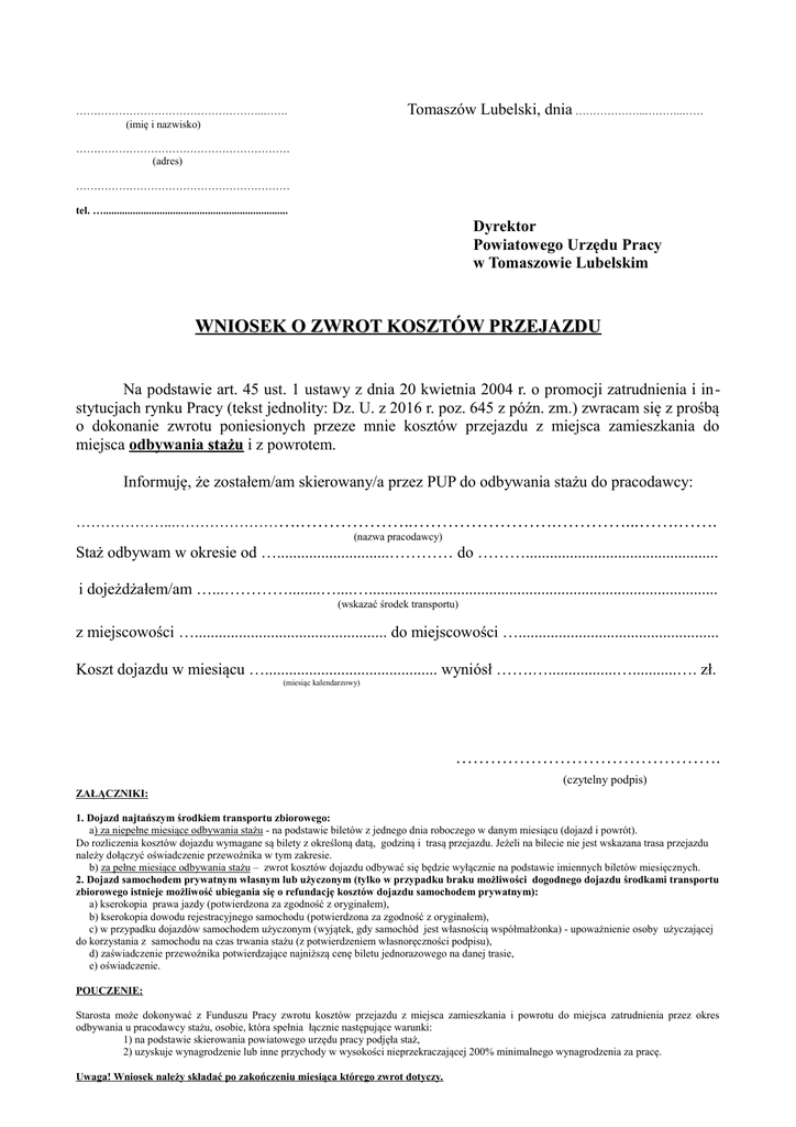 Tomaszów Lubelski, dnia ………………..………..…… ……………………………………………..……. (imię i nazwisko) …………………………………………………… (adres) …………………………………………………… tel. …..................................................................... Dyrektor Powiatowego Urzędu Pracy w Tomaszowie Lubelskim WNIOSEK O ZWROT KOSZTÓW PRZEJAZDU Na podstawie art. 45 ust. 1 ustawy z dnia 20 kwietnia 2004 r. o promocji zatrudnienia i instytucjach rynku Pracy (tekst jednolity: Dz. U. z 2016 r. poz. 645 z późn. zm.) zwracam się z prośbą o dokonanie zwrotu poniesionych przeze mnie kosztów przejazdu z miejsca zamieszkania do miejsca odbywania stażu i z powrotem. Informuję, że zostałem/am skierowany/a przez PUP do odbywania stażu do pracodawcy: ………………...…………………….………………..…………………….…………...…….……. (nazwa pracodawcy) Staż odbywam w okresie od …............................………… do ………................................................ i dojeżdżałem/am …...…………........…....…....................................................................................... (wskazać środek transportu) z miejscowości …................................................ do miejscowości ….................................................. Koszt dojazdu w miesiącu …........................................... wyniósł …….….................…...........…. zł. (miesiąc kalendarzowy) ………………………………………. (czytelny podpis) ZAŁĄCZNIKI: 1. Dojazd najtańszym środkiem transportu zbiorowego: a) za niepełne miesiące odbywania stażu - na podstawie biletów z jednego dnia roboczego w danym miesiącu (dojazd i powrót). Do rozliczenia kosztów dojazdu wymagane są bilety z określoną datą, godziną i trasą przejazdu. Jeżeli na bilecie nie jest wskazana trasa przejazdu należy dołączyć oświadczenie przewoźnika w tym zakresie. b) za pełne miesiące odbywania stażu – zwrot kosztów dojazdu odbywać się będzie wyłącznie na podstawie imiennych biletów miesięcznych. 2. Dojazd samochodem prywatnym własnym lub użyczonym (tylko w przypadku braku możliwości dogodnego dojazdu środkami transportu zbiorowego istnieje możliwość ubiegania się o refundację kosztów dojazdu samochodem prywatnym): a) kserokopia prawa jazdy (potwierdzona za zgodność z oryginałem), b) kserokopia dowodu rejestracyjnego samochodu (potwierdzona za zgodność z oryginałem), c) w przypadku dojazdów samochodem użyczonym (wyjątek, gdy samochód jest własnością współmałżonka) - upoważnienie osoby użyczającej do korzystania z samochodu na czas trwania stażu (z potwierdzeniem własnoręczności podpisu), d) zaświadczenie przewoźnika potwierdzające najniższą cenę biletu jednorazowego na danej trasie, e) oświadczenie. POUCZENIE: Starosta może dokonywać z Funduszu Pracy zwrotu kosztów przejazdu z miejsca zamieszkania i powrotu do miejsca zatrudnienia przez okres odbywania u pracodawcy stażu, osobie, która spełnia łącznie następujące warunki: 1) na podstawie skierowania powiatowego urzędu pracy podjęła staż, 2) uzyskuje wynagrodzenie lub inne przychody w wysokości nieprzekraczającej 200% minimalnego wynagrodzenia za pracę. Uwaga! Wniosek należy składać po zakończeniu miesiąca którego zwrot dotyczy. Tomaszów Lubelski, dnia .................................. ...................................................... (nazwisko i imię) ...................................................... (adres zamieszkania) ...................................................... (dowód osobisty seria nr) ...................................................... (wydany przez) ...................................................... (dzień wydania dowodu osobistego) OŚWIADCZENIE Oświadczam, że w miesiącu …………………...………… : (miesiąc kalendarzowy) 1) Poniosłam/em koszty przejazdu związane z dojazdem z miejsca zamieszkania do miejsca odbywania stażu w wysokości .............................. zł. 2) Uzyskałam(em) / nie uzyskałam(em)* wynagrodzenia lub innych przychodów w wysokości przekraczającej 200% minimalnego wynagrodzenia za pracę. ….…...……………………..……..…… (data i czytelny podpis składającego oświadczenie) * właściwe zaznaczyć