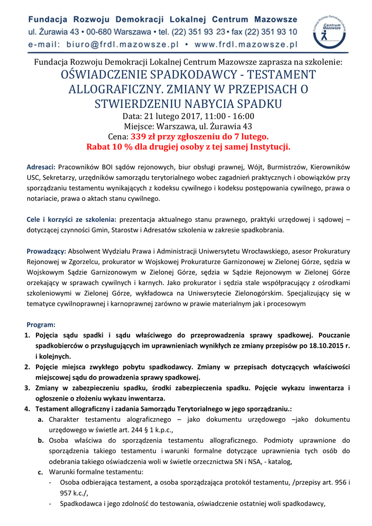 Fundacja Rozwoju Demokracji Lokalnej Centrum Mazowsze zaprasza na szkolenie: OŚWIADCZENIE SPADKODAWCY - TESTAMENT ALLOGRAFICZNY. ZMIANY W PRZEPISACH O STWIERDZENIU NABYCIA SPADKU Data: 21 lutego 2017, 11:00 - 16:00 Miejsce: Warszawa, ul. Żurawia 43 Cena: 339 zł przy zgłoszeniu do 7 lutego. Rabat 10 % dla drugiej osoby z tej samej Instytucji. Adresaci: Pracowników BOI sądów rejonowych, biur obsługi prawnej, Wójt, Burmistrzów, Kierowników USC, Sekretarzy, urzędników samorządu terytorialnego wobec zagadnień praktycznych i obowiązków przy sporządzaniu testamentu wynikających z kodeksu cywilnego i kodeksu postępowania cywilnego, prawa o notariacie, prawa o aktach stanu cywilnego. Cele i korzyści ze szkolenia: prezentacja aktualnego stanu prawnego, praktyki urzędowej i sądowej – dotyczącej czynności Gmin, Starostw i Adresatów szkolenia w zakresie spadkobrania. Prowadzący: Absolwent Wydziału Prawa i Administracji Uniwersytetu Wrocławskiego, asesor Prokuratury Rejonowej w Zgorzelcu, prokurator w Wojskowej Prokuraturze Garnizonowej w Zielonej Górze, sędzia w Wojskowym Sądzie Garnizonowym w Zielonej Górze, sędzia w Sądzie Rejonowym w Zielonej Górze orzekający w sprawach cywilnych i karnych. Jako prokurator i sędzia stale współpracujący z ośrodkami szkoleniowymi w Zielonej Górze, wykładowca na Uniwersytecie Zielonogórskim. Specjalizujący się w tematyce cywilnoprawnej i karnoprawnej zarówno w prawie materialnym jak i procesowym Program: 1. Pojęcia sądu spadki i sądu właściwego do przeprowadzenia sprawy spadkowej. Pouczanie spadkobierców o przysługujących im uprawnieniach wynikłych ze zmiany przepisów po 18.10.2015 r. i kolejnych. 2. Pojęcie miejsca zwykłego pobytu spadkodawcy. Zmiany w przepisach dotyczących właściwości miejscowej sądu do prowadzenia sprawy spadkowej. 3. Zmiany w zabezpieczeniu spadku, środki zabezpieczenia spadku. Pojęcie wykazu inwentarza i ogłoszenie o złożeniu wykazu inwentarza. 4. Testament allograficzny i zadania Samorządu Terytorialnego w jego sporządzaniu.: a. Charakter testamentu alograficznego – jako dokumentu urzędowego –jako dokumentu urzędowego w świetle art. 244 § 1 k.p.c., b. Osoba właściwa do sporządzenia testamentu allograficznego. Podmioty uprawnione do sporządzenia takiego testamentu i warunki formalne dotyczące uprawnienia tych osób do odebrania takiego oświadczenia woli w świetle orzecznictwa SN i NSA, - katalog, c. Warunki formalne testamentu: - Osoba odbierająca testament, a osoba sporządzająca protokół testamentu, /przepisy art. 956 i 957 k.c./, - Spadkodawca i jego zdolność do testowania, oświadczenie ostatniej woli spadkodawcy, 5. 6. 7. 8. - Ustalenie tożsamości testatora, - Świadkowie testamentu i zdolność do bycia świadkiem, - Odczytanie protokołu – zdolność zrozumienia treści, - Podpisy i pieczęcie na protokole testamentu, - Osoby głuche lub nieme a zdolność do sporządzenia testamentu allograficznego, d. Właściwość terytorialna przy sporządzaniu testamentu allograficznego, /właściwy organ/, e. Zabezpieczenie protokołu zawierającego testament: - Miejsce przechowania, - Ilość dokumentów, - Potrzeba ewidencjonowania testamentów, ewidencjonowanie akt czynności urzędowej związanej z przyjęciem ostatniej woli, - Dopuszczalność odtworzenia zaginionego testamentu, a. Zapisy, polecenia a określenie udziałów poszczególnych spadkobierców, czyli jak prawidłowo spisać testament nie naruszając rzeczywistej woli testatora. Nieważność testamentu z art. 951 k.c. - przesłanki, okoliczności, braki formalne. Konwersja testamentu allograficznego i uznanie go za ważny testament ustny, tj. testament przewidziany w art. 952 k.c.: a. Przesłuchanie świadków testamentu ustnego, b. Ustalenie kręgu spadkobierców Testamenty szczególne i zwykłe - przykłady: a. Testament ustny – szczególna sytuacja życiowa rola świadków, b. Testament własnoręczny holograficzny – oświadczenie woli, c. Testament podróżny. Postępowanie o otwarcie i ogłoszenie testamentu. W świetle zmian w przepisach KC, KPC i ustawy o notariacie: a. Akty stanu cywilnego – dokumenty urzędowe, b. Sąd właściwy do złożenia testamentu, czyli tzw. Sąd spadku, c. Podmiot legitymowany do złożenia wniosku o stwierdzenie nabycia spadku, d. Koszty sądowe wniosku o otwarcie i ogłoszenie testamentu, stwierdzenia nabycia spadku i ich obowiązek ponoszenia przez gminę i starostwo oraz inne podmioty, e. Warunki formalne wniosku o otwarcie i ogłoszenie testamentu, stwierdzenia nabycia spadku, w tym dołączenie aktu zgonu spadkodawcy, f. Zadania depozytariusza testamentu w gminie lub starostwie wobec wezwania sądu o złożenie testamentu, /postanowienie sądu o nakazaniu złożenia testamentu lub testamentów/, w tym obowiązek przedłożenia wszystkich złożonych testamentów, g. Wezwanie notariusza o udostępnienie testamentu. ZGŁOSZENIE OŚWIADCZENIE SPADKODAWCY - TESTAMENT ALLOGRAFICZNY. ZMIANY W PRZEPISACH O STWIERDZENIU NABYCIA SPADKU Data: 21 lutego 2017, 11:00 - 16:00 Miejsce: Warszawa, ul. Żurawia 43 Cena: 339 zł przy zgłoszeniu do 7 lutego. Rabat 10 % dla drugiej osoby z tej samej Instytucji. Instytucja (dane do faktury): ................................................................................................ Adres: ................................................................................................................................. NIP: ..................................................................................................................................... L.p. Imię i nazwisko Wydział tel. e-mail 1.......................................................................................................................................... 2.......................................................................................................................................... 3..................................