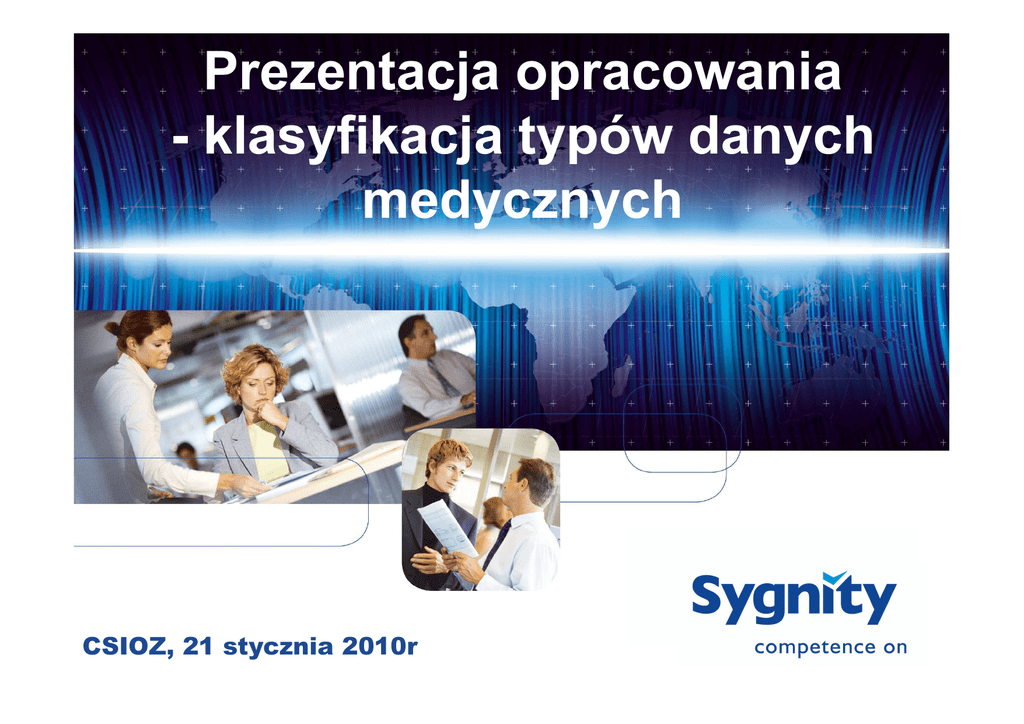 Prezentacja opracowania - klasyfikacja typów danych medycznych CSIOZ, 21 stycznia 2010r Tytuł projektu Identyfikacja, analiza i klasyfikacja typów danych medycznych oraz określenie modeli ich gromadzenia i udostępniania na potrzeby leczenia oraz prowadzenia polityki ochrony zdrowia z uwzględnieniem aspektów syntaktycznych i semantycznych oraz ilościowych tych danych w kontekście doświadczeń krajowych i międzynarodowych Zakres projektu • Klasyfikacja (model) danych obejmująca: indywidualne dane medyczne, rozszerzone dane medyczne, zbiorcze dane medyczne o charakterze statystycznym, syntetyczne wskaźniki stanu zdrowia pacjenta i grupy pacjentów, techniczne, dane niezwiązane z pacjentem. • Modele gromadzenia danych medycznych - analiza i ocena. • Modele udostępniania danych medycznych. • Kryteria jakości (wymagania) dla systemów informatycznych zasilających bazy danych danymi medycznymi. • Ilościowe oszacowanie danych medycznych. Produkty projektu Opracowanie w postaci dokumentu, obejmujące zakres projektu. Repozytorium projektu - zawiera komplet modeli opracowanych na potrzeby niniejszego dokumentu: – opracowane w narzędziu Enterprise Architect (Sparx Systems http://www.sparxsystems.com/), w formacie pliku EAP., – modele zrealizowane w notacjach: • • UML (Object Management Group - UML, http://www.uml.org/) ArchiMate (ArchiMate Version 1.0 Technical Standard, http://www.archimate.org/). Klasyfikacja typów danych medycznych Analiza aktów prawnych z dziedziny słuŜby zdrowia (str. 15 opracowania): – Diagnostyka laboratoryjna – Diagnostyka obrazowa i jądrowa – Farmacja i apteki – Leczenie uzdrowiskowe i sanatoryjne – Opieka zdrowotna realizowana ze środków publicznych – Profilaktyka – Ratownictwo medyczne – Świadczenia medyczne – Dokumentacja medyczna – Medycyna pracy – Medycyna orzecznicza (poza medycyną pracy) – Psychiatria – Zgon – Zaświadczenia lekarskie Klasyfikacja typów danych medycznych - kryteria Kryteria wyodrębniania klas danych - (str. 20 opracowania) – Za podstawę do opracowania klasyfikacji typów danych medycznych przyjęto zaproponowaną w Studium Wykonalności strukturę klasyfikacyjną. – Głównym kryterium klasyfikacyjnym jest uwzględnienie potrzeby zagwarantowania dostępu do wszystkich wymaganych danych medycznych dla uŜytkowników (aktorów) systemu SIOZ, celem świadczenia usług w ramach obszaru ochrony zdrowia. – Klasyfikacja danych nie jest oczywiście dostatecznym warunkiem spełnienia tego celu, niemniej jednak rzutuje w zasadniczy sposób na wiele aspektów korzystania z systemu, na przykład na sposób implementacji gromadzenia danych, udostępniania danych, zapewnienia bezpieczeństwa dostępu do danych. Klasyfikacja typów danych medycznych – opis modelu – – – – Model zawiera klasyfikację danych medycznych. Model ma charakter logiczny (konceptualny). Model zawiera dokumentację klas danych. Klasy zostały wyodrębnione na podstawie analizy aktów prawnych odnoszących się do obszaru słuŜby zdrowia oraz na podstawie doświadczenia wykonawcy w realizacji projektów z obszaru zdrowia z wykorzystaniem publikacji zrealizowanych w ramach projektu P1. Referencje: – • • • – do rejestrów medycznych do źródłowych aktów prawnych do procesów przewidzianych do wspierania w ramach projektu P1 Klasy modelu danych posiadają udokumentowane atrybuty, ich wymagalność, opisane zostały relacje pomiędzy klasami oraz krotności związków klas. Klasyfikacja typów danych medycznych - notacja Notacja zastosowana do opracowania modelu (str. 38 opracowania): – stereotypy klas: • • • – entity - encje (klasy) danych group - stereotyp wykorzystywany do definiowania grupy właściwości (atrybutów) attribute - stereotyp wykorzystywany jest do opisu właściwości (atrybutu) encji lub stanowi element grupy stereotypy artefaktów • • • • – statute - stereotyp artefaktu, który oznacza akt prawny (ustawę, rozporządzenie itp.), publication - stereotyp artefaktu, który oznacza innego rodzaju publikację niŜ akt prawny standard - stereotyp artefaktu, który reprezentuje specyfikację normy lub innego rodzaju standardu de facto lub de jure, classification - stereotyp artefaktu, który reprezentuje specyfikację klasyfikacji, w odróŜnieniu od stereotypu vocabulary, który reprezentuje zawartość informacyjną klasyfikacji. inne stereotypy: • • • – externalEntity - stereotyp dla encji zewnętrznej, pochodzącej z rejestru, spisu, ewidencji lub innej klasyfikacji zewnętrznej w stosunku do modelu, enumeration - stereotyp wykorzystywany do modelowania słownika zawierającego skończoną liczbę obiektów, vocabulary - stereotyp wykorzystywany do modelowania słownika zawierającego skończoną liczbę obiektów, w odróŜnieniu od enumeration słuŜy do oznaczenia słownika z klasyfikacji zewnętrznej w stosunku do modelu, związki i zaleŜności: • • • • • asocjacja (związki N:M) - association agregacja - aggregation kompozycja - composition generalizacja/specjalizacja - generalization zaleŜność w celu uzyskania identyfikowalności (trasowania) - dependency <<trace>> Klasyfikacja typów danych medycznych - przykłady Przykłady: – str. 352 - model klas powiązanych z „Rejestrem świadczeń” – str. 372 - opis atrybutów i związków klasy „Skierowanie/Zlecenie” Modele gromadzenia danych medycznych - zakres Analiza i ocena modeli gromadzenia informacji: – Lokalny u pacjenta – Lokalny u lekarza POZ – Rozproszony u świadczeniodawców – Centralnie składowane (str. 645) Modele gromadzenia danych medycznych – elementy modelu Elementy modelu (przykład str. 629 opracowania): – Opis modelu – Perspektywa biznesowa – Perspektywa aplikacji – Perspektywa technologiczna – Zakres gromadzonej informacji – Opcje realizacji – Interoperacyjność, standardy – Analiza SWOT – Wnioski Modele gromadzenia danyc