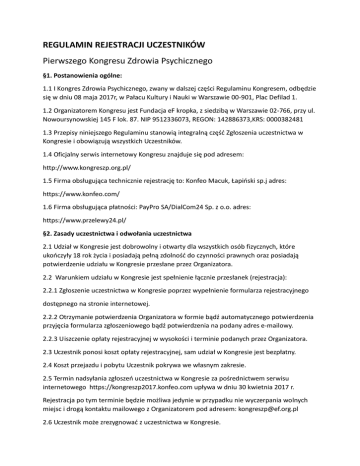 REGULAMIN REJESTRACJI UCZESTNIKÓW Pierwszego Kongresu Zdrowia Psychicznego §1. Postanowienia ogólne: 1.1 I Kongres Zdrowia Psychicznego, zwany w dalszej części Regulaminu Kongresem, odbędzie się w dniu 08 maja 2017r, w Pałacu Kultury i Nauki w Warszawie 00-901, Plac Defilad 1. 1.2 Organizatorem Kongresu jest Fundacja eF kropka, z siedzibą w Warszawie 02-766, przy ul. Nowoursynowskiej 145 F lok. 87. NIP 9512336073, REGON: 142886373,KRS: 0000382481 1.3 Przepisy niniejszego Regulaminu stanowią integralną część Zgłoszenia uczestnictwa w Kongresie i obowiązują wszystkich Uczestników. 1.4 Oficjalny serwis internetowy Kongresu znajduje się pod adresem: http://www.kongreszp.org.pl/ 1.5 Firma obsługująca technicznie rejestrację to: Konfeo Macuk, Łapiński sp.j adres: https://www.konfeo.com/ 1.6 Firma obsługująca płatności: PayPro SA/DialCom24 Sp. z o.o. adres: https://www.przelewy24.pl/ §2. Zasady uczestnictwa i odwołania uczestnictwa 2.1 Udział w Kongresie jest dobrowolny i otwarty dla wszystkich osób fizycznych, które ukończyły 18 rok życia i posiadają pełną zdolność do czynności prawnych oraz posiadają potwierdzenie udziału w Kongresie przesłane przez Organizatora. 2.2 Warunkiem udziału w Kongresie jest spełnienie łącznie przesłanek (rejestracja): 2.2.1 Zgłoszenie uczestnictwa w Kongresie poprzez wypełnienie formularza rejestracyjnego dostępnego na stronie internetowej. 2.2.2 Otrzymanie potwierdzenia Organizatora w formie bądź automatycznego potwierdzenia przyjęcia formularza zgłoszeniowego bądź potwierdzenia na podany adres e-mailowy. 2.2.3 Uiszczenie opłaty rejestracyjnej w wysokości i terminie podanych przez Organizatora. 2.3 Uczestnik ponosi koszt opłaty rejestracyjnej, sam udział w Kongresie jest bezpłatny. 2.4 Koszt przejazdu i pobytu Uczestnik pokrywa we własnym zakresie. 2.5 Termin nadsyłania zgłoszeń uczestnictwa w Kongresie za pośrednictwem serwisu internetowego https://kongreszp2017.konfeo.com upływa w dniu 30 kwietnia 2017 r. Rejestracja po tym terminie będzie możliwa jedynie w przypadku nie wyczerpania wolnych miejsc i drogą kontaktu mailowego z Organizatorem pod adresem: [email protected] 2.6 Uczestnik może zrezygnować z uczestnictwa w Kongresie. Rezygnacja Uczestnika z udziału w Kongresie winna być dokonana w formie elektronicznej, na adres: [email protected] 2.7 W przypadku rezygnacji Uczestnika z udziału w Kongresie opłata rejestracyjna nie podlega zwrotowi. 2.8 Brak uregulowania opłaty rejestracyjnej w terminie podanym przez Organizatora na stronie internetowej Kongresu upoważnia Organizatora do anulowania zgłoszenia uczestnictwa bez ponoszenia z tego tytułu jakiejkolwiek odpowiedzialności odszkodowawczej. §3. Opłata Rejestracyjna i warunki płatności 3.1 Udział w Kongresie jest bezpłatny. 3.2 Pobierana jest jedynie Opłata Rejestracyjna w wysokości 20zł. 3.3 Po dokonaniu rejestracji Uczestnik ma 14 dni na dokonanie płatności za rejestracje. 3.4 Opłaty rejestracyjnej należy dokonać za pośrednictwem platformy „przelewy24.pl”. Opłaty tej będzie można dokonać w postaci przelewu zgodnie z regulaminem operatora PayPRO SA / DialCom24 Sp. z o.o., właściciela platformy „przelewy24.pl” 3.5 Organizator nie jest płatnikiem podatku VAT i nie wystawia faktur VAT/ §4. Reklamacje 4.1 Wszelkie reklamacje Uczestników Kongresu wobec Organizatora powinny być zgłaszane w formie pisemnej listem poleconym za potwierdzeniem odbioru na adres siedziby Organizatora w terminie trzech dni od dnia zaistnienia zdarzenia stanowiącego podstawę reklamacji, jednak nie później niż w terminie trzech dni od dnia zakończenia Kongresu. 4.2 Po upływie wyżej określonego terminu żadne reklamacje nie będą rozpatrywane. §5. Postanowienia końcowe 5.1 W przypadku, gdy Kongres nie odbędzie się z przyczyn zależnych wyłącznie od Organizatora, Organizator niezwłocznie zwróci kwoty wpłacone przez Uczestników na wskazane przez nich konta bankowe. 5.2 W przypadku, gdy Kongres nie odbędzie się z przyczyn niezależnych od Organizatora, Uczestnikowi nie przysługuje prawo do odszkodowania lub do zwrotu jakichkolwiek opłat związanych z uczestnictwem w Kongresie, jak i kosztów usług dodatkowych zleconych Organizatorowi przez Uczestników Kongresu. 5.3 Organizator może zmienić termin i miejsce Kongresu bez podania przyczyny. 5.4 Wszelkie spory mogące wyniknąć z tytułu uczestnictwa w Kongresie będą rozstrzygane przez sąd właściwy dla siedziby Organizatora. 5.5 Wysłanie zgłoszenia rejestracyjnego zamieszczonego na stronie internetowej Kongresu oznacza akceptację postanowień niniejszego Regulaminu, a także przestrzegania przepisów porządkowych oraz wszelkich innych ustaleń dokonanych między Uczestnikiem a Organizatorem. 5.6 W sprawach nieuregulowanych niniejszym Regulaminem zastosowanie mają przepisypowszechnie obowiązujące. 5.7 Uczestnik przebywający na Kongresie zobowiązani są do poszanowania porządku oraz praw osób trzecich. Uczestnik zobowiązany jest do przestrzegania przepisów wewnętrznych oraz zasad bezpieczeństwa BHP i przepisów przeciwpożarowych, jakie obowiązują na terenie obiektu tj. w obiekcie PKiN., w których odbywa się Kongres, jak również instrukcji oraz poleceń organizacyjno-technicznych przedstawicieli Fundacji. 5.8 Na teren organizacji Kongresu nie będą wpuszczane osoby agresywne, pod wpływem alkoholu lub substancji psychoaktywnych, a w przypadku wykrycia takich osób mogą one zostać usunięte z terenu organizacji Kongresu. 5. 9 Na terenie organizacji Kongresu zabronione jest prowadzenie marketingu usług własnych lub podmiotów trzecich, chyba że Fundacja wyrazi na to uprzednią pisemną zgodę. 5.10 Na terenie Kongresu zabronione jest propagowanie treści niedozwolonych przez prawo lub zasady współżycia społecznego. 5.11 W obiektach, w których odbywa się Kongres, zabronione jest rejestrowanie, nagrywanie i fotografowanie be