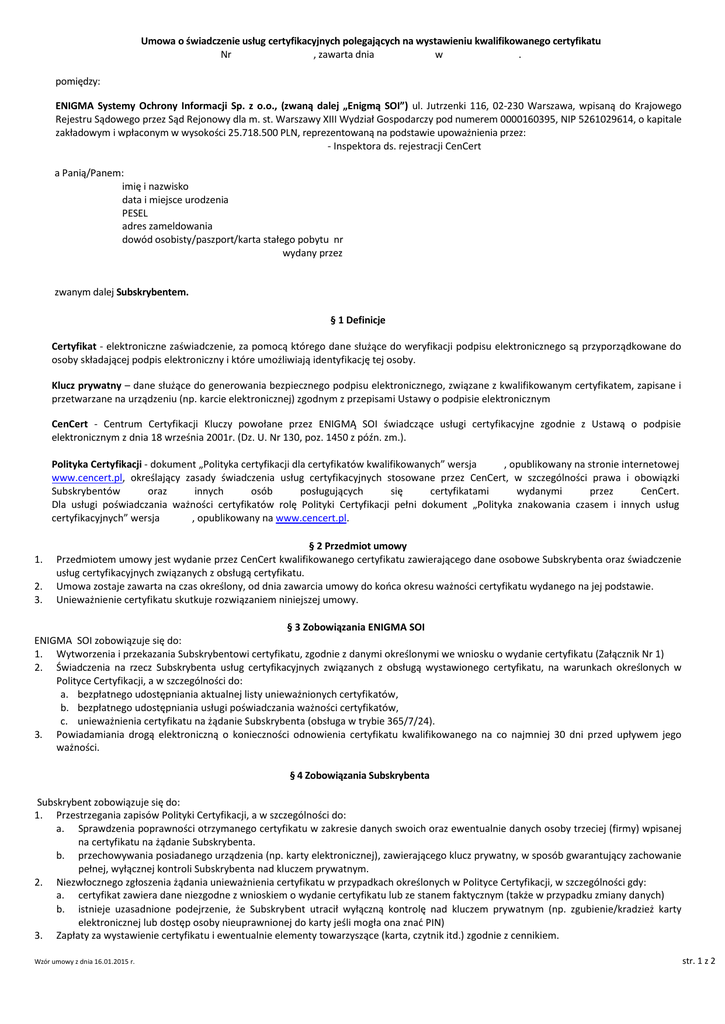 Umowa o świadczenie usług certyfikacyjnych polegających na wystawieniu kwalifikowanego certyfikatu Nr , zawarta dnia w . pomiędzy: ENIGMA Systemy Ochrony Informacji Sp. z o.o., (zwaną dalej „Enigmą SOI”) ul. Jutrzenki 116, 02-230 Warszawa, wpisaną do Krajowego Rejestru Sądowego przez Sąd Rejonowy dla m. st. Warszawy XIII Wydział Gospodarczy pod numerem 0000160395, NIP 5261029614, o kapitale zakładowym i wpłaconym w wysokości 25.718.500 PLN, reprezentowaną na podstawie upoważnienia przez: - Inspektora ds. rejestracji CenCert a Panią/Panem: imię i nazwisko data i miejsce urodzenia PESEL adres zameldowania dowód osobisty/paszport/karta stałego pobytu nr wydany przez zwanym dalej Subskrybentem. § 1 Definicje Certyfikat - elektroniczne zaświadczenie, za pomocą którego dane służące do weryfikacji podpisu elektronicznego są przyporządkowane do osoby składającej podpis elektroniczny i które umożliwiają identyfikację tej osoby. Klucz prywatny – dane służące do generowania bezpiecznego podpisu elektronicznego, związane z kwalifikowanym certyfikatem, zapisane i przetwarzane na urządzeniu (np. karcie elektronicznej) zgodnym z przepisami Ustawy o podpisie elektronicznym CenCert - Centrum Certyfikacji Kluczy powołane przez ENIGMĄ SOI świadczące usługi certyfikacyjne zgodnie z Ustawą o podpisie elektronicznym z dnia 18 września 2001r. (Dz. U. Nr 130, poz. 1450 z późn. zm.). Polityka Certyfikacji - dokument „Polityka certyfikacji dla certyfikatów kwalifikowanych” wersja , opublikowany na stronie internetowej www.cencert.pl, określający zasady świadczenia usług certyfikacyjnych stosowane przez CenCert, w szczególności prawa i obowiązki Subskrybentów oraz innych osób posługujących się certyfikatami wydanymi przez CenCert. Dla usługi poświadczania ważności certyfikatów rolę Polityki Certyfikacji pełni dokument „Polityka znakowania czasem i innych usług certyfikacyjnych” wersja , opublikowany na www.cencert.pl. 1. 2. 3. § 2 Przedmiot umowy Przedmiotem umowy jest wydanie przez CenCert kwalifikowanego certyfikatu zawierającego dane osobowe Subskrybenta oraz świadczenie usług certyfikacyjnych związanych z obsługą certyfikatu. Umowa zostaje zawarta na czas określony, od dnia zawarcia umowy do końca okresu ważności certyfikatu wydanego na jej podstawie. Unieważnienie certyfikatu skutkuje rozwiązaniem niniejszej umowy. § 3 Zobowiązania ENIGMA SOI ENIGMA SOI zobowiązuje się do: 1. Wytworzenia i przekazania Subskrybentowi certyfikatu, zgodnie z danymi określonymi we wniosku o wydanie certyfikatu (Załącznik Nr 1) 2. Świadczenia na rzecz Subskrybenta usług certyfikacyjnych związanych z obsługą wystawionego certyfikatu, na warunkach określonych w Polityce Certyfikacji, a w szczególności do: a. bezpłatnego udostępniania aktualnej listy unieważnionych certyfikatów, b. bezpłatnego udostępniania usługi poświadczania ważności certyfikatów, c. unieważnienia certyfikatu na żądanie Subskrybenta (obsługa w trybie 365/7/24). 3. Powiadamiania drogą elektroniczną o konieczności odnowienia certyfikatu kwalifikowanego na co najmniej 30 dni przed upływem jego ważności. § 4 Zobowiązania Subskrybenta Subskrybent zobowiązuje się do: 1. Przestrzegania zapisów Polityki Certyfikacji, a w szczególności do: a. Sprawdzenia poprawności otrzymanego certyfikatu w zakresie danych swoich oraz ewentualnie danych osoby trzeciej (firmy) wpisanej na certyfikatu na żądanie Subskrybenta. b. przechowywania posiadanego urządzenia (np. karty elektronicznej), zawierającego klucz prywatny, w sposób gwarantujący zachowanie pełnej, wyłącznej kontroli Subskrybenta nad kluczem prywatnym. 2. Niezwłocznego zgłoszenia żądania unieważnienia certyfikatu w przypadkach określonych w Polityce Certyfikacji, w szczególności gdy: a. certyfikat zawiera dane niezgodne z wnioskiem o wydanie certyfikatu lub ze stanem faktycznym (także w przypadku zmiany danych) b. istnieje uzasadnione podejrzenie, że Subskrybent utracił wyłączną kontrolę nad kluczem prywatnym (np. zgubienie/kradzież karty elektronicznej lub dostęp osoby nieuprawnionej do karty jeśli mogła ona znać PIN) 3. Zapłaty za wystawienie certyfikatu i ewentualnie elementy towarzyszące (karta, czytnik itd.) zgodnie z cennikiem. Wzór umowy z dnia 16.01.2015 r. str. 1 z 2 1. § 5 Dane osoby trzeciej w certyfikacie Subskrybenta Certyfikat, na wniosek Subskrybenta, może zawierać dane osoby trzeciej (może to być osoba prawna, fizyczna lub jednostka organizacyjna nieposiadająca osobowości prawnej). Osoba ta ma prawo do unieważnienia certyfikatu, na zasadach określonych Polityką Certyfikacji. § 6 Oświadczenia Subskrybenta Subskrybent oświadcza, że: 1. Zapoznał się przed podpisaniem niniejszej umowy i akceptuje Politykę Certyfikacji, zawierającą w szczególności informacje o dokładnych warunkach użycia certyfikatu, w tym o sposobie rozpatrywania skarg i wniosków, a w szczególności o istotnych warunkach użycia certyfikatu obejmujących: zakres i ograniczenia stosowania certyfikatu, skutki prawne składania podpisów elektronicznych weryfikowanych przy pomocy tego certyfikatu, informację o systemie dobrowolnej rejestracji podmiotów kwalifikowanych i ich znaczeniu. 2. Publikację przez ENIGMA SOI na stronie internetowej „www.cencert.pl” dokumentów, o których mowa wyżej, uznaje za skuteczną i wystarczającą formę doręczenia mu. 3. Wszystkie informacje podane przez niego są zgodne z prawdą i zostały podane dobrowolnie, wyraża zgodę na przetwarzanie swoich danych osobowych przez ENIGMA SOI oraz współpracujące z nią Punkty Rejestracji dla potrzeb niezbędnych do realizacji usług certyfikacyjnych określonych umową oraz został poinformowany o prawie dostępu do treści swoich danych oraz ich poprawiania, i że administratorem tych danych będzie ENIGMA SOI 4. Ponosi odpowiedzialność za szkody wynikające z podania n