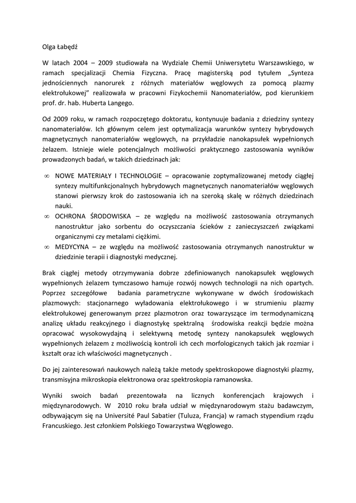 Olga Łabędź W latach 2004 – 2009 studiowała na Wydziale Chemii Uniwersytetu Warszawskiego, w ramach specjalizacji Chemia Fizyczna. Pracę magisterską pod tytułem „Synteza jednościennych nanorurek z różnych materiałów węglowych za pomocą plazmy elektrołukowej” realizowała w pracowni Fizykochemii Nanomateriałów, pod kierunkiem prof. dr. hab. Huberta Langego. Od 2009 roku, w ramach rozpoczętego doktoratu, kontynuuje badania z dziedziny syntezy nanomateriałów. Ich głównym celem jest optymalizacja warunków syntezy hybrydowych magnetycznych nanomateriałów węglowych, na przykładzie nanokapsułek wypełnionych żelazem. Istnieje wiele potencjalnych możliwości praktycznego zastosowania wyników prowadzonych badań, w takich dziedzinach jak: • • • NOWE MATERIAŁY I TECHNOLOGIE – opracowanie zoptymalizowanej metody ciągłej syntezy multifunkcjonalnych hybrydowych magnetycznych nanomateriałów węglowych stanowi pierwszy krok do zastosowania ich na szeroką skalę w różnych dziedzinach nauki. OCHRONA ŚRODOWISKA – ze względu na możliwość zastosowania otrzymanych nanostruktur jako sorbentu do oczyszczania ścieków z zanieczyszczeń związkami organicznymi czy metalami ciężkimi. MEDYCYNA – ze względu na możliwość zastosowania otrzymanych nanostruktur w dziedzinie terapii i diagnostyki medycznej. Brak ciągłej metody otrzymywania dobrze zdefiniowanych nanokapsułek węglowych wypełnionych żelazem tymczasowo hamuje rozwój nowych technologii na nich opartych. Poprzez szczegółowe badania parametryczne wykonywane w dwóch środowiskach plazmowych: stacjonarnego wyładowania elektrołukowego i w strumieniu plazmy elektrołukowej generowanym przez plazmotron oraz towarzyszące im termodynamiczną analizę układu reakcyjnego i diagnostykę spektralną środowiska reakcji będzie można opracować wysokowydajną i selektywną metodę syntezy nanokapsułek węglowych wypełnionych żelazem z możliwością kontroli ich cech morfologicznych takich jak rozmiar i kształt oraz ich właściwości magnetycznych . Do jej zainteresowań naukowych należą także metody spektroskopowe diagnostyki plazmy, transmisyjna mikroskopia elektronowa oraz spektroskopia ramanowska. Wyniki swoich badań prezentowała na licznych konferencjach krajowych i międzynarodowych. W 2010 roku brała udział w międzynarodowym stażu badawczym, odbywającym się na Université Paul Sabatier (Tuluza, Francja) w ramach stypendium rządu Francuskiego. Jest członkiem Polskiego Towarzystwa Węglowego.
