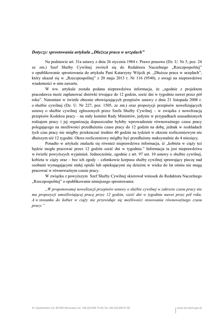 Dotyczy: sprostowania artykułu „Dłuższa praca w urzędach” Na podstawie art. 31a ustawy z dnia 26 stycznia 1984 r. Prawo prasowe (Dz. U. Nr 5, poz. 24 ze zm.) Szef Służby Cywilnej zwrócił się do Redaktora Naczelnego „Rzeczpospolitej” o opublikowanie sprostowania do artykułu Pani Katarzyny Wójcik pt. „Dłuższa praca w urzędach”, który ukazał się w „Rzeczpospolitej” z 20 maja 2013 r. Nr 116 (9540), z uwagi na nieprawdziwe wiadomości w nim zawarte. W ww. artykule została podana nieprawdziwa informacja, że „zgodnie z projektem pracodawca może zaplanować dniówki trwające do 12 godzin, sześć dni w tygodniu nawet przez pół roku”. Natomiast w świetle obecnie obowiązujących przepisów ustawy z dnia 21 listopada 2008 r. o służbie cywilnej (Dz. U. Nr 227, poz. 1505, ze zm.) oraz propozycji przepisów nowelizujących ustawę o służbie cywilnej zgłoszonych przez Szefa Służby Cywilnej – w związku z nowelizacją przepisów Kodeksu pracy – na stały komitet Rady Ministrów, jedynie w przypadkach uzasadnionych rodzajem pracy i jej organizacją dopuszczalne byłoby wprowadzenie równoważnego czasu pracy polegającego na możliwości przedłużeniu czasu pracy do 12 godzin na dobę, jednak w rozkładach tych czas pracy nie mógłby przekraczać średnio 40 godzin na tydzień w okresie rozliczeniowym nie dłuższym niż 12 tygodni. Okres rozliczeniowy mógłby być przedłużony maksymalnie do 4 miesięcy. Ponadto w artykule znalazła się również nieprawdziwa informacja, iż „kobieta w ciąży też będzie mogła pracować przez 12 godzin sześć dni w tygodniu.” Informacja ta jest nieprawdziwa w świetle powyższych wyjaśnień. Jednocześnie, zgodnie z art. 97 ust. 10 ustawy o służbie cywilnej, kobieta w ciąży oraz – bez ich zgody – członkowie korpusu służby cywilnej sprawujący pieczę nad osobami wymagającymi stałej opieki lub opiekującymi się dziećmi w wieku do lat ośmiu nie mogą pracować w równoważnym czasie pracy. W związku z powyższym Szef Służby Cywilnej skierował wniosek do Redaktora Naczelnego „Rzeczpospolitej” o opublikowanie niniejszego sprostowania: „W proponowanej nowelizacji przepisów ustawy o służbie cywilnej w zakresie czasu pracy nie ma propozycji umożliwiającej pracę przez 12 godzin, sześć dni w tygodniu nawet przez pół roku. A w stosunku do kobiet w ciąży nie przewiduje się możliwości stosowania równoważnego czasu pracy.” Al. Ujazdowskie 1/3, 00-583 Warszawa; tel. +48 (22) 694 75 66; fax +48 (22) 694 67 68 www.dsc.kprm.gov.pl