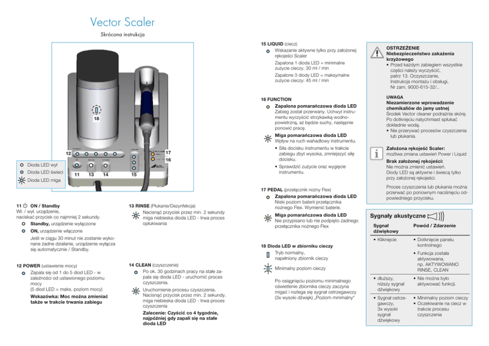 Vector Scaler Skrócona instrukcja 15Liquid (ciecz) Wskazanie aktywne tylko przy założonej rękojeści Scaler Zapalona 1 dioda LED = minimalne zużycie cieczy: 30 ml / min Zapalone 3 diody LED = maksymalne zużycie cieczy: 45 ml / min 16 Function Zapalona pomarańczowa dioda LED Zabieg został przerwany. Uchwyt instrumentu wyczyścić strzykawką wodnopowietrzną, aż będzie suchy, następnie ponowić pracę. 18 Miga pomarańczowa dioda LED Wpływ na ruch wahadłowy instrumentu. 17 12 16 Dioda LED wył Dioda LED świeci 11 13 14 •Siła docisku instrumentu w trakcie zabiegu zbyt wysoka, zmniejszyć siłę docisku. •Sprawdzić zużycie oraz wygięcie instrumentu. 15 Dioda LED miga 11 ON / Standby Wł. / wył. urządzenie, naciskać przycisk co najmniej 2 sekundy. Standby, urządzenie wyłączone 13Rinse (Płukanie/Dezynfekcja) Nacisnąć przycisk przez min. 2 sekundy miga niebieska dioda LED - trwa proces opłukiwania ON, urządzenie włączone Jeśli w ciągu 30 minut nie zostanie wykonane żadne działanie, urządzenie wyłącza się automatycznie / Standby. 12 Power (ustawienie mocy) Zapala się od 1 do 5 diod LED - w zależności od ustawionego poziomu mocy (5 diod LED = maks. poziom mocy) Wskazówka: Moc można zmieniać także w trakcie trwania zabiegu 17Pedal (przełącznik nożny Flex) Zapalona pomarańczowa dioda LED Niski poziom baterii przełącznika nożnego Flex. Wymienić baterie. Miga pomarańczowa dioda LED Nie przypisano lub nie podpięto żadnego przełącznika nożnego Flex OSTRZEŻENIE Niebezpieczeństwo zakażenia krzyżowego •Przed każdym zabiegiem wszystkie części należy wyczyścić, patrz 13. Oczyszczanie, Instrukcja montażu i obsługi, Nr zam. 9000-615-32/.. UWAGA Niezamierzone wprowadzenie chemikaliów do jamy ustnej Środek Vector cleaner podrażnia skórę. Po dotknięciu natychmiast spłukać dokładnie wodą. •Nie przerywać procesów czyszczenia lub płukania. Założona rękojeść Scaler: możliwa zmiana ustawień Power i Liquid Brak założonej rękojeści: Nie można zmienić ustawień. Diody LED są aktywne i świecą tylko przy założonej rękojeści. Proces czyszczenia lub płukania można przerwać po ponownym naciśnięciu odpowiedniego przycisku. Sygnały akustyczne Sygnał dźwiękowy Powód / Zdarzenie •Kliknięcie •Dotknięcie panelu kontrolnego 18Dioda LED w zbiorniku cieczy Tryb normalny, napełniony zbiornik cieczy 14Clean (czyszczenie) Po ok. 30 godzinach pracy na stałe zapala się dioda LED - uruchomić proces czyszczenia. Uruchomienie procesu czyszczenia. Nacisnąć przycisk przez min. 2 sekundy. miga niebieska dioda LED - trwa proces czyszczenia Zalecenie: Czyścić co 4 tygodnie, najpóźniej gdy zapali się na stałe dioda LED •Funkcja została aktywowana, np. aktywowano Rinse, Clean Minimalny poziom cieczy Po osiągnięciu poziomu minimalnego oświetlenie zbiornika cieczy zaczyna migać i rozlega się sygnał ostrzegawczy (3x wysoki dźwięk) „Poziom minimalny“ •dłuższy, niższy sygnał dźwiękowy •Nie można było aktywować funkcji. •Sygnał ostrzegawczy, 3x wysoki sygnał dźwiękowy •Minimalny poziom cieczy •Oczekiwanie na ciecz w trakcie procesu czyszczenia Rękojeści Scaler Rękojeści Scaler Demontaż Zakładanie i wymiana instrumentów 2012/02/13 Montaż DÜRR DENTAL AG Höpfigheimer Strasse 17 74321 Bietigheim-Bissingen, Germany 9000-615-33/22 *9000-615-33/22*