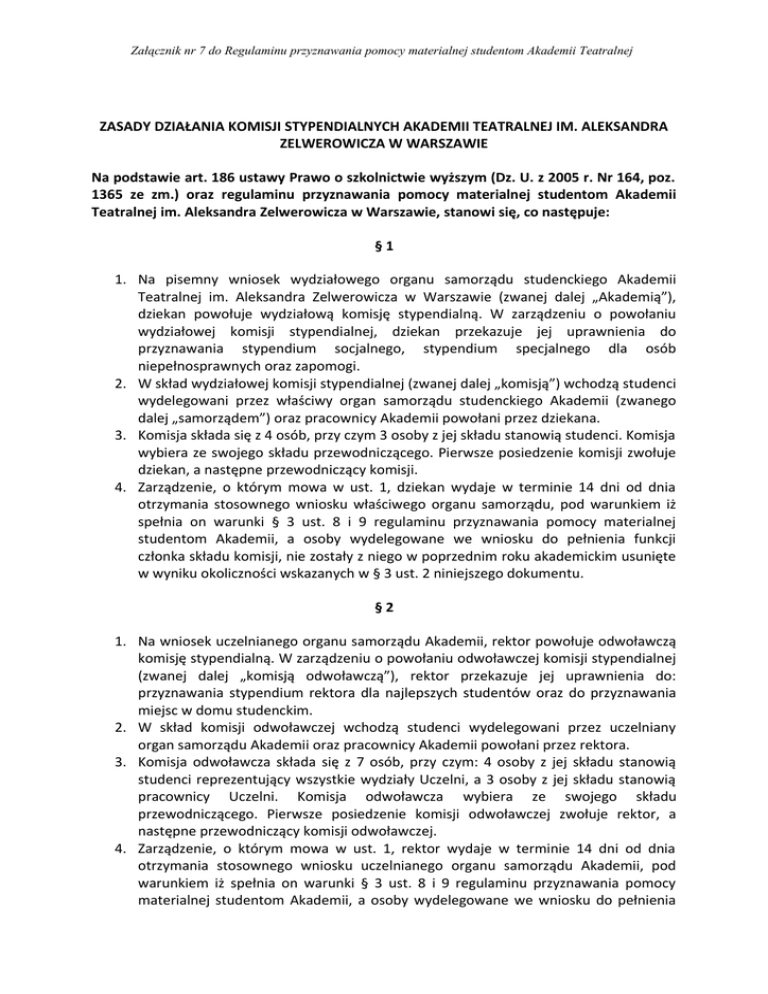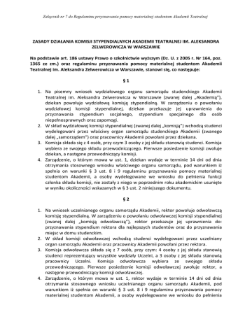 Załącznik nr 7 do Regulaminu przyznawania pomocy materialnej studentom Akademii Teatralnej ZASADY DZIAŁANIA KOMISJI STYPENDIALNYCH AKADEMII TEATRALNEJ IM. ALEKSANDRA ZELWEROWICZA W WARSZAWIE Na podstawie art. 186 ustawy Prawo o szkolnictwie wyższym (Dz. U. z 2005 r. Nr 164, poz. 1365 ze zm.) oraz regulaminu przyznawania pomocy materialnej studentom Akademii Teatralnej im. Aleksandra Zelwerowicza w Warszawie, stanowi się, co następuje: §1 1. Na pisemny wniosek wydziałowego organu samorządu studenckiego Akademii Teatralnej im. Aleksandra Zelwerowicza w Warszawie (zwanej dalej „Akademią”), dziekan powołuje wydziałową komisję stypendialną. W zarządzeniu o powołaniu wydziałowej komisji stypendialnej, dziekan przekazuje jej uprawnienia do przyznawania stypendium socjalnego, stypendium specjalnego dla osób niepełnosprawnych oraz zapomogi. 2. W skład wydziałowej komisji stypendialnej (zwanej dalej „komisją”) wchodzą studenci wydelegowani przez właściwy organ samorządu studenckiego Akademii (zwanego dalej „samorządem”) oraz pracownicy Akademii powołani przez dziekana. 3. Komisja składa się z 4 osób, przy czym 3 osoby z jej składu stanowią studenci. Komisja wybiera ze swojego składu przewodniczącego. Pierwsze posiedzenie komisji zwołuje dziekan, a następne przewodniczący komisji. 4. Zarządzenie, o którym mowa w ust. 1, dziekan wydaje w terminie 14 dni od dnia otrzymania stosownego wniosku właściwego organu samorządu, pod warunkiem iż spełnia on warunki § 3 ust. 8 i 9 regulaminu przyznawania pomocy materialnej studentom Akademii, a osoby wydelegowane we wniosku do pełnienia funkcji członka składu komisji, nie zostały z niego w poprzednim roku akademickim usunięte w wyniku okoliczności wskazanych w § 3 ust. 2 niniejszego dokumentu. §2 1. Na wniosek uczelnianego organu samorządu Akademii, rektor powołuje odwoławczą komisję stypendialną. W zarządzeniu o powołaniu odwoławczej komisji stypendialnej (zwanej dalej „komisją odwoławczą”), rektor przekazuje jej uprawnienia do: przyznawania stypendium rektora dla najlepszych studentów oraz do przyznawania miejsc w domu studenckim. 2. W skład komisji odwoławczej wchodzą studenci wydelegowani przez uczelniany organ samorządu Akademii oraz pracownicy Akademii powołani przez rektora. 3. Komisja odwoławcza składa się z 7 osób, przy czym: 4 osoby z jej składu stanowią studenci reprezentujący wszystkie wydziały Uczelni, a 3 osoby z jej składu stanowią pracownicy Uczelni. Komisja odwoławcza wybiera ze swojego składu przewodniczącego. Pierwsze posiedzenie komisji odwoławczej zwołuje rektor, a następne przewodniczący komisji odwoławczej. 4. Zarządzenie, o którym mowa w ust. 1, rektor wydaje w terminie 14 dni od dnia otrzymania stosownego wniosku uczelnianego organu samorządu Akademii, pod warunkiem iż spełnia on warunki § 3 ust. 8 i 9 regulaminu przyznawania pomocy materialnej studentom Akademii, a osoby wydelegowane we wniosku do pełnienia funkcji członka składu komisji odwoławczej, nie zostały z niego w poprzednim roku akademickim usunięte w wyniku okoliczności wskazanych w § 3 ust. 2 niniejszego dokumentu. §3 1. 2. Składy komisji oraz komisji odwoławczej są powoływane na rok akademicki. Kadencja składów komisji trwa od momentu ich powołania zgodnie z § 1 oraz § 2 niniejszego dokumentu do dnia 31 października. Pełnienie funkcji członka komisji lub komisji odwoławczej ustaje w czasie trwania kadencji, w przypadku gdy: 1) ustał stosunek pracy wiążący członka komisji lub komisji odwoławczej z Akademią; 2) student, będący członkiem komisji lub komisji odwoławczej, został skreślony z listy studentów; 3) na studenta, będącego członkiem komisji lub komisji odwoławczej, w wyniku prawomocnego orzeczenia komisji dyscyplinarnej, została nałożona kara zawieszenia w prawach studenta w całości lub w części uzasadniającej odsunięcie od pełnienia funkcji w organach Akademii lub samorządu; 4) członek komisji lub komisji odwoławczej zrezygnował z pełnienia funkcji; 5) członek komisji lub komisji odwoławczej nie stawił się na co najmniej 3 posiedzeniach komisji lub komisji odwoławczej w ciągu danego roku akademickiego (kadencji); 6) członek komisji lub komisji odwoławczej zmarł, 7) odpowiedni organ Akademii odwoła członka komisji lub komisji odwoławczej w trybie analogicznym do trybu jego powołania. 3. W przypadkach określonych w ust. 2, uzupełnienie składu komisji lub komisji odwoławczej następuje: 1) 2) 4. w przypadku konieczności uzupełnienia składu komisji lub komisji odwoławczej spośród studentów Akademii – poprzez wydelegowanie odpowiednio przez uczelniany organ samorządu osoby do pełnienia funkcji członka składu komisji lub komisji odwoławczej w pisemnym wniosku skierowanym odpowiednio do dziekana lub rektora Akademii, w przypadku konieczności uzupełnienia składu komisji lub komisji odwoławczej spośród pracowników Akademii – poprzez powołanie odpowiednio przez dziekana lub rektora osoby do pełnienia funkcji członka składu komisji lub komisji odwoławczej. W przypadku wskazanym w ust. 3 pkt 1), odpowiednio dziekan lub rektor wydaje zarządzenie o powołaniu członka komisji lub komisji odwoławczej, z uwzględnieniem odpowiednio § 1 ust. 4 lub § 2 ust. 4 niniejszego dokumentu. Z dniem wydania zarządzenia członek komisji lub komisji odwoławczej zaczyna pełnić swoją funkcję. §4 1. W ramach nadzoru nad działalnością komisji oraz komisji odwoławczej, odpowiednio dziekan lub rektor mogą: 1) uchylić decyzję komisji lub komisji odwoławczej niezgodną z regulaminem przyznawania pomocy materialnej studentom Akademii lub z ustawą Prawo o szkolnictwie wyższym; 2) zwołać nadzwyczajne posiedzenie komisji lub komisji odwoławczej w terminie 7 dni; 3) zawiesić działanie komisji lub komisji odwoławczej w przypadku: a) niewywiązywania się przez nie z obowiązk