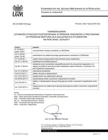 UNIWERSYTET IM. ADAMA MICKIEWICZA W POZNANIU Prorektor ds. studenckich Poznań, dnia 7 lipca 2016 roku DN 33-59/B/15/16(og) HARMONOGRAM CZYNNOŚCI PODCZAS POSTĘPOWANIA W SPRAWIE WNIOSKÓW O PRZYZNANIE STYPENDIUM REKTORA DLA NAJLEPSZYCH STUDENTÓW NA ROK AKAD. 2016/2017 termin zadanie 8.10.2016 r. godz. 00:01 uruchomienie modułu wniosków w USOSweb 20.10.2016 r. godz. 23:59 zamknięcie tury elektronicznego generowania wniosków w USOSweb 21.10.2016 r. ostatni dzień przyjmowania dokumentów przez dziekanaty do 21.11.2016 r. publikacja list kwalifikacyjnych do 26.11.2016 r. składanie przez studentów zakwalifikowanych do przyznania stypendium na więcej niż jednym kierunku/uczelni deklaracji wyboru kierunku, na którym ma być wypłacane stypendium do 15.12.2016 r. wykonanie przelewów do 6.01.2017 r. odbiór decyzji w dziekanatach do 13.01.2017 r. dostarczenie nie odebranych decyzji do 20.02.2017 r. opracowanie próśb o ponowne rozpatrzenie wniosku do 6.03.2017 r. odbiór w dziekanatach decyzji dotyczących próśb o ponowne rozpatrzenie wniosku do 13.03.2017 r. dostarczenie nie odebranych decyzji dotyczących próśb o ponowne rozpatrzenie wniosku Skróty: CI – Centrum Zarządzania Infrastrukturą i Projektami Informatycznymi RSS – Rady Samorządu Studentów Wydziałów i jednostek zamiejscowych PSS – Parlament Samorządu Studentów KE I st. – Komisje Ekonomiczne I stopnia UKE – Uczelniana Komisja Ekonomiczna DPiS – Dział Płac i Stypendiów PROREKTOR prof. dr hab. Zbigniew Pilarczyk ul. H. Wieniawskiego 1,Collegium Minus, 61-712 Poznań tel. +48 61 829 43 77, fax +48 61 829 43 74 [email protected] www.amu.edu.pl DN 33-59/B/15/16(og) strona 1 z 1