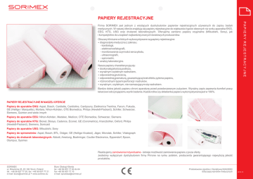 PAPIERY REJESTRACYJNE Obszary kliniczne w których wykorzystywane są papiery rejestracyjne: § diagnostyka medyczna z zakresu: - kardiologii, - elektroencefalografii, - monitorowania czynności serca płodu, - ultrasonografii, - spirometrii, § analizy laboratoryjne. Nasze papiery charakteryzują się: § doskonałą jakością podłoża, § wyraźnym czytelnym nadrukiem, § odpowiednią grubością, § odpowiednią gramaturą, gwarantującą brak efektu pylenia papieru, § różnorodnymi typami perforacji i nadruków, § wyraźnym, czytelnym, nie rozmazującym się nadrukiem. PA P I E R Y R E J E S T R A C Y J N E Firma SORIMEX jest jednym z wiodących dystrybutorów papierów rejestracyjnych używanych do zapisu badań medycznych. W naszej ofercie znajdują się papiery rejestracyjne do większości typów obecnych na rynku aparatów EKG, EEG, KTG, USG oraz drukarek laboratoryjnych. Oferujemy zarówno papiery oryginalne (Mitsubishi, Sony), jak i kompatybilne do urządzeń najbardziej znanych światowych producentów. Bardzo dobra jakość papieru chroni aparaturę przed przedwczesnym zużyciem. Wyraźny zapis zapewnia komfort pracy lekarzowi odczytującemu wynik badania. Każda rolka czy składanka papieru wykorzystywana jest w 100%. PAPIERY REJESTRACYJNE W NASZEJ OFERCIE Papiery do aparatów EKG: Aspel, Bosch, Cardiette, Cardioline, Cardysuny, Elettronica Trentina, Farum, Fukuda, GE (Hellige i Marquette), Mortara, Nihon-Kohden, OTE Biomedica, Philips (Hewlett-Packard), Schiller, Schwarzer, Siemens, Quinton and wiele innych Papiery do aparatów EEG: Nihon-Kohden, Medelec, Medicor, OTE Biomedica, Schwarzer, Siemens Papiery do aparatów KTG: Bionet, Biosys, Cadence, Econet, GE (Corometrics), Kranzbühler, Oxford, Philips (Hewlett-Packard), Siemens, Sonicaid Papiery do aparatów USG: Mitsubishi, Sony Papiery do spirometrów: Aspel, Bosch, BTL, Dräger, GE (Hellige-Vicatest), Jäger, Microlab, Schiller, Vitalograph Papiery do drukarek laboratoryjnych: Abbott, Amelung, Boehringer, Coulter Electronics, Eppendorf, Epson, Olympus, Sysmex Realizujemy zamówienia indywidualne - istnieje możliwość zamówienia papieru z poza oferty. Jesteśmy wyłącznym dystrybutorem firmy Pirrone na rynku polskim, producenta gwarantującego najwyższą jakość produktów. SORIMEX ul. Równinna 25, 87-100 Toruń, Poland tel.: +48 56 657 77 20, fax: +48 56 657 77 21 e-mail: [email protected] w www.sorimex.eu Biuro Obsługi Klienta tel. +48 56 657 77 00 do 04 fax +48 56 657 77 10 e-mail: [email protected] Produkowane zgodnie z Dyrektywą 93/42/EEC dotyczącą wyrobów medycznych 2013-10