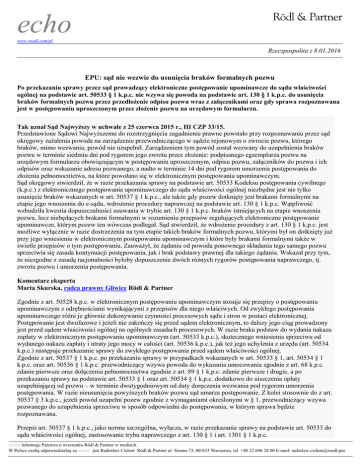 echo www.roedl.com/pl Rzeczpospolita z 8.01.2016 EPU: sąd nie wezwie do usunięcia braków formalnych pozwu Po przekazaniu sprawy przez sąd prowadzący elektroniczne postępowanie upominawcze do sądu właściwości ogólnej na podstawie art. 50533 § 1 k.p.c. nie wzywa się powoda na podstawie art. 130 § 1 k.p.c. do usunięcia braków formalnych pozwu przez przedłożenie odpisu pozwu wraz z załącznikami oraz gdy sprawa rozpoznawana jest w postępowaniu uproszczonym przez złożenie pozwu na urzędowym formularzu. Tak uznał Sąd Najwyższy w uchwale z 25 czerwca 2015 r., III CZP 33/15. Przedstawione Sądowi Najwyższemu do rozstrzygnięcia zagadnienie prawne powstało przy rozpoznawaniu przez sąd okręgowy zażalenia powoda na zarządzenie przewodniczącego w sądzie rejonowym o zwrocie pozwu, którego braków, mimo wezwania, powód nie uzupełnił. Zarządzeniem tym powód został wezwany do uzupełnienia braków pozwu w terminie siedmiu dni pod rygorem jego zwrotu przez złożenie: podpisanego egzemplarza pozwu na urzędowym formularzu obowiązującym w postępowaniu uproszczonym, odpisu pozwu, załączników do pozwu i ich odpisów oraz wskazanie adresu pozwanego, a nadto w terminie 14 dni pod rygorem umorzenia postępowania do złożenia pełnomocnictwa, na które powołano się w elektronicznym postępowaniu upominawczym. Sąd okręgowy stwierdził, że w razie przekazania sprawy na podstawie art. 50533 Kodeksu postępowania cywilnego (k.p.c.) z elektronicznego postępowania upominawczego do sądu właściwości ogólnej niezbędne jest nie tylko usunięcie braków wskazanych w art. 50537 § 1 k.p.c., ale także gdy pozew dotknięty jest brakami formalnymi na etapie jego wnoszenia do e-sądu, wdrożenie procedury naprawczej na podstawie art. 130 § 1 k.p.c. Wątpliwość wzbudziła kwestia dopuszczalności usuwania w trybie art. 130 § 1 k.p.c. braków istniejących na etapie wnoszenia pozwu, lecz niebędących brakami formalnymi w rozumieniu przepisów regulujących elektroniczne postępowanie upominawcze, którym pozew ten wówczas podlegał. Sąd stwierdził, że wdrożenie procedury z art. 130 § 1 k.p.c. jest możliwe wyłącznie w razie dostrzeżenia na tym etapie takich braków formalnych pozwu, którymi był on dotknięty już przy jego wniesieniu w elektronicznym postępowaniu upominawczym i które były brakami formalnymi także w świetle przepisów o tym postępowaniu. Zauważył, że żądaniu od powoda ponownego składania tego samego pozwu sprzeciwia się zasada kontynuacji postępowania, jak i brak podstawy prawnej dla takiego żądania. Wskazał przy tym, że niezgodne z zasadą racjonalności byłoby dopuszczenie dwóch różnych rygorów postępowania naprawczego, tj. zwrotu pozwu i umorzenia postępowania. Komentarz eksperta Marta Skurska, radca prawny Gliwice Rödl & Partner Zgodnie z art. 50528 k.p.c. w elektronicznym postępowaniu upominawczym stosuje się przepisy o postępowaniu upominawczym z odrębnościami wynikającymi z przepisów dla niego właściwych. Od zwykłego postępowania upominawczego różni je głównie dokonywanie czynności procesowych sądu i stron w postaci elektronicznej. Postępowanie jest dwufazowe i jeżeli nie zakończy się przed sądem elektronicznym, to dalszy jego ciąg prowadzony jest przed sądem właściwości ogólnej na ogólnych zasadach procesowych. W razie braku podstaw do wydania nakazu zapłaty w elektronicznym postępowaniu upominawczym (art. 50533 k.p.c.), skutecznego wniesienia sprzeciwu od wydanego nakazu zapłaty i utraty jego mocy w całości (art. 50536 k.p.c.), jak też jego uchylenia z urzędu (art. 50534 k.p.c.) następuje przekazanie sprawy do zwykłego postępowania przed sądem właściwości ogólnej. Zgodnie z art. 50537 § 1 k.p.c. po przekazaniu sprawy w przypadkach wskazanych w art. 50533 § 1, art. 50534 § 1 k.p.c. oraz art. 50536 § 1 k.p.c. przewodniczący wzywa powoda do wykazania umocowania zgodnie z art. 68 k.p.c. zdanie pierwsze oraz dołączenia pełnomocnictwa zgodnie z art. 89 § 1 k.p.c. zdanie pierwsze i drugie, a po przekazaniu sprawy na podstawie art. 50533 § 1 oraz art. 50534 § 1 k.p.c. dodatkowo do uiszczenia opłaty uzupełniającej od pozwu – w terminie dwutygodniowym od daty doręczenia wezwania pod rygorem umorzenia postępowania. W razie nieusunięcia powyższych braków pozwu sąd umarza postępowanie. Z kolei stosownie do z art. 50537 § 3 k.p.c., jeżeli powód uzupełni pozew zgodnie z wymaganiami określonymi w § 1, przewodniczący wzywa pozwanego do uzupełnienia sprzeciwu w sposób odpowiedni do postępowania, w którym sprawa będzie rozpoznawana. Przepis art. 50537 § 1 k.p.c., jako norma szczególna, wyłącza, w razie przekazania sprawy na podstawie art. 50533 do sądu właściwości ogólnej, zastosowanie trybu naprawczego z art. 130 § 1 i art. 1301 § 1 k.p.c. echo informuje Państwa o wizerunku Rödl & Partner w mediach. W Polsce osobą odpowiedzialną za echo jest Radosław Cichoń Rödl & Partner ul. Sienna 73, 00-833 Warszawa, tel. +48 22 696 28 00 E-mail: [email protected] Zwrot pozwu na podstawie art. 130 k.p.c., jak i umorzenie postępowania na podstawie art. 50537 k.p.c. są wprawdzie następstwem nieuzupełnienia braków pozwu, jednak celem tego uzupełnienia jest w pierwszym przypadku nadanie sprawie biegu, co przesądza o skuteczności prawnej wniesionego pozwu, w drugim zaś – kontynuacja postępowania przed sądem właściwym według właściwości ogólnej, podczas gdy pozew wywołał już skutki prawne związane z jego wniesieniem. Ustawa procesowa nie przewiduje mechanizmu uzupełniania braków pozwu w postaci nadesłania pozwu w formie papierowej. Na gruncie obowiązujących przepisów nie ma podstaw do żądania, aby strona składała pozew lub jego odpis w sytuacji, gdy dokonała już takiej czynności przy wykorzystaniu systemu teleinformatycznego. Wymagania pozwu w elektronicznym postępowaniu upominawczym określa art. 50532 k.p.