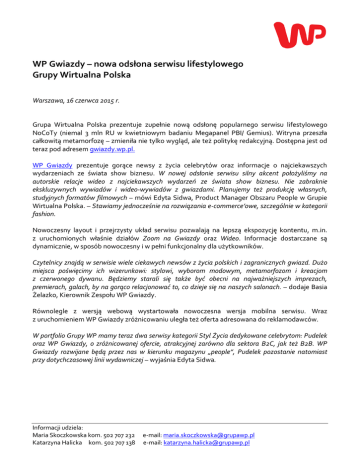 WP Gwiazdy – nowa odsłona serwisu lifestylowego Grupy Wirtualna Polska Warszawa, 16 czerwca 2015 r. Grupa Wirtualna Polska prezentuje zupełnie nową odsłonę popularnego serwisu lifestylowego NoCoTy (niemal 3 mln RU w kwietniowym badaniu Megapanel PBI/ Gemius). Witryna przeszła całkowitą metamorfozę – zmieniła nie tylko wygląd, ale też politykę redakcyjną. Dostępna jest od teraz pod adresem gwiazdy.wp.pl. WP Gwiazdy prezentuje gorące newsy z życia celebrytów oraz informacje o najciekawszych wydarzeniach ze świata show biznesu. W nowej odsłonie serwisu silny akcent położyliśmy na autorskie relacje wideo z najciekawszych wydarzeń ze świata show biznesu. Nie zabraknie ekskluzywnych wywiadów i wideo-wywiadów z gwiazdami. Planujemy też produkcję własnych, studyjnych formatów filmowych – mówi Edyta Sidwa, Product Manager Obszaru People w Grupie Wirtualna Polska. – Stawiamy jednocześnie na rozwiązania e-commerce’owe, szczególnie w kategorii fashion. Nowoczesny layout i przejrzysty układ serwisu pozwalają na lepszą ekspozycję kontentu, m.in. z uruchomionych właśnie działów Zoom na Gwiazdy oraz Wideo. Informacje dostarczane są dynamicznie, w sposób nowoczesny i w pełni funkcjonalny dla użytkowników. Czytelnicy znajdą w serwisie wiele ciekawych newsów z życia polskich i zagranicznych gwiazd. Dużo miejsca poświęcimy ich wizerunkowi: stylowi, wyborom modowym, metamorfozom i kreacjom z czerwonego dywanu. Będziemy starali się także być obecni na najważniejszych imprezach, premierach, galach, by na gorąco relacjonować to, co dzieje się na naszych salonach. – dodaje Basia Żelazko, Kierownik Zespołu WP Gwiazdy. Równolegle z wersją webową wystartowała nowoczesna wersja mobilna serwisu. Wraz z uruchomieniem WP Gwiazdy zróżnicowaniu uległa też oferta adresowana do reklamodawców. W portfolio Grupy WP mamy teraz dwa serwisy kategorii Styl Życia dedykowane celebrytom: Pudelek oraz WP Gwiazdy, o zróżnicowanej ofercie, atrakcyjnej zarówno dla sektora B2C, jak też B2B. WP Gwiazdy rozwijane będą przez nas w kierunku magazynu „people”, Pudelek pozostanie natomiast przy dotychczasowej linii wydawniczej – wyjaśnia Edyta Sidwa. Informacji udziela: Maria Skoczkowska kom. 502 707 232 Katarzyna Halicka kom. 502 707 138 e-mail: [email protected] e-mail: [email protected]
