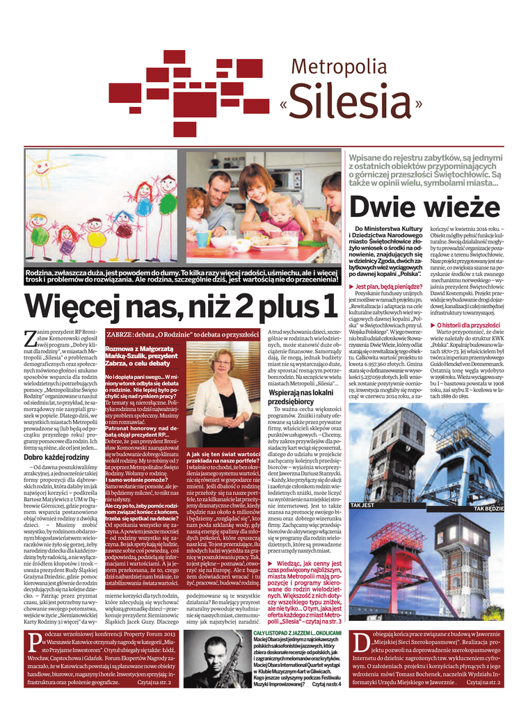 Wpisane do rejestru zabytków,są jednymi z ostatnich obiektów przypominających o górniczej przeszłości Świętochłowic.Są także w opinii wielu,symbolami miasta... Dwie wieże Rodzina,zwłaszcza duża,jest powodem do dumy.To kilka razy więcej radości,uśmiechu,ale i więcej trosk i problemów do rozwiązania. Ale rodzina,szczególnie dziś, jest wartością nie do przecenienia! Więcej nas,niż 2 plus 1 Z anim prezydent RP Bronisław Komorowski ogłosił swój program „Dobry klimatdlarodziny”,wmiastachMetropolii „Silesia” o problemach demograficznych oraz społecznychmówionogłośnoi szukano sposobów wsparcia dla rodzin wielodzietnychipotrzebujących pomocy.„MetropolitalneŚwięto Rodziny”organizowaneunasjuż odsiedmiulat,toprzykład,żesamorządowcy nie zasypiali gruszek w popiele. Dlatego dziś, we wszystkich miastach Metropolii prowadzone są (lub będą od początku przyszłego roku) programypomocowedlarodzin.Ich formysąróżne,aleceljestjeden... Dobro każdej rodziny – Od dawna poszukiwaliśmy atrakcyjnej,ajednocześnietakiej formy propozycji dla dąbrowskichrodzin,któradałabyimjak najwięcej korzyści – podkreśla Bartosz Matylewicz z UM w Dąbrowie Górniczej, gdzie programem wsparcia postanowiono objąć również rodziny z dwójką dzieci. – Musimy zrobić wszystko,byrodzinomobdarzonym błogosławieństwem wieloraczków nie żyło się gorzej, żeby narodzinydzieckadlakażdejrodzinybyłyradością,aniewyłącznie źródłem kłopotów i trosk – uważa prezydent Rudy Śląskiej Grażyna Dziedzic, gdzie pomoc kierowanajestgłówniedorodzin decydującychsięnakolejnedziecko. – Patrząc przez pryzmat czasu, jakijestpotrzebnynawychowanie swojego potomstwa, wejściewżycie„Siemianowickiej Karty Rodziny 3 i więcej” da wy- P ZABRZE:debata„ORodzinie” todebata oprzyszłości Rozmowa z Małgorzatą Mańką-Szulik, prezydent Zabrza, o celu debaty No idopięła pani swego...W minionywtorekodbyłasię debata o rodzinie. Nie lepiej było pochylić się nad rynkiem pracy? Wspierają nas lokalni przedsiębiorcy Te tematy są nierozłączne.Politykarodzinna todziśnajważniejszy problem społeczny. Musimy onimrozmawiać. Patronat honorowy nad debatą objął prezydent RP... Dobrze, że pan prezydent Bronisław Komorowski zaangażował sięwbudowaniedobregoklimatu wokół rodziny. My to robimy od7 latpoprzezMetropolitalneŚwięto Rodziny.Wołamyo rodzinę. A jak się ten świat wartości przekłada na nasze portfele? Od spotkania wszystko się zaczyna.Apowiemjeszczemocniej – od rodziny wszystko się zaczyna.Bojakspotykająsięludzie, zawsze sobie coś powiedzą, coś podpowiedzą,podzieląsię informacjami i wartościami. A ja jestem przekonana, że to, czego dziś najbardziej nam brakuje, to ustabilizowania światawartości. Iwłaśnieotochodzi,żebezokreśleniajasnegosystemuwartości, nicsięrównież wgospodarce nie zmieni. Jeśli dbałość o rodzinę nie przełoży się na nasze portfele,tozakilkanaścielatprzeżyjemydramatycznechwile,kiedy ubędzie nas około 6 milionów i będziemy „rozglądać się”, kto nam poda szklankę wody, gdy naszą energię spalimy dla młodych pokoleń, które opuszczą naszkraj.Tojestprzerażające,ilu młodych ludzi wyjeżdża za granicęwposzukiwaniupracy.Tak, tojestpiękne– poznawać,otworzyć się na Europę. Ale z bagażem doświadczeń wracać i tu żyć,pracować,budowaćrodzinę. mierne korzyści dla tych rodzin, które zdecydują się wychować większągromadkędzieci–przekonuje prezydent Siemianowic Śląskich Jacek Guzy. Dlaczego podejmowane są te wszystkie działania? Bo malejący przyrost naturalny powoduje wyludnianiesięnaszychmiast,czemumusimy jak najszybciej zaradzić. I samo wołanie pomoże? Samowołanieniepomoże,ale jeśli będziemy milczeć, to nikt nas nieusłyszy. Aleczypoto,żebypomócrodzinom związać koniec z końcem, trzeba sięspotkaćnadebacie? odczas wrześniowej konferencji Property Forum 2013 wWarszawieKatowiceotrzymałynagrodęwkategorii„MiastoPrzyjazneInwestorom”.Otytułubiegałysiętakże: Łódź, Wrocław, Częstochowa i Gdańsk. Forum Ekspertów Nagrody zaznaczało,żewKatowicachpowstająisąplanowanenoweobiekty handlowe,biurowce,magazynyihotele.Inwestycjomsprzyjają: infrastrukturaoraz położeniegeograficze. Czytajna str. 2 Atrudwychowaniadzieci,szczególnie w rodzinach wielodzietnych, może stanowić duże obciążenie finansowe. Samorządy dają, ile mogą, jednak budżety miast nie są wystarczająco duże, aby sprostać rosnącym potrzebomrodzin.Naszczęściewwielu miastach Metropolii „Silesia”... To ważna cecha większości programów. Zniżki i rabaty oferowane są także przez prywatne firmy, właścicieli sklepów oraz punktówusługowych.–Chcemy, żeby zakres przywilejów dla posiadaczykartwciążsięposzerzał, dlatego do udziału w projekcie zachęcamy kolejnych przedsiębiorców – wyjaśnia wiceprezydentJaworznaDariuszStarzycki. –Każdy,ktoprzyłączysiędoakcji izaoferuje członkom rodzin wielodzietnych zniżki, może liczyć nawyróżnienienamiejskiejstronie internetowej. Jest to także szansa na promocję swojego biznesu oraz dobrego wizerunku firmy. Zachęcamywięcprzedsiębiorcówdoaktywnegowłączenia się w programy dla rodzin wielodzietnych, które są prowadzone przezurzędynaszychmiast. Do Ministerstwa Kultury i Dziedzictwa Narodowego miasto Świętochłowice złożyło wniosek o środki na odnowienie, znajdujących się wdzielnicyZgoda,dwóchzabytkowychwieżwyciągowych po dawnej kopalni „Polska”. b Jest plan, będą pieniądze? Pozyskanie funduszy unijnych jestmożliwewramachprojektupn. „Rewitalizacja i adaptacja na cele kulturalnezabytkowychwieżwyciągowych dawnej kopalni „Polska” w Świętochłowicach przy ul. WojskaPolskiego”.WjegotworzeniubraliudziałczłonkowieStowarzyszenia DwieWieże,którzyodlat starająsięorewitalizacjętegoobiektu. Całkowita wartość projektu to kwota 6.957.360 złotych. Gmina starasi