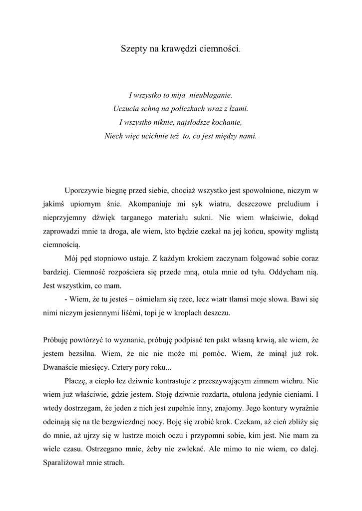 Szepty na krawędzi ciemności. I wszystko to mija nieubłaganie. Uczucia schną na policzkach wraz z łzami. I wszystko niknie, najsłodsze kochanie, Niech więc ucichnie też to, co jest między nami. Uporczywie biegnę przed siebie, chociaż wszystko jest spowolnione, niczym w jakimś upiornym śnie. Akompaniuje mi syk wiatru, deszczowe preludium i nieprzyjemny dźwięk targanego materiału sukni. Nie wiem właściwie, dokąd zaprowadzi mnie ta droga, ale wiem, kto będzie czekał na jej końcu, spowity mglistą ciemnością. Mój pęd stopniowo ustaje. Z każdym krokiem zaczynam folgować sobie coraz bardziej. Ciemność rozpościera się przede mną, otula mnie od tyłu. Oddycham nią. Jest wszystkim, co mam. - Wiem, że tu jesteś – ośmielam się rzec, lecz wiatr tłamsi moje słowa. Bawi się nimi niczym jesiennymi liśćmi, topi je w kroplach deszczu. Próbuję powtórzyć to wyznanie, próbuję podpisać ten pakt własną krwią, ale wiem, że jestem bezsilna. Wiem, że nic nie może mi pomóc. Wiem, że minął już rok. Dwanaście miesięcy. Cztery pory roku... Płaczę, a ciepło łez dziwnie kontrastuje z przeszywającym zimnem wichru. Nie wiem już właściwie, gdzie jestem. Stoję dziwnie rozdarta, otulona jedynie cieniami. I wtedy dostrzegam, że jeden z nich jest zupełnie inny, znajomy. Jego kontury wyraźnie odcinają się na tle bezgwiezdnej nocy. Boję się zrobić krok. Czekam, aż cień zbliży się do mnie, aż ujrzy się w lustrze moich oczu i przypomni sobie, kim jest. Nie mam za wiele czasu. Ostrzegano mnie, żeby nie zwlekać. Ale mimo to nie wiem, co dalej. Sparaliżował mnie strach. Wskazówki zegara bezustannie tykają, żywiąc się jedyną bronią, jaka może pokonać moją determinację. Czasem. - Proszę cię, odezwij się – mówię. W moim głosie rozbrzmiewa dziecięca nuta. Mieszanina lęku, melancholii i zmęczenia. – Nie boję się ciebie. Niczego nie jestem w stanie się przestraszyć. Już nie. - Powinnaś. Strach jest dobry. Oznacza, że ciągle jeszcze mamy coś do stracenia – rozlega się znajomy głos. Podnoszę niepewnie wzrok i widzę ten sam cudowny obraz, dla którego zaprzedałam duszę samemu diabłu. Niemal czuję, jak serce przestaje bić w mojej piersi i choć słyszę jego miarowe uderzanie nie jestem pewna, czy jest ono rzeczywiste, czy jest tylko echem. - Nie mam już nic do stracenia – odpowiadam pewnie, wyciągając przed siebie dłoń. Ze zgrozą odkrywam, że choć go widzę, nie mogę poczuć. - Ale ja mam. Ciebie. I dlatego nie możesz być tu ani chwili dłużej. W głowie rozlega mi się niemalże zapomniana już melodia słów, których nigdy nie chciałam pamiętać. Niech zgasną płomienie, ucichnie muzyka, Niech wszystko się w popiół obróci. Niech zamilknie zegar, co ciągle tyka, Nim cała prawda echem powróci. - Sam mówiłeś, że... – zaczynam, chociaż czuję, że przegrałam. Zawsze przegrywam. Nie sposób zwyciężyć z przeznaczeniem. - Wziąłem te słowa ze sobą, odchodząc. Ty zostałaś. Spróbuj chociaż pobyć tu chwilę. - Nie zostawiaj mnie. - Wrócę. Nie wiem kiedy i nie wiem, jak mnie rozpoznasz. Ale wrócę. Przecież zawsze wracam. Chociaż słyszę prawdę, odbieram ją jako kłamstwo. Tak rozpaczliwie starałam się go odnaleźć. Starałam się wznieść w przestworza za pomocą jego skrzydeł. Oddychać jego zapachem. A tymczasem mój dotyk jest pozbawiony czucia, moje serce ciche i dziwnie spokojne. Choć dusza odłącza się od niego, choć płonie błękitnym ogniem, to ciało jest zimne i nieruchome. Głos rozbrzmiewa uczuciami, choć słowa są puste. - Skąd pewność, że uda ci się przekroczyć granicę? – zadaję ostatnie pytanie, nim moja nadzieja spopieli się ostatecznie. - Miłość... miłość nie ma granic – słyszę swoją odpowiedź. Choć słowa są równie niematerialne, jak moje uczucia, próbuję się ich chwycić, rozpłynąć się w nich, skosztować ich goryczy. Skupiona na tym, by nie stracić obietnicy, tracę tego, który ją złożył. Stawiam krok przed siebie, próbując go dogonić. Ale moja stopa zawisa w powietrzu, stoję na krawędzi. Rozpaczliwie usiłuję nie spaść, pamiętając, że i ja jestem mu coś winna. Gdy wydaje mi się, że nie ma ratunku, gdy zamykam oczy, coś delikatnie, acz stanowczo mnie odpycha. Jestem słaba. Ląduję na chłodnej ziemi, zbyt odrętwiała, by poczuć rozpacz. Deszcz zespala mnie z lodowatą powierzchnią. Nie wiem już, gdzie jestem. Myśli plączą się. Każda ma inną barwę, tworzą mroczny witraż moich największych lęków. A potem otwieram oczy. Oślepia mnie jaskrawy blask rodzimej gwiazdy. Cienie nie mogą ujrzeć siebie w lustrze słońca. Niech cię nie zmyli słodycz tego bólu, Bo on uskrzydla, lecz skrzydłami z piekieł. Miłość nie ma granic, tak gwiazdy rzeczą, królu. Lecz nikt nam nie powie, czy tak właśnie jest lepiej.