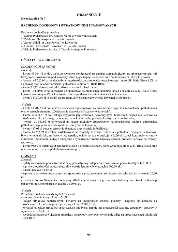 OBJAŚNIENIE Do załącznika Nr 7 RACHUNEK DOCHODÓW I WYDATKÓW NIMI FINANSOWANYCH Rachunek dochodów prowadzą : 1/ Szkoła Podstawowa im. Juliusza Verne’a w Białych Błotach 2/ Publiczne Gimnazjum w Białych Błotach 3/ Zespół Szkół im. Jana Pawła II w Łochowie 4/ Gminne Przedszkole ,,Wróżka ” w Białych Błotach 5/ Szkoła Podstawowa im. Ks. J. Twardowskiego w Przyłękach OŚWIATA I WYCHOWANIE SZKOŁY PODSTAWOWE Dochody - kwota 45 014,85 zł dot. wpłat za wynajem pomieszczeń na gabinet stomatologiczny, sal gimnastycznych, sal lekcyjnych, powierzchni pod automaty sprzedające napoje i słodycze oraz pomieszczeń na sklepiki szkolne, - kwota 62 720,00 zł to dochody z odpłatności za zimowiska organizowane przez SP Białe Błota i ZS w Łochowie oraz za obóz narciarski, półkolonie letnie w SP Białe Błota, - kwota 11,72 zł to odsetki od środków na rachunku bankowym, - kwota 10 670,00 zł to darowizna od sponsorów na organizacje konkursu kolęd i pastorałek w SP Białe Błota, konkurs szachowy w ZS w Łochowie oraz na jubileusz nadania imienia ZS w Łochowie, - kwota 14 950,00 zł to środki na program „Zwiększanie aktywności fizycznej w szkołach”, Wydatki - kwota 10 702,58 zł dot. umów zleceń wraz z pochodnymi za prowadzenie zajęć na zimowiskach i półkoloniach oraz w ramach programu „Zwiększanie aktywności fizycznej w szkołach”, - kwota 22 638,57 zł dot. zakupu artykułów papierniczych, dekoracyjnych, biurowych, nagród dla uczniów na zakończenie roku szkolnego oraz za udział w konkursach, puchary, kwiaty, tusze do drukarek; - kwota 20 360,62 zł to wydatki na zakup artykułów spożywczych na uroczystości szkolne, zimowiska, półkolonie, napoje na zawody sportowe, słodycze na konkursy, - kwota 437,03 zł dotyczą testów do diagnozy oraz książek do bibliotek, - kwota 44 293,59 zł została wydatkowana na wyjazdy w czasie zimowisk i półkolonii, wynajem autokarów, bilety wstępu do kin, na baseny, Aquaparku, opłaty za różne atrakcje z których dzieci korzystały w czasie zimowisk i półkolonii, audycje muzyczne i dydaktyczne drobne naprawy sprzętu, przewóz uczniów na zawody sportowe, - kwota 95,50 zł opłata za ubezpieczenie osób z aresztu śledczego, które wykonują prace w SP Białe Błota oraz ubezpieczenie dzieci na półkoloniach zimowych, GIMNAZJA Dochody - opłaty za wynajem pomieszczeń na salę gimnastyczną, sklepik oraz powierzchni pod automaty 5 420,00 zł, - wpływy z odpłatności za udział uczniów obozie letnim w Niemczech 2 000,00 zł, - odsetki bankowe 1,08 zł - wpływy z darowizn otrzymanych od sponsorów z przeznaczeniem na bieżące potrzeby szkoły w kwocie 50,00 zł, - środki z Polsko Niemieckiej Wymiany Młodzieży na organizację spotkań młodzieży oraz środki z fundacji bankowej im. Kronenberga w kwocie 7 520,00 zł. Wydatki Pozyskane dochody zostały wydatkowane na : - umowę zlecenia w wysokości 171,59 zł, - zakup artykułów papierniczych, kwiatów na uroczystości szkolne, puchary i nagrody dla uczniów na zakończenie roku szkolnego w łącznej wysokości 7 500,01 zł, - wydatki na zakup artykułów spożywczych (słodycze, napoje) na uroczystości szkolne, egzaminy i zawody w wysokości 1 696,41 zł, - wydatki związane z wyjazdem młodzieży na zawody sportowe, wykonanie zdjęć na uroczystościach szkolnych 1 680,40 zł. 95 PRZEDSZKOLE Dochody Uzyskane dochody w wysokości 130 272,50 zł to odpłatność za wyżywienie dzieci w przedszkolu. Wydatki Środki z uzyskanych dochodów zostały wykorzystane w ogólnej kwocie 129 710,30 zł na zakup artykułów spożywczych do sporządzenia posiłków dla dzieci. Wójt Gminy Katarzyna Kirstein - Piotrowska 96