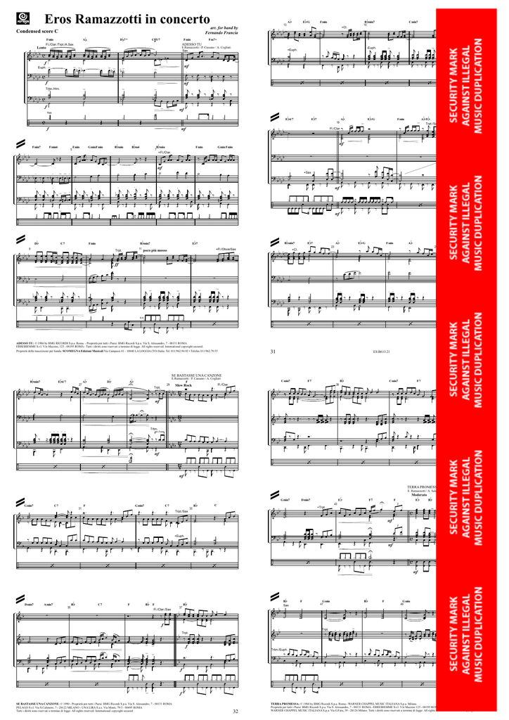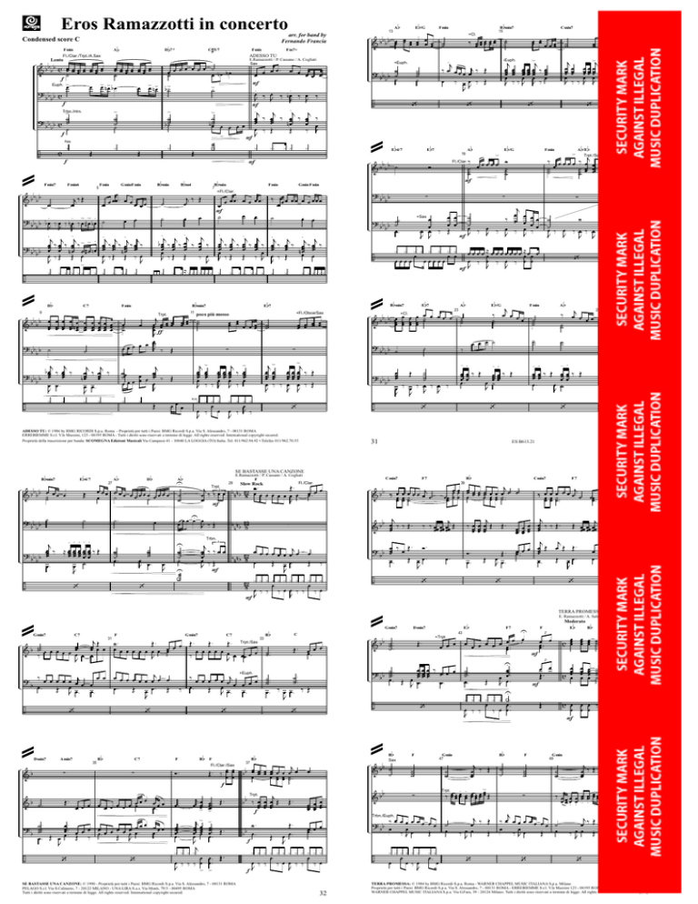 Eros Ramazzotti in concerto Condensed score C Fmin Fl./Clar./Trpt./A.Sax A b b arr. for band by Fernando Francia # D 7+ C 5/7 Fmin E.Ramazzotti / P. Cassano / A. Cogliati o Fmin7 bb &b b Fmin6 5 j‰ Œ œ ˙ Fmin ? b b b b œ. ‰ œ ‰ n œ. ‰ >œ # >œ n œ. b J J J . .j j j >> . ? b b b œœœ ‰ œœœ ‰ n œœœ ‰ œ # œ n œ b œ ‰Œ Œ œ J > ¿ ¿ ¿¿¿ ¿ ¿ ¿ ¿ ÷ @ D 9 b ¿ ¿. ¿¿ ¿ ¿¿¿ ¿ . j œœ ‰ œœ J‰ j œœ ‰ œ ‰ œ J b j j œ ‰ œ ‰ n œœ œœ œ œ. J ¿ ¿ .j œœœ ‰ Œ 11 ¿ ¿ œœœ Œ ¿ ¿ . j j œ ‰ œœ ‰ n œœœ œ œ ¿ ¿ ¿ ¿¿¿¿ b +Fl./Oboe/Sax œœ œœ œ œ œœ ˙˙ ∑ j > œœ œœ ‰ œœ œ œœ œœ J ‰ ¿ ¿ ¿ ¿ ¿ ¿ ¿ ¿ œ œ œ ‰ œ œ ‰ J ‰ J J H.H. œœ œœ œœ œœ ∑ j> œœ œœ œœ œœ œ œ œœ œ ‰ ‰ œ J J > j œœ ‰ Œ œ œ ‰ Œ J b b Ab U œœœ œ œœ œ œœœ œœ œ ˙ œ ˙ œ œ ˙ ˙ E 4/7 bb & b b œ˙˙ œ œ œ 27 Œ ? bb b ˙ b b D . . . -. j œ œœœœœ ? b b œœ ‰ ≈ œœ œœ œœ œœ œœ ‰ Œ bb œ. œ ˙ J ˙˙ ˙ œ J œ. ˙˙ ˙ œ. œ J ‘ C7 n n n b 128 o @ Dmin7 Amin7 &b ∑ & b ˙. Œ. ‘ 35 B b C7 ∑ B b ∑ œœœ œœœ œ œ œ œ œ œ œ œ œ œ. œ. . œœ .. œœ œœœ ? ˙˙˙ .. œ . œ œ œ œœ œ œ œ œ œœ œœ . œ. b Œ J œ. Œ œ œ. Œ ‰ . J ÷ ‘ ‘ ‘ F Ó. B b j œ œœœ > j >œ œœ .. œœ œ œœ . œœ œœ . J j ¿ ¿ ¿ ¿ œ œ ‰ ‰ ‰ œ J > œ. ˙ C Œ. Bb 37 œ œ œ b œ œ Œ . ‰ œ œ b œœ . œœ œœ œœœ œœ œ f Trpt. j b b ‰ œœ œœ œœ Œ œœ .. Œ . œ œ œ œ> . f > . Ó . œœ . . œœ . Œ bb œ . . Œ f ¿ ¿ ¿ ¿ ¿ œ. Œ. œ œ ‰ ‰ ‰ œ. > fJ F Fl./Clar./Sax œœ œ œ . SE BASTASSE UNA CANZONE: © 1990 - Proprietà per tutti i Paesi: BMG Ricordi S.p.a. Via S. Alessandro, 7 - 00131 ROMA PELAGO S.r.l. Via S.Calimero, 7 - 20122 MILANO - UNA LIRA S.a.s. Via Monti, 79/3 - 00495 ROMA Tutti i diritti sono riservati a termine di legge. All rights reserved. International copyright secured. Œ. & bb Œ. œœ .. œ œ œ œ. J ¿ ¿ ¿ ¿ ¿ ¿ ¿ œ œ œ ‰ ‰ ‰ œ J b j & b œœœ ‰ ‰ Œ . 32 œœ Œ œ œ ‰ œ ‰ J J Œ œœœ œ ‰ œ ‰ J J ‘ b Db 25 ‰ œj œ œ œ œ ˙˙ œ œ œ ˙˙ b Œ ˙˙ A ˙ A /C ˙ - . - . œœœ œœœ ‰ Œ œœœ œœœ ‰ Œ œ. œ ˙ J -. œœœ œœ ‰ Œ œ ˙ ˙ ‘ œ œœ ˙ . . ‰ œœœ œœœ œ J j œœœ ‰ œ. ‘ ‘ ÷ @ Ó. œ. œ. Œ ‘ - . œœœ œœœ ‰ Œ ˙ ‘ Œ. Œ. œ J œ. Cmin7 F7 E b F j ‰ œœ œœ œ˙ œ œ œ œ œœ œ œ ˙˙˙ ... œ œ ˙ .. œ .. 41 j j œ œœœ œœœ œœœ œœ ‰ ‰ Œ . Œ œœœ œœœ œœœ Œ j j . œœ .. œ œ œœœ Œ œ Œ Œ œ œ œ ˙˙˙ ... œ œ. . Œ œ. Œ œ œ. œ J J ∑ œœœ œœœ œœœ ‰ œ œ œ œ. Œ ‘ ‘ œœ . œ œ œ. Œ. ‘ TERRA PROMESSA Gmin7 Dmin7 b & b ˙˙˙ ... Œ. œ œ œ +Trpt. ‘ b B Sax b F Gmin 47 ˙˙ ˙ ˙˙ ˙ U œœ .. ˙˙˙ .. œ. . œ œ. Œ J œ. U ¿ ¿ ¿ ¿ ¿ ¿ ¿. œ. œ œ ‰ œ œ. J ‰ ‰ Trpt. œ ? bb ‰ œ œ œ œ œ œ œ œ œ Œ ‰Jœ Trbn./Euph. ¿¿ œ. ˙ œ œ j œ ‰ Œ ‰ Jœ œ Œ ‘ B b F E œœ . œ œ. 2 F œ œ Œ. F o j œœ ‰ Œ œ b Bb œœ œœ œœ ˙˙ c œ œ œ ˙ Moderato F7 > . . ‰ œœ œœ œœ œœ œœ œœ œœ œœ Œ ∑ ¿¿ ¿¿¿ ¿ œ œ œ‰œ J 43 E. Ramazzotti / A. Salerno / R. Brioschi b U œ œ œ œ œ œ œ œœ . œ œ. E œœ œœ œœ ‰ œ œ œ ? b b ˙˙˙ ... œ . Œ œ œœ .œ œ œ . J &b j ‰ œœ œœ œœ Œ œœœ ‰ ‰ œœœ œœœ œœœj Œ œ ‰ Œ. Ó. ? b b œœ œ Œ œ œ. œ. J ÷ ˙ Ó ˙ œ ‰ œ ‰ œ ‰ œ ‰ J J J J ˙ Bb 39 j œœ œœ œœ œœ œœ œœ œ œ œ œ œ . œœœ œ œ œ . œ œœ œœ ˙˙ .. F7 j ‰ œœ œœ œ˙ œ œ œ œ œ œ ˙ .. b & b ˙˙ œ œ œœ œœ œœ œ œ œœ œ œœ œ ‰ J ˙ Euph. ES B613.21 @ œ. > j œœ ‰ œœ ‰ œœ .. œ œ œ. œ. œ œ Œ J ‘ ∑ œ œ œ ˙ ‘ ÷ ‘ j œœ œ˙ œ œ ˙ .. ∑ b Fmin j ‰ œ œ œ œ ˙˙˙ ˙˙ - . œœœ œœœ ‰ Œ œ. œ J œœ œœ ‰ œ œ œ œ œ œ A b/E b Db Ab > Trpt./Sax 21 ‰ œ œ œ œ ‰ œj œ œ œ œ œ ˙˙˙ œ ˙˙ œœ œœ œœœ œœœ œœœ œœ œœ œœœ œœœ œœœ œœ œœ œœœ œœœ ˙ E /G ‰ b Fmin Ó ˙˙ ˙ œ œ œ œ ≈œ œ œ œ œ œ œ œ ≈œ œ œ œ œ ‰ œ ‰ œ ‰ œ œ J J FJ B bmin7 E b7 Ab 23 œ œ œ œ̇˙ œ œ œ œ ˙˙ b b b œ +Cl. b ˙ œœ œœ œœ œœ & Cmin7 œ œœ . œ 3 C7 b D +Euph. ‘ E /G 31 j j œœ ‰ ‰ œ œ œ œ n n n b 128 œ œ œ œ œ œ œ œ . œ ‰Œ œ. Œ œ œ. Œ ‰ J J F 128 ¿ ¿ ¿ œ¿ ¿ ¿ ¿ ¿ ¿ œ¿ ¿ ¿ œ ‰‰ ‰œ œ ‰ ‰ ‰œ J FJ Trbn. Gmin7 ‘ œ œ ˙ œ œ œ ˙ œ œ œ œ ‰ Œ J J FJ >j œœ œœ œœ ‰ œœ œ œœ J J ‰Œ j œœœ œœœ œ J ‰‰ ‘ j œ ‰ œ ‰ œJ ‰ Jœ ‰ +Sax 17 œœ œœ œœ œœ ˙˙ >j j œœ œœ œœ œœ œœ ‰ œœ œ œ œœœ œ œ ‰‰œ œ ‰œ J J J b > ‰ œœœœ ˙˙ œ ˙ F ¿ ¿ ¿ ¿ ¿ ¿ ¿ ¿ œ œ œ œœœœ . œœœœœ @ œœ œœ œ œ œœ -Euph. Fl./Clar. ∑ ÷ Cmin7 ˙˙ A 19 Ó ÷ ‰ œ œ œ œ œ j +Euph. ˙ .. ‰ œ œ œ œ œ j œ œ œ œ œ œ œ œ œj œ œ . ˙˙˙ ... ? œ œ œ œ œ ˙˙ . œ œ œ b œ. œ. Œ œ œ. Œ ‰ œ. Œ Jœ œ . œ . Œ Jœ œ . œ . ‰ œ. œ œ. ‰ Œ J J ÷ b E 7 ? b b b ˙˙˙ b œ . E.Ramazzotti / P. Cassano / A. Cogliati F Fl./Clar. Slow Rock Ó. Œ. j 3 n œ ‰ ‰ œ œ n n b 128 œ œ œ œ œ œ œ œ œ J F U ˙˙ ˙ ˙ U ¿æ F b E 4/7 ? bb b b b B min7 15 ‘ œ ˙ ? b b b œœ Œ ˙˙ b œ ‰ œ ‰ œJ ‰ Jœ ‰ J J ‘ 33 j 31 Ó . Œ. Œ. Œ . Trpt./Sax Œ. œ. œ Œ ˙. œ œ œ œ œ œ œ œ & b ˙ . œ œ œ œ œ œœ . œ œœ œ œ œ œ œ œ œ œ œ œ œœ . œ ˙˙ .. œ ‰ œ œ ‰ J œ. J J Gmin7 ‘ SE BASTASSE UNA CANZONE 29 Trpt. U œ œ œ œ Jœ ‰ Œ œ ‘ @ b ˙. 