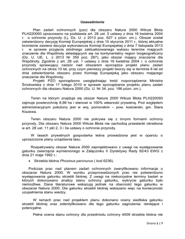 Uzasadnienie Plan zadań ochronnych (pzo) dla obszaru Natura 2000 Wilcze Błota PLH220093 opracowano na podstawie art. 28 ust. 5 ustawy z dnia 16 kwietnia 2004 r. o ochronie przyrody (t.j. Dz. U. z 2013 poz. 627 z pózn. zm.). Obszar został zatwierdzony decyzją Komisji Europejskiej z dnia 10 stycznia 2011 r., której aktualne brzmienie zawiera decyzja wykonawcza Komisji Europejskiej z dnia 7 listopada 2013 r. w sprawie przyjęcia siódmego zaktualizowanego wykazu terenów mających znaczenie dla Wspólnoty składających się na kontynentalny region biogeograficzny (Dz. U. UE. L. z 2013 Nr 350 poz. 287), jako obszar mający znaczenie dla Wspólnoty. Zgodnie z art. 28 ust. 1 ustawy z dnia 16 kwietnia 2004 r. o ochronie przyrody sprawujący nadzór nad obszarem sporządza projekt planu zadań ochronnych na okres 10 lat, przy czym pierwszy projekt tworzy się w terminie 6 lat od dnia zatwierdzenia obszaru przez Komisję Europejską jako obszaru mającego znaczenie dla Wspólnoty. Projekt PZO sporządzono uwzględniając treść rozporządzenia Ministra Środowiska z dnia 17 lutego 2010 w sprawie sporządzania projektu planu zadań ochronnych dla obszaru Natura 2000 (Dz. U. Nr 34, poz. 186 pózn. zm.). Teren na którym znajduje się obszar Natura 2000 Wilcze Błota PLH220093 zajmuje powierzchnię 8,98 ha i stanowi w 100% własność prywatną. Pod względem administracyjnym położony jest w woj. pomorskim – pow. kościerski, gm. Stara Kiszewa. Teren obszaru Natura 2000 nie pokrywa się z innymi formami ochrony przyrody. Dla obszaru Natura 2000 Wilcze Błota nie zachodzą przesłanki określone w art. 28 ust. 11 pkt 2, 3 i 3a ustawy o ochronie przyrody. W lasach prywatnych gospodarka leśna prowadzona jest w oparciu o uproszczone plany urządzenia lasu. Rozpatrywany obszar Natura 2000 zaprojektowano z uwagi na występowanie gatunku zwierzęcia wymienionego w Załączniku II Dyrektywy Rady 92/43 EWG z dnia 21 maja 1992 r.: Strzebla błotna Phoxinus percnurus ( kod 6236). Podczas prac nad planem zadań ochronnych zweryfikowano informacje o obszarze Natura 2000. W wyniku przeprowadzonych prac nie potwierdzono występowania gatunku strzebli błotnej. Z uwagi na niekorzystne terminy badań w których dokonywano analizy stanu ochrony gatunku, wykrycie gatunku było niemożliwe. Dane literaturowe wskazują jednak na obecność tego gatunku w obszarze Natura 2000. Dla gatunku strzebli błotnej wskazano więc na konieczność uzupełnienia stanu wiedzy. W ramach prac nad projektem planu dokonano oceny siedliska gatunku strzebli błotnej oraz zidentyfikowano dla tego gatunku zagrożenia: istniejące i potencjalne. Pełna ocena stanu ochrony dla przedmiotu ochrony 4009 strzebla błotna nie Strona 1 z 7 była możliwa ze względu na termin realizacji projektu. Wykonano jednak ocenę parametru stanu siedliska dla tego gatunku – jest ono w złym stanie ochrony (U2). Najpoważniejszym zagrożeniem dla gatunku są zmiany stosunków wodnych spowodowane przez działalność człowieka. Występujący na tym obszarze przedmiot ochrony jest zależny od właściwego reżimu wodnego. Obecność rowów melioracyjnych wpływa na poziom zalegających wód, a rezultatem tego jest wypłycanie i zarastanie zbiorników ze strzeblą błotną spowodowane przez intensyfikacje procesu związanego z ewolucją biocenotyczną – sukcesją, która jest procesem naturalnym, ale w niezaburzonym środowisku przebiega znacznie wolniej. Dodatkowo, zagrożenie stanowią rozproszone zanieczyszczenia wód powierzchniowych wynikające z działalności rolniczej i leśnej. Obszar otoczony jest polami uprawnymi, z których spływają biogeny powodujące przeżyźnienie siedliska i wkraczanie niepożądanych gatunków. Zagrożeniem potencjalnym dla gatunku jest również gospodarka rybacka – wprowadzanie gatunków które mogą konkurować o pokarm z gatunkiem strzebli błotnej (np. karaś srebrzysty) lub gatunków drapieżnych, a także wędkowanie. Jako cel działań ochronnych dla gatunku ustalono: uzupełnienie stanu wiedzy na temat populacji gatunku, a także utrzymanie wartości wskaźnika parametru struktura i funkcje siedliska powierzchnia siedliska powierzchnia lustra wody na co najmniej dotychczasowym poziomie U2. Działania ochronne zabezpieczają osiągnięcie wyznaczonych celów ochrony dla gatunku strzebli błotnej. Działania ochronne związane z ochroną gatunku ryby 4009 strzebla błotna wiążą się z badaniem poziomu wód gruntowych i odpływu oraz wykonaniem zastawek piętrzących lub zatrzymujących wodę w siedlisku. Wskazano również na konieczność uzupełnienia stanu wiedzy z zakresu hydrologii obszaru oraz populacji gatunku. Na etapie opracowywania PZO nie było możliwe przeprowadzenie właściwej inwentaryzacji, dlatego wykonanie tego działania na etapie realizacji PZO jest w pełni uzasadnione. Jako za działanie ochronne dla gatunku strzebli błotnej wskazano również na działanie z zakresu modyfikacji gospodarki rybackiej w obrębie zbiorników wodnych będących siedliskiem strzebli błotnej poprzez wyłączenie ich z użytkowania wędkarskiego i rybackiego. Potrzeba wykonania ww. działania wynikła ze stwierdzonych w zał. 3 do projektu zarządzenia potencjalnych zagrożeń: F użytkowanie zasobów biologicznych inne niż rolnictwo i leśnictwo – gospodarka rybacka prowadzona bez uwzględnienia wymogów ochronnych gatunku może prowadzić do pogorszenia stanu ochrony gatunku. Możliwość wprowadzenia ryb z którymi strzebla konkuruje o pokarm (np. karaś złocisty), lub ryb drapieżnych, F02.03 wędkarstwo - wędkarstwo może wpłynąć niekorzystnie na liczebność populacji strzebli błotnej, która może być wykorzystywana przez wędkarzy jako żywa przynęta, K03.01 konkurencja - konkurencja z gatunkami rodzimymi i obcymi będąca rezultatem celowego zarybiania wpływa niekorzystnie na stan zachowania populacji, konkurencja o bazę pokarmową np. z. karasiem srebrzystym, K03.04 drapie
