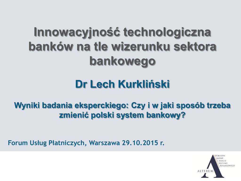 Innowacyjność technologiczna banków na tle wizerunku sektora bankowego Dr Lech Kurkliński Wyniki badania eksperckiego: Czy i w jaki sposób trzeba zmienić polski system bankowy? Forum Usług Płatniczych, Warszawa 29.10.2015 r. Informacje o badaniu Czyje to stanowisko? eksperci – znawcy systemów bankowych i otoczenia banków, gotowi dzielić się swoją wiedzą dla dobra publicznego, wyłonieni w procesie środowiskowej rekomendacji Wielkość i okres przeprowadzenia próby badawczej n=94, wrzesień 2015 Technika badawcza ankieta internetowa Realizacja badania wykonawca badania – Instytut Badawczy ProPublicum konsultant merytoryczny – ALTERUM Ośrodek Badań i Analiz Systemu Finansowego Mocne strony polskiego systemu bankowego Mocne strony % Nowoczesny, zaawansowany technologicznie 42% Bezpieczny 32% Stabilny 20% Dobry nadzór bankowy 16% Dobrze skapitalizowany 15% Bogata oferta produktowa 13% Wykwalifikowane kadry 12% Konserwatyzm, niskie zaangażowanie w ryzykowne instrumenty finansowe 12% Wysoka rentowność 11% Wykwalifikowana kadra zarządzająca 9% Konkurencyjny 9% n=94, wskazania powyżej 8% Słabe strony polskiego systemu bankowego Słabe strony % Brak orientacji na trwałe, partnerskie relacje z klientami 27% Nadmierna orientacja na zysk, wyniki krótkookresowe, sprzedaż 26% Dominacja kapitału zagranicznego 22% Agresywna sprzedaż produktów bankowych 19% Brak długoterminowych źródeł finansowania działalności 17% Nieatrakcyjna oferta kredytowa dla sektora MSP 13% Niskie kapitały 13% Utrata zaufania społecznego, negatywny wizerunek 10% Brak strategii zorientowanej na rozwój polskiej gospodarki 9% Wysokie koszty usług bankowych 9% Duży portfel kredytów walutowych, w tym w CHF 8% Zbyt rozproszony/rozdrobniony 8% Brak odniesień do technologii !!! n=94, wskazania powyżej 7% Wielowymiarowa ocena działających w Polsce banków – średnie ocen na 7 – stopniowej skali 4,9 – średni poziom oceny czynnika Ceny usług bankowych Nowoczesność 7 Przestrzeganie etyki (zaawansowanie 6 6,3 zawodowej technologiczne)… 5 3,5 4 Bezpieczeństwo usług 5,7 bankowych 3,8 3 Transparentność funkcjonowania 4,0 2 1 Gęstość sieci placówek bankowych 5,7 4,2 0 4,7 Jakość świadczonych Asortyment świadczonych 5,4 usług usług Dostępność usług dla obywateli 5,2 4,9 Dostępność usług dla podmiotów gospodarczych 5,0 Kwalifikacje kadr n=94 Bardzo źle 1 Reputacja banków Przeciętnie 2 3 4 Bardzo dobrze 5 6 7 Największe szanse dla systemu bankowego w Polsce Szanse % Rozwój oferty produktowej pod wpływem nowych technologii 28% Wzrost gospodarczy, potrzeby inwestycyjne 27% Wzrost poziomu ubankowienia społeczeństwa 20% Dalszy rozwój, potencjał rozwoju 15% Wzrost zamożności społeczeństwa 14% Napływ środków UE Większe zaangażowanie w finansowanie przedsiębiorstw, zwłaszcza MSP Odbudowa zaufania społecznego, poprawa wizerunku 12% n=94, wskazania powyżej 8% 12% 9% Największe zagrożenia dla systemu bankowego w Polsce n=94, wskazania powyżej 7% Zagrożenia % Decyzje polityczne, niestabilność polityczna Obciążenia finansowe nakładane na sektor, wprowadzenie podatku bankowego Pogorszenie sytuacji gospodarczej w Polsce (w tym pod wpływem zjawisk kryzysowych na świecie, w Europie) Nadmierna skala regulacji 45% Utrata zaufania społecznego 15% Problem kredytów w CHF - krytycznie o obecnych propozycjach rozwiązań 12% Słabe działanie instytucji sieci bezpieczeństwa, w tym nadzoru bankowego 12% Nierozwiązanie problemu kredytów w CHF 9% Problem SKOK-ów 8% Nadmierna orientacja na zysk 8% Działanie instytucji niebankowych świadczących usługi finansowe 8% Brak odniesień do technologii !!! 33% 29% 20% Czynniki decydujące o potrzebie podjęcia zmian w sektorze bankowym Aspekty polityczne (presja polityków i wyborców) 45% Szybki postęp innowacji technologicznych 42% Silny wzrost konkurencji, w tym ze strony instytucji pozafinansowych Nowa architektura nadzorczo-regulacyjna w Unii Europejskiej 34% 31% Spadek zaufania klientów do banków 29% Nadmierna skala regulacji 29% Rosnące wymagania klientów 26% Klienci zgłaszający roszczenia i demonstrujący niezadowolenie (np. frankowicze) 25% Niedostatki w zarządzaniu ryzykiem przez banki 24% Wzrost znaczenia czynników demograficzno – społecznych 22% Wzrost obciążeń podatkowych i parapodatkowych banków 18% Zmieniający się europejski rynek usług finansowych 15% Radykalne zmiany uwarunkowań makroekonomicznych 14% Niedostatki w zarządzaniu ryzykiem przez instytucje państwa Inne 12% 4% n=94 W jakich obszarach polski system bankowy wymaga zmian? wskazania powyżej 10%, n=94 Edukacja finansowa klientów 50% Etyka w zachowaniach biznesowych banków 37% Komunikacja władz gospodarczych i politycznych z sektorem bankowym 32% 30% Relacje z klientami Kredytowanie przedsiębiorstw 26% Bezpieczeństwo elektroniczne danych bankowych 25% Tworzenie się nowego modelu bankowości spółdzielczej 20% Konkurencja z podmiotami niebankowymi 19% System stanowienia regulacji krajowych i unijnych 17% Wykluczenie finansowe znacznej części obywateli 17% Strategie i modele biznesowe banków 17% System wynagradzania zarządów i członków rad nadzorczych 15% Finansowanie innowacji 13% Struktura własnościowa banków 13% Przestępstwa na szkodę banków i klientów 12% Brak odniesień do technologii !!! Jakie zagadnienia są nieuregulowane lub uregulowane źle? Zagadnienia % Ochrona klientów w ich relacjach z bankami Działalność parabanków, firm pożyczkowych i innych niebankowych instytucji finansowych Kredyty walutowe 26% Transparentność i zrozumiałość ofert bankowych, uproszczenie umów 8% Finansowanie przedsiębiorstw, w tym zwłaszcza MSP 8% Kredyty hipoteczne 6% Nadzór bankowy 6% Bezpieczeństwo informatyczne, cyberprzestępczość 5% Restrukturyzacja i uporządkowana likwidacja banków 5% Ustalanie cen usług bankowych 5% Brak odniesień do technologii !!! n=94, wskazania powyżej 4