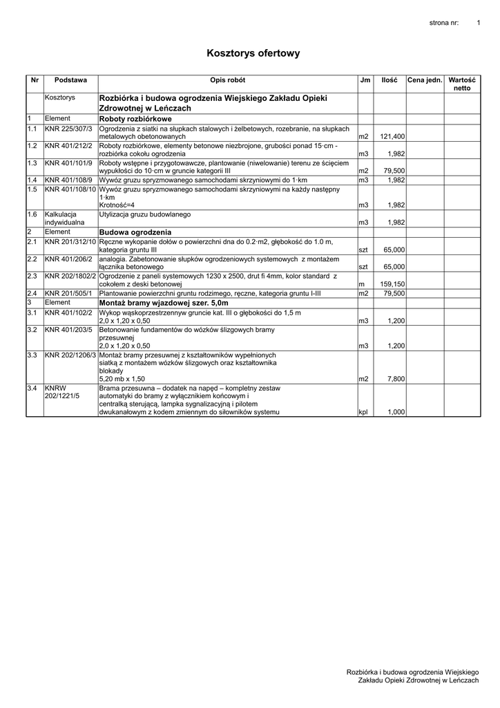 strona nr: 1 Kosztorys ofertowy <-NR-> <-PODST-> Nr 1 1.1 1.2 1.3 1.4 1.5 1.6 2 2.1 2.2 2.3 2.4 3 3.1 3.2 3.3 3.4 <-OPIS-> Podstawa <-JEDN-> Opis robót Kosztorys Rozbiórka i budowa ogrodzenia Wiejskiego Zakładu Opieki Zdrowotnej w Leńczach Element KNR 225/307/3 Roboty rozbiórkowe Ogrodzenia z siatki na słupkach stalowych i żelbetowych, rozebranie, na słupkach metalowych obetonowanych KNR 401/212/2 Roboty rozbiórkowe, elementy betonowe niezbrojone, grubości ponad 15·cm rozbiórka cokołu ogrodzenia KNR 401/101/9 Roboty wstępne i przygotowawcze, plantowanie (niwelowanie) terenu ze ścięciem wypukłości do 10·cm w gruncie kategorii III KNR 401/108/9 Wywóz gruzu spryzmowanego samochodami skrzyniowymi do 1·km KNR 401/108/10 Wywóz gruzu spryzmowanego samochodami skrzyniowymi na każdy następny 1·km Krotność=4 Kalkulacja Utylizacja gruzu budowlanego indywidualna Element Budowa ogrodzenia KNR 201/312/10 Ręczne wykopanie dołów o powierzchni dna do 0.2·m2, głębokość do 1.0 m, kategoria gruntu III KNR 401/206/2 analogia. Zabetonowanie słupków ogrodzeniowych systemowych z montażem łącznika betonowego KNR 202/1802/2 Ogrodzenie z paneli systemowych 1230 x 2500, drut fi 4mm, kolor standard z cokołem z deski betonowej KNR 201/505/1 Plantowanie powierzchni gruntu rodzimego, ręczne, kategoria gruntu I-III Element Montaż bramy wjazdowej szer. 5,0m KNR 401/102/2 Wykop wąskoprzestrzennyw gruncie kat. III o głębokości do 1,5 m 2,0 x 1,20 x 0,50 KNR 401/203/5 Betonowanie fundamentów do wózków ślizgowych bramy przesuwnej 2,0 x 1,20 x 0,50 KNR 202/1206/3 Montaż bramy przesuwnej z kształtowników wypełnionych siatką z montażem wózków ślizgowych oraz kształtownika blokady 5,20 mb x 1,50 KNRW Brama przesuwna – dodatek na napęd – kompletny zestaw 202/1221/5 automatyki do bramy z wyłącznikiem końcowym i centralką sterującą, lampka sygnalizacyjną i pilotem dwukanałowym z kodem zmiennym do siłowników systemu <-ILOSC-> <-CENA-> Jm Ilość m2 121,400 m3 1,982 m2 m3 79,500 1,982 m3 1,982 m3 1,982 szt 65,000 szt 65,000 m m2 159,150 79,500 m3 1,200 m3 1,200 m2 7,800 kpl 1,000 <-WARTOSC-> Cena jedn. Wartość netto Rozbiórka i budowa ogrodzenia Wiejskiego Zakładu Opieki Zdrowotnej w Leńczach
