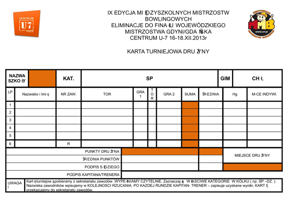 IX EDYCJA MI ĘDZYSZKOLNYCH MISTRZOSTW BOWLINGOWYCH ELIMINACJE DO FINA ŁU WOJEWÓDZKIEGO MISTRZOSTWA GDYNI/GDA Ń SKA CENTRUM U-7 16-18.XII.2013r KARTA TURNIEJOWA DRU ŻYNY NAZWA SZKO ŁY LP . KAT. Nazwisko i Imi ę NR ZAW. SP TOR GRA 1 T O R CH Ł GIM GRA 2 SUMA ŚR EDNIA Hg M-CE INDYWI. 1 2 3 4 5 6 R PUNKTY DRU ŻYNA ŚR EDNIA PUNKTÓW MIEJSCE DRU ŻYNY PODPIS S ĘDZIEGO PODPIS KAPITANA/TRENERA UWAGA ! Kart ę turniejow ą pobieramy z sekretariatu zawodów .WYPE ŁNIAMY CZYTELNIE. Zaznaczaj ąc W ŁASCIWE KATEGORIE W KÓLKU ( np. SP –DZ. ). Nazwiska zawodników wpisujemy w KOLEJNOSCI RZUCANIA. PO KAZDEJ RUNDZIE KAPITAN- TRENER – zapisuje uzyskane wyniki. KART Ę przekazujemy do sekretariatu zawodów.