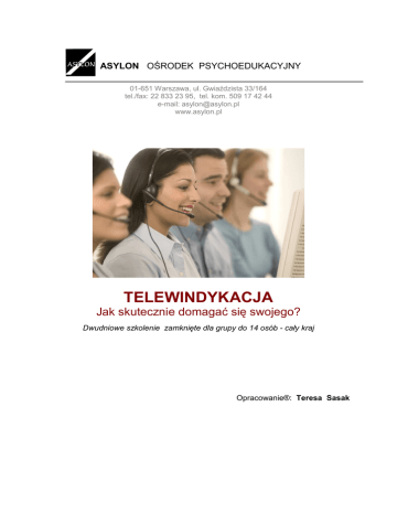 ASYLON OŚRODEK PSYCHOEDUKACYJNY 01-651 Warszawa, ul. Gwiaździsta 33/164 tel./fax: 22 833 23 95, tel. kom. 509 17 42 44 e-mail: [email protected] www.asylon.pl TELEWINDYKACJA Jak skutecznie domagać się swojego? Dwudniowe szkolenie zamknięte dla grupy do 14 osób - cały kraj Opracowanie®: Teresa Sasak PRZYGOTOWANIE I ORGANIZACJA SZKOLENIA Przed szkoleniem trener analizuje potrzeby szkoleniowe uczestników i określa rezultaty szkolenia na podstawie: - rozmowy z Organizatorem - dostępnych procedur - analiza obecnych ścieżek rozmów windykacyjnych - ankiet szkoleniowych przesłanych przez uczestników bezpośrednio do trenera przed szkoleniem. Szkolenie otworzy krótka tematyczna sesja integracyjna mająca na celu przygotowanie uczestników do pracy metodami aktywizującymi, warsztatowymi; sesja ma na celu stworzenie atmosfery zaufania, wzajemnej życzliwości i partnerstwa w osiągnięciu celów szkolenia Każdy uczestnik otrzyma podczas szkolenia tematyczne materiały szkoleniowe i pomocnicze, standardowe narzędzie telewindykacyjne (ścieżkę) oraz zaświadczenie potwierdzające uczestnictwo w szkoleniu Trener przeprowadzi bezpośrednią ewaluację szkolenia oraz przygotuje sprawozdanie końcowe, w którym opisze przebieg szkolenia, ogólny potencjał osobowościowo - kompetencyjny szkolonej kadry i wnioski do jej dalszego doskonalenia zawodowego Organizator otrzyma sugestie dotyczące modyfikacji obecnych ścieżek telewindykacyjnych OGÓLNA CHARAKTERYSTYKA SZKOLENIA Szkolenie doskonali znajomość psychologicznych technik profesjonalnego ściągania należności na poszczególnych etapach telefonicznego procesu windykacyjnego: INFORMOWANIE>UZGADNIANIE ROZWIĄZAŃ>PONAGLANIE>ZAPOWIEDŹ SANKCJI. Umożliwia ich praktyczne przetrenowanie w grupie. Pomaga w doskonaleniu asertywnych zachowań (stanowczo-łagodnie-bez lęku). Wzamacnia również automotywację, panowanie nad emocjami i redukowanie stresu sytuacyjnego związanego z trudnym tematem rozmowy i ograniczonym czasem. Szkolenie kształtuje także odpowiednią postawę windykatorów wyrażająca się dbałością o zachowanie pozytywnego wizerunku firmy w kontakcie z dłużnikiem i przekonanie, że próby postępowania ugodowego są najlepszą alternatywą windykacji restrykcyjnych. KORZYŚCI DLA UCZESTNIKA I FIRMY Umiejętności nabyte w czasie warsztatów zwiększą skuteczność działań windykacyjnych w stosunku do wierzycieli. Stosowanie profesjonalnych technik windykacji telefonicznych pozwala odzyskiwać długi, bez straty klienta i reputacji firmy. Poznanie i przećwiczenie odpowiednich sposobów argumentacji na różnych etapach rozmowy i wobec różnych ludzi pozwoli uczestnikom szkolenia zachowywać się elastycznie podczas windykacji telefonicznych i maksymalnie wykorzystywać czas. Trening zachowań asertywnych wzmocni skuteczność zawodowych działań windykacyjnych, szczególnie w sytuacjach konfliktowych. Metodyka prowadzonych zajęć pozwoli otworzyć uczestników na współpracę i przekazanie nawzajem sprawdzonych skutecznych zachowań telewindykacyjnych. Efektem szkolenia jest także zmodyfikowanie aktualnych ścieżek rozmów windykacyjnych. ASYLON Ośrodek Psychoedukacyjny Telewindykacja - szkolenie zamknięte 2 METODYKA SZKOLENIA W szkoleniu zostanie wykorzystana wiedza i doświadczenia uczestników szkolenia. Scenariusz szkolenia uwzględni studia przypadków z realiów zawodowych. Szkolenie ma charakter interaktywny (trener animuje dzielenie się uczestników wiedzą i doświadczeniem oraz modeluje pożądane zachowania w windykacjach telefonicznych). Zostaną wykorzystane metody: ćwiczenia, odgrywanie ról (scenki), studia przypadków, testy autodiagnostyczne, dyskusja moderowana. Krótkie, rzeczowe wykłady, komentarze trenerskie i prezentacja multimedialna uzupełnią ww. metody. Uczestnicy szkolenia otrzymają użyteczne materiały szkoleniowe, który będą mogli wykorzystywać w procesie dalszego samokształcenia oraz jako źródło inspiracji. KLUCZOWE ZAGADNIENIA PROGRAMOWE 1. Autoprezentacja telefoniczna windykatora jako egzekutora długu 2. Trening pracy głosem 3. Zasady telefonicznej skuteczności windykacyjnej na kolejnych etapach: relacyjnym negocjacyjnym restrykcyjnym 4. Efektywna komunikacja na I etapie rozmowy (z dłużnikami „początkującymi”): pozytywne otwarcie - tworzenie przyjaznego pierwszego wrażenia i wizerunku profesjonalisty - aktywne słuchanie przekazanie informacji o sytuacji związanej ze spłatą zobowiazań - umiejętne formułowanie precyzyjnych komunikatów - techniki konstruktywnego pytania i argumentacji - ustalenie wiarygodnych przyczyn powstania zaległości podsumowanie ustaleń pozytywne zakończenie rozmowy 5. Prowadzenie kolejnych rozmów telefonicznych z „zaawansowanymi” dłużnikami ponaglanie - radzenie sobie ze standardowymi i nietypowymi wymówkami i manipulacjami dłużników negocjowanie propozycji rozwiązań zgodnie ze strategią „wygranawygrana” i „bądź empatyczny nie zapominając o swoich interesach” - strategia możliwych ustępstw wobec dłużnika w zamian za wzięcie przez niego odpowiedzialności za spłatę długu - psychologiczne wspieranie osiągania porozumienia i podniesienie decyzyjności dłużnika w kierunku pożądanym przez telewindykatora informowanie o sankcjach - sugestywne przedstawienie listy sankcji i ich konsekwencji w sytuacji niewywiązania się ze zobowiązań asertywny sposób zawiadomienia dłużnika o wszczęciu postepowania restrykcyjnego ASYLON Ośrodek Psychoedukacyjny Telewindykacja - szkolenie zamknięte 3 5. Zastosowanie wiedzy psychologicznej w kontakcie telefonicznym z dłużnikami jak dostroić się do temperamentu dłużnika: choleryka, sangwinika, melancholika, czy flegmatyka jak zachowywać się wobec klienta „osobistego” (spoufalającego się) jak komunikowac się z dłużnikiem naiwnym, chaotycznym, histerycznym, agresywnym, pieniaczem, nieuczciwym, etc. jak nie dać sobą manipul