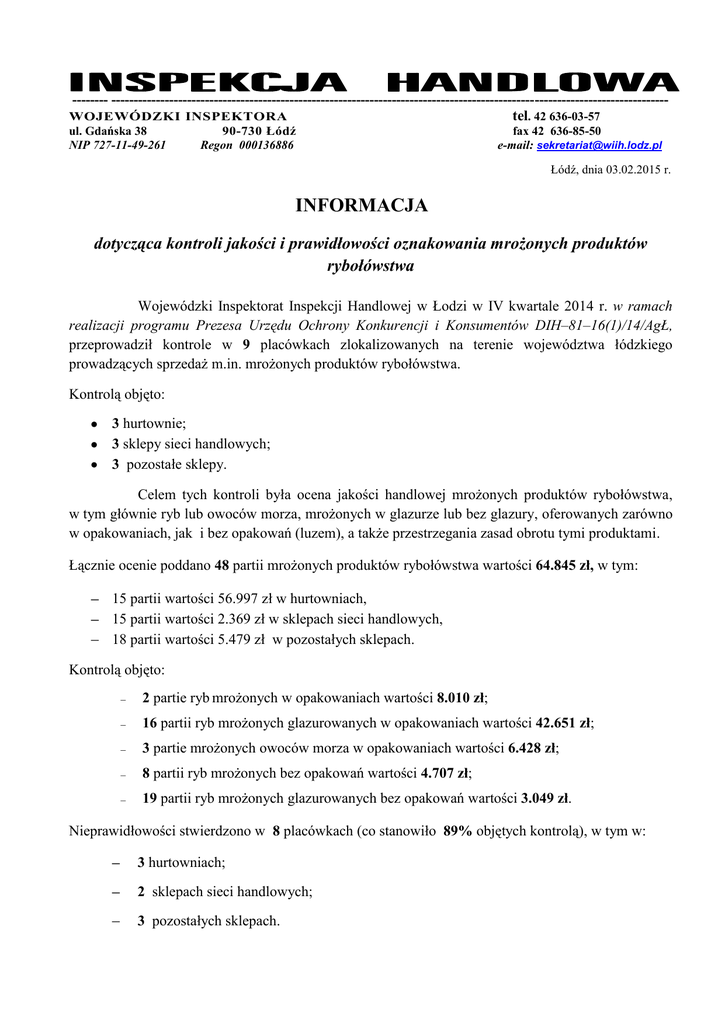 -------- ----------------------------------------------------------------------------------------------------------------------------WOJEWÓDZKI INSPEKTORA ul. Gdańska 38 90-730 Łódź NIP 727-11-49-261 Regon 000136886 tel. 42 636-03-57 fax 42 636-85-50 e-mail: [email protected] Łódź, dnia 03.02.2015 r. INFORMACJA dotycząca kontroli jakości i prawidłowości oznakowania mrożonych produktów rybołówstwa Wojewódzki Inspektorat Inspekcji Handlowej w Łodzi w IV kwartale 2014 r. w ramach realizacji programu Prezesa Urzędu Ochrony Konkurencji i Konsumentów DIH–81–16(1)/14/AgŁ, przeprowadził kontrole w 9 placówkach zlokalizowanych na terenie województwa łódzkiego prowadzących sprzedaż m.in. mrożonych produktów rybołówstwa. Kontrolą objęto: 3 hurtownie; 3 sklepy sieci handlowych; 3 pozostałe sklepy. Celem tych kontroli była ocena jakości handlowej mrożonych produktów rybołówstwa, w tym głównie ryb lub owoców morza, mrożonych w glazurze lub bez glazury, oferowanych zarówno w opakowaniach, jak i bez opakowań (luzem), a także przestrzegania zasad obrotu tymi produktami. Łącznie ocenie poddano 48 partii mrożonych produktów rybołówstwa wartości 64.845 zł, w tym: 15 partii wartości 56.997 zł w hurtowniach, 15 partii wartości 2.369 zł w sklepach sieci handlowych, 18 partii wartości 5.479 zł w pozostałych sklepach. Kontrolą objęto: 2 partie ryb mrożonych w opakowaniach wartości 8.010 zł; 16 partii ryb mrożonych glazurowanych w opakowaniach wartości 42.651 zł; 3 partie mrożonych owoców morza w opakowaniach wartości 6.428 zł; 8 partii ryb mrożonych bez opakowań wartości 4.707 zł; 19 partii ryb mrożonych glazurowanych bez opakowań wartości 3.049 zł. Nieprawidłowości stwierdzono w 8 placówkach (co stanowiło 89% objętych kontrolą), w tym w: 3 hurtowniach; 2 sklepach sieci handlowych; 3 pozostałych sklepach. W toku prowadzonych czynności kontrolnych zakwestionowano ogółem 20 partii mrożonych produktów rybołówstwa (41,7% partii badanych ogółem) o łącznej wartości 20.215 zł, w tym: 5 partii wartości 14.789 zł w hurtowniach, 2 partie wartości 394 zł w sklepach sieci handlowych, 13 partii wartości 5.032 zł w pozostałych sklepach. Wśród kwestionowanych produktów były: 4 partie ryb mrożonych glazurowanych w opakowaniach wartości 14.923 zł; 6 partii ryb mrożonych bez opakowań wartości 4.492 zł; 10 partii ryb mrożonych glazurowanych bez opakowań wartości 800 zł; 3.1. JAKOŚĆ W zakresie zgodności parametrów jakościowych z wymaganiami obowiązujących przepisów i deklaracjami producentów sprawdzono laboratoryjnie 18 partii mrożonych produktów rybołówstwa wartości 26.327 zł, w tym: 6 partii wartości 24.577 zł w hurtowniach, 6 partii wartości 1.203 zł w sklepach sieci handlowych, 6 partii wartości 547 zł w pozostałych sklepach. Badaniem objęto: 7 partii ryb mrożonych glazurowanych w opakowaniach wartości 24.989 zł; 1 partię mrożonych owoców morza w opakowaniach wartości 364 zł; 10 partii ryb mrożonych glazurowanych bez opakowań wartości 974 zł. W wyniku przeprowadzonych badań zakwestionowano z uwagi na niewłaściwą jakość 10 partii mrożonych produktów rybołówstwa łącznej wartości 15.410 zł (55,6% partii badanych laboratoryjnie). Wśród kwestionowanych produktów były: 4 partie ryb mrożonych glazurowanych w opakowaniach wartości 14.923 zł, w tym: panga sum filety b/s, panga sum filety, kostka z mintaja, łosoś norweski kawałki z/s; 6 partii ryb mrożonych glazurowanych bez opakowań wartości 487 zł, w tym: panga sum filety b/skóry, panga sum - filety bez skóry, bez ości, filety z flądry, limanda żółtopłetwa filety b/s, 2 filety z limandy żółtopłetwej bez skóry, mintaj kostka. Stwierdzone wady jakościowe to: niewłaściwe cechy fizyczno – chemiczne: zawyżona zawartość glazury dla 6 partii wartości 4.024 zł. Dla: - pangi sum filetów, deklarowano max 20% glazury, a stwierdzono 25,1% przy niepewności wyniku ±1,5, - pangi sum filetów b/skóry, deklarowano do 20% glazury, a stwierdzono 25,4% przy niepewności wyniku ±1,5; - mintaja kostki, deklarowano do 5% glazury, a stwierdzono 8,3% przy niepewności wyniku ±0,5; - pangi sum bez skóry, bez ości deklarowano 20% glazury, a stwierdzono 24,9% przy niepewności wyniku ±1,5; - filetów z flądry deklarowano 10% glazury, a stwierdzono 14,9% przy niepewności wyniku ±0,9; - filetów z limandy żółtopłetwej bez skóry, deklarowano maksymalnie 25% glazury, a stwierdzono 31,6% przy niepewności wyniku ±1,9; niższa zawartość białka dla 3 partie wartości 14.111 zł. Dla: - filetów z limandy żółtopłetwej deklarowano 18,8g białka na 100g, a stwierdzono 11,2g przy niepewności wyniku ±0,4; - pangi sum filetów, w tabeli wartości odżywczej deklarowano 18g białka na 100g, a stwierdzono 8,4g przy niepewności wyniku ± 0,3; - pangi sum filetów b/s, deklarowano 11,9g białka na 100g, a stwierdzono 8,6g przy niepewności wyniku ± 0,3; zaniżona masa ryby bez glazury dla 1 partii w opakowaniach wartości 657 zł; przekroczona zawartość fosforu w stosunku do ilości dozwolonej dla 1 partii ryby mrożonej glazurowanej bez opakowań wartości 63 zł; obecność fosforu dodanego niezadeklarowanego przez producenta na opakowaniach produktów dla 2 partii w opakowaniach wartości 907 zł. W celu wyeliminowania stwierdzonych nieprawidłowości skierowano wystąpienia pokontrolne do producentów, importerów, dostawców, podmiotów konfekcjonujących zakwestionowanych wyrobów oraz poinformowano właściwe terenowo Wojewódzkie Inspektoraty Jakości Handlowej Artykułów Rolno-Spożywczych oraz Państwowe Powiatowe Inspektoraty Sanitarne. 3.2. ZGODNOŚĆ DEKLAROWANEJ MASY Z RZECZYWISTĄ 3 Niedoborów masy w stosunku do deklarowanej na opakowaniach nie stwierdzono. Badaniem objęto 9 opakowań wartości 154 zł w sklepach sieci handlowych, pochodzących z 4 partii mrożonych prod