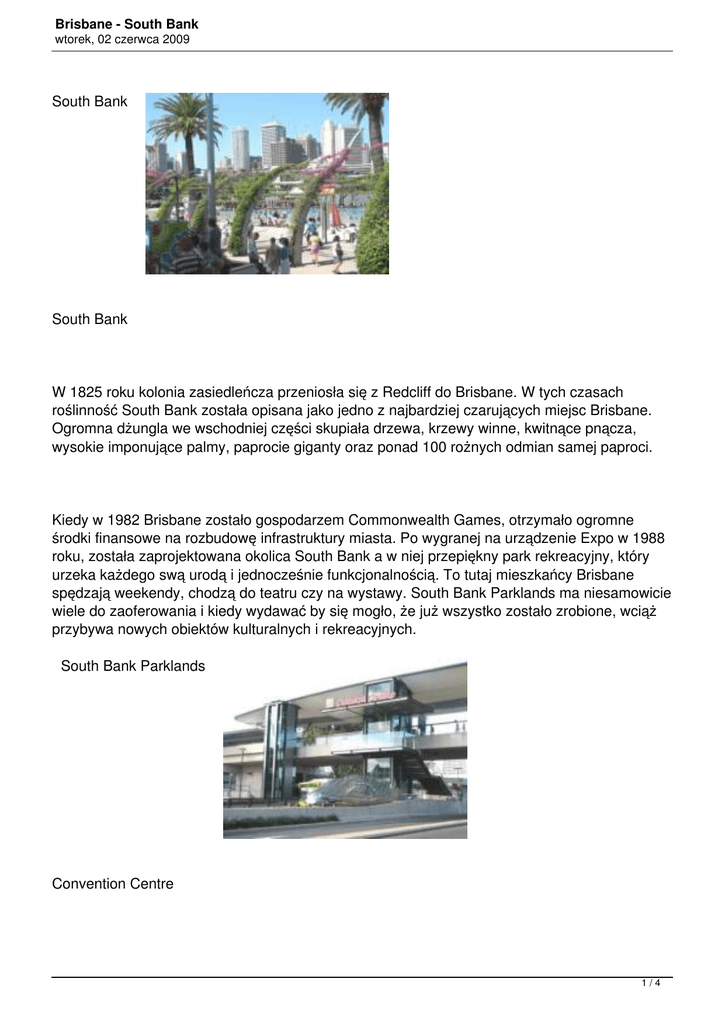 Brisbane - South Bank wtorek, 02 czerwca 2009 South Bank South Bank W 1825 roku kolonia zasiedleńcza przeniosła się z Redcliff do Brisbane. W tych czasach roślinność South Bank została opisana jako jedno z najbardziej czarujących miejsc Brisbane. Ogromna dżungla we wschodniej części skupiała drzewa, krzewy winne, kwitnące pnącza, wysokie imponujące palmy, paprocie giganty oraz ponad 100 rożnych odmian samej paproci. Kiedy w 1982 Brisbane zostało gospodarzem Commonwealth Games, otrzymało ogromne środki finansowe na rozbudowę infrastruktury miasta. Po wygranej na urządzenie Expo w 1988 roku, została zaprojektowana okolica South Bank a w niej przepiękny park rekreacyjny, który urzeka każdego swą urodą i jednocześnie funkcjonalnością. To tutaj mieszkańcy Brisbane spędzają weekendy, chodzą do teatru czy na wystawy. South Bank Parklands ma niesamowicie wiele do zaoferowania i kiedy wydawać by się mogło, że już wszystko zostało zrobione, wciąż przybywa nowych obiektów kulturalnych i rekreacyjnych. South Bank Parklands Convention Centre 1/4 Brisbane - South Bank wtorek, 02 czerwca 2009 Bougainvillea Symbolem South Bank stały się altany wiodące wzdłuż parku o długości przeszło jednego kilometra. Ten ogrodniczy cud składa się z 443 wijących się wąsów połączonych ze sobą stalowymi linkami. Wąsy te pokryte są wijącą się rośliną południowo amerykańską bougainvillea o purpurowych kwiatkach. Pracownicy parku starannie przycinają krzewy i dożywiają roślinkę zachęcając do tak bujnego wzrostu jaki widzicie na zdjęciach. South Bank i jego roślinność nie traci jednak uroku z nadejściem nocy. Wieczorem, altanowe wąsy świecą delikatnie żółtym światłem. Nigdy nie zapomnę mojej pierwszej wizyty w South Bank Parklands. Kwitnące na różowo kwiatki i cień jaki znalazłam pod wijącą się altaną, urzekły mnie niesamowicie i od tego momentu jest to zdecydowanie moje ulubione miejsce w Brisbane. Nawet w zimie, kiedy kolor kwiatków bougainvillea jest nieco mniej intensywny z powodu suszy, ogród wciąż wygląda imponująco, zachęcając odwiedzających do spacerów. Park South Bank znajduje się na 17 hektarach ziemi i jest dostępny dla każdego przez cały rok. Te 17 hektarów to ogrody tropikalne, skrawek lasu polodowcowego i sztucznie usypana laguna. Park oferuje chwile relaksu dla każdego, place zabaw dla naszych milusińskich, ścieżki rowerowe, oraz 14 urządzeń do barbecue i plażę strzeżoną cały rok. Nie mogę tu nie wspomnieć o coweekendowych bazarkach sztuki, kultury i rzemiosła. Dla spędzających tutaj długie chwile polecam sieć barów na skromną kieszeń, a dla tych z pełną kieszenią jedną z tutejszych restauracji. Sama osobiście uwielbiam turecką restaurację Ahmet, która oprócz rozpływającego się po prostu w buzi jedzenia urządza w piątki i soboty pokazy tańca brzucha. 2/4 Brisbane - South Bank wtorek, 02 czerwca 2009 Odwiedzaj często stronę South Bank Parklands by dowiedzieć się jakie imprezy przyszykowano dla bywalców Suncorp Piazza, amfiteatru medialnego. Warto odwiedzić coroczny Festiwal Tańców Latynoamerykańskich by poduczyć się Salsy. Centrum Wystawowo Kulturalne South Bank Queensland Musem Ale samo South Bank to także Centrum Wystawowo Kulturalne. W Convention Centre mają miejsce wyprzedaże, wystawy i show’y. Nowoczesne hale są przystosowane do wszelakich imprez i klimatyzowane pomieszczenia spełniają tę rolę świetnie. Ja co roku odwiedzam Pet Show. 3/4 Brisbane - South Bank wtorek, 02 czerwca 2009 Queensland Performing Arts Centre - dom sztuki, musicali, teatru, baletu, opery i wszelakich koncertów. Konserwatorium Griffith University gdzie studenci rozwijają swe talenty muzyczne. Queensland Museum - nowoczesne interaktywne muzeum regionu Queensland. W nim dowiesz się na przykład, że największy karaluch w Queensland waży tyle samo co dwie myszy i jest największym karaluchem świata! Zobaczysz też jakie bogactwa znajdziesz na terenach stanu i dowiesz się dlaczego buduje się tutaj Queenslander’y. Queensland Maritime Museum - tutaj dowiesz się o wszystkim co wiąże się z pływaniem i statkami. Queensland Art Gallery - możesz zobaczyć przeszło 10 tysięcy eksponatów obejmujących nie tylko obrazy czy rzeźby, ale także fotografie, instalacje czy filmy video. Hands On Art - ulubione miejsce dzieci, gdzie mogą oddać się pracom ręcznym i rzemiosłu. Sprawdź stronę i dowiedz się jak Twoje dziecko może spędzić czas. Ważne jest w South Bank to, że większość muzeów i galerii jest bezpłatna. Dla bywalców park ma też specjalne oferty. Jeśli wydasz w jednym z punktów usługowych minimum 30$, dostaniesz bilet na bezpłatny parking (szczegóły - www.south-bank.net.au/special_offers/free_ parking ). Przedruk: australiana.pl 4/4