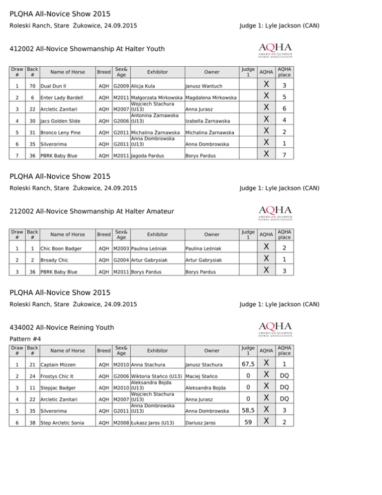 PLQHA All-Novice Show 2015 Roleski Ranch, Stare Żukowice, 24.09.2015 Judge 1: Lyle Jackson (CAN) 412002 All-Novice Showmanship At Halter Youth Draw Back # # Name of Horse Breed Sex& Age Exhibitor Owner 1 70 Dual Dun Il AQH G2009 Alicja Kula 2 6 3 22 Arcletic Zanitari 4 30 Jacs Golden Slide AQH M2011 Małgorzata Mirkowska Magdalena Mirkowska Wojciech Stachura AQH M2007 (U13) Anna Jurasz Antonina Żarnawska AQH G2006 (U13) Izabella Żarnawska 5 31 Bronco Leny Pine 6 7 Enter Lady Bardell Judge AQHA AQHA 1 place X X X X X X X Janusz Wantuch Michalina Żarnawska 35 Silverorima AQH G2011 Michalina Żarnawska Anna Dombrowska AQH G2011 (U13) 36 PBRK Baby Blue AQH M2011 Jagoda Pardus Borys Pardus Anna Dombrowska 3 5 6 4 2 1 7 PLQHA All-Novice Show 2015 Roleski Ranch, Stare Żukowice, 24.09.2015 Judge 1: Lyle Jackson (CAN) 212002 All-Novice Showmanship At Halter Amateur Draw Back # # Name of Horse Breed Sex& Age Exhibitor Owner 1 1 Chic Boon Badger AQH M2003 Paulina Leśniak Paulina Leśniak 2 2 Broady Chic AQH G2004 Artur Gabrysiak Artur Gabrysiak 3 36 PBRK Baby Blue AQH M2011 Borys Pardus Borys Pardus Judge AQHA AQHA 1 place X X X 2 1 3 PLQHA All-Novice Show 2015 Roleski Ranch, Stare Żukowice, 24.09.2015 Judge 1: Lyle Jackson (CAN) 434002 All-Novice Reining Youth Pattern #4 Draw Back # # Name of Horse Breed Sex& Age Exhibitor Owner Judge AQHA AQHA 1 place 67,5 1 21 Captain Mizzen AQH M2010 Anna Stachura Janusz Stachura 2 24 Frostys Chic It Maciej Stańco 0 3 11 Stepjac Badger Aleksandra Bojda 0 4 22 Arcletic Zanitari Anna Jurasz 0 5 35 Silverorima AQH G2006 Wiktoria Stańco (U13) Aleksandra Bojda AQH M2010 (U13) Wojciech Stachura AQH M2007 (U13) Anna Dombrowska AQH G2011 (U13) 6 38 Step Arcletic Sonia AQH M2008 Łukasz Jaros (U13) Dariusz Jaros Anna Dombrowska 58,5 59 X X X X X X 1 DQ DQ DQ 3 2 PLQHA All-Novice Show 2015 Roleski Ranch, Stare Żukowice, 24.09.2015 Judge 1: Lyle Jackson (CAN) 234002 All-Novice Reining Amateur Pattern #4 Draw Back # # Name of Horse Breed Sex& Age Exhibitor Owner Judge AQHA AQHA 1 place 1 3 PBRK Coco Doll AQH M2010 Dorota Kuska Marek Misiek 67,5 2 7 Solar Revolution AQH M2009 Piotr Reisch Piotr Reisch 0 3 8 Whizard In Chrome AQH G2008 Heike Rosener (GER) Heike Rosener (GER) 4 12 Smartin Doc Bar AQH G2006 Dominika Dubowik Dominika Dubowik 68,5 5 30 Jacs Golden Slide AQH G2006 Izabella Żarnawska Izabella Żarnawska 68 6 36 PBRK Baby Blue AQH M2011 Borys Pardus Borys Pardus 7 2 AQH G2004 Artur Gabrysiak Artur Gabrysiak 8 32 Hot Smoking Beauty AQH M2009 Maja Badura Magdalena Badura Broady Chic 64 66,5 67 65,5 X X X X X X X X 3 DQ 7 1 2 5 4 6 PLQHA All-Novice Show 2015 Roleski Ranch, Stare Żukowice, 24.09.2015 Judge 1: Lyle Jackson (CAN) 438002 All-Novice Trail Youth Draw Back # # Name of Horse Breed Sex& Age Exhibitor Owner 59,5 1 70 Dual Dun Il AQH G2009 Alicja Kula 2 6 AQH M2011 Małgorzata Mirkowska Magdalena Mirkowska 51,5 3 38 Step Arcletic Sonia AQH M2008 Łukasz Jaros (U13) 58,5 Enter Lady Bardell Janusz Wantuch Judge AQHA AQHA 1 place Dariusz Jaros X X X 1 3 2 PLQHA All-Novice Show 2015 Roleski Ranch, Stare Żukowice, 24.09.2015 Judge 1: Lyle Jackson (CAN) 238002 All-Novice Trail Amateur Draw Back # # Name of Horse Breed Sex& Age Exhibitor Owner Judge AQHA AQHA 1 place 1 1 Chic Boon Badger AQH M2003 Paulina Leśniak Paulina Leśniak 52,5 2 2 Broady Chic AQH G2004 Artur Gabrysiak Artur Gabrysiak 59,5 3 8 Whizard In Chrome AQH G2008 Heike Rosener (GER) Heike Rosener (GER) 49,5 4 49 Tuff Lovely Girl AQH M2010 Anna Wąsiewicz Małgorzata Wąsiewicz 65,5 X X X X 3 2 4 1 PLQHA All-Novice Show 2015 Roleski Ranch, Stare Żukowice, 24.09.2015 Judge 1: Lyle Jackson (CAN) 440102 All-Novice Horsemanship Walk&Trot Youth Draw Back # # Name of Horse Breed Sex& Age Exhibitor Owner 1 70 Dual Dun Il AQH G2009 Alicja Kula Janusz Wantuch 2 38 Step Arcletic Sonia Dariusz Jaros 3 35 Silverorima 4 30 Jacs Golden Slide 5 22 Arcletic Zanitari AQH M2008 Łukasz Jaros (U13) Anna Dombrowska AQH G2011 (U13) Antonina Żarnawska AQH G2006 (U13) Wojciech Stachura AQH M2007 (U13) 6 21 Captain Mizzen AQH M2010 Anna Stachura Janusz Stachura 7 6 AQH M2011 Małgorzata Mirkowska Magdalena Mirkowska Enter Lady Bardell Anna Dombrowska Izabella Żarnawska Anna Jurasz Judge AQHA AQHA 1 place X X X X X X X 1 6 4 7 5 3 2 PLQHA All-Novice Show 2015 Roleski Ranch, Stare Żukowice, 24.09.2015 Judge 1: Lyle Jackson (CAN) 240102 All-Novice Horsemanship Walk&Trot Amateur Draw Back # # Name of Horse Breed Sex& Age Exhibitor Owner 1 1 Chic Boon Badger AQH M2003 Paulina Leśniak Paulina Leśniak 2 2 Broady Chic AQH G2004 Artur Gabrysiak Artur Gabrysiak 3 8 Whizard In Chrome AQH G2008 Heike Rosener (GER) Heike Rosener (GER) 4 49 Tuff Lovely Girl AQH M2010 Anna Wąsiewicz Małgorzata Wąsiewicz Judge AQHA AQHA 1 place X X X X 2 1 3 4 PLQHA All-Novice Show 2015 Roleski Ranch, Stare Żukowice, 24.09.2015 Judge 1: Lyle Jackson (CAN) 440002 All-Novice Western Horsemanship Youth Draw Back # # Name of Horse Breed Sex& Age Exhibitor Owner 1 70 Dual Dun Il AQH G2009 Alicja Kula Janusz Wantuch 2 21 Captain Mizzen AQH M2010 Anna Stachura Janusz Stachura 3 6 4 22 Arcletic Zanitari AQH M2011 Małgorzata Mirkowska Magdalena Mirkowska Wojciech Stachura AQH M2007 (U13) Anna Jurasz 5 30 Jacs Golden Slide 6 7 Enter Lady Bardell Izabella Żarnawska 35 Silverorima AQH G2006 Michalina Żarnawska Anna Dombrowska AQH G2011 (U13) 38 Step Arcletic Sonia AQH M2008 Łukasz Jaros (U13) Dariusz Jaros Anna Dombrowska Judge AQHA AQHA 1 place X X X X X X X 1 3 2 4 DQ 6 5 PLQHA All-Novice Show 2015 Roleski Ranch, Stare Żukowice, 24.09.2015 Judge 1: Lyle Jackson (CAN) 240002 All-Novice Western Horsemanship Amateur Draw Back # # Name of Horse Breed Sex& Age Exhibitor Owner 1 2 Broady Chic AQH G2004 Artur Gabrysiak Artur Gabrysiak 2 1 Chic Boon Badger AQH M2003 Paulina Leśniak Paulina Leśniak 3 16 JM Mega Matti AQH G2009 Małgorzata Michalak Janusz Miłek 4 8 AQH G2008 Heike Rosener (GER) Heike Rosener (GER) 5 49 Tuff Lovely Girl AQH M2010 Ann
