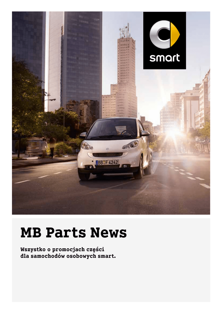 MB Parts News Wszystko o promocjach części dla samochodów osobowych smart. Części blacharskie Panel drzwi PL Numer katalogowy Nazwa Cena brutto PLN Panel drzwi PL 845 Nazwa Cena brutto PLN Pokrywa przednia 525 Nazwa Cena brutto PLN Błotnik PL 525 Numer katalogowy Nazwa Cena brutto PLN A4517930088C22A Spoiler dolny 197 Nazwa Cena brutto PLN Błotnik TL 623 A4517220109CA7L Pokrywa przednia Numer katalogowy A4517510102CA7L Błotnik PL Numer katalogowy A4518810101CA7L Spoiler dolny Błotnik TL Numer katalogowy A4518820101CA7L Panel przedni Numer katalogowy A4516270102CA7L Nazwa Cena brutto PLN Panel przedni 406 Osłona tylna dolna Numer katalogowy Nazwa Cena brutto PLN A4516470084C22A Osłona tylna dolna 202 Nazwa Cena brutto PLN Klocki hamulcowe 217 Nazwa Cena brutto PLN Filtr oleju silnik M132 50 Nazwa Cena brutto PLN Filtr oleju silnik OM160 29 Części eksploatacyjne Klocki hamulcowe Numer katalogowy A4514210210 Filtr oleju silnik M132 Numer katalogowy A1321800010 Filtr oleju silnik OM160 Numer katalogowy A1601840225 Silnik i podzespoły Silnik benzynowy EconomyLine Numer katalogowy A132010020080 Nazwa Cena brutto PLN Silnik benzynowy EconomyLine 7994* *Podana cena zakupu części EconomyLine obowiązuje w przypadku zwrotu części zużytej. Turbosprężarka Numer katalogowy A160096099980 Nazwa Cena brutto PLN Turbosprężarka 2533 Nazwa Cena brutto PLN Termostat 206 Nazwa Cena brutto PLN Pompa wody 468 Termostat Numer katalogowy A6602000515 Pompa wody Numer katalogowy A6602000120 Oferta obowiązuje w Autoryzowanych Serwisach smart na terenie Polski do 31. 12. 2017 roku lub do wyczerpania zapasów. Wszystkie podane ceny są maksymalnymi cenami brutto w PLN. Autoryzowany Serwis ma każdorazowo prawo do obniżenia ceny. Ostateczną ofertę przedstawi Sprzedawca Autoryzowanego Serwisu smart w oparciu o numer identyfikacyjny (VIN) pojazdu klienta. Zdjęcia mają charakter poglądowy i mogą nie odzwierciedlać rzeczywistego wyglądu danego produktu.