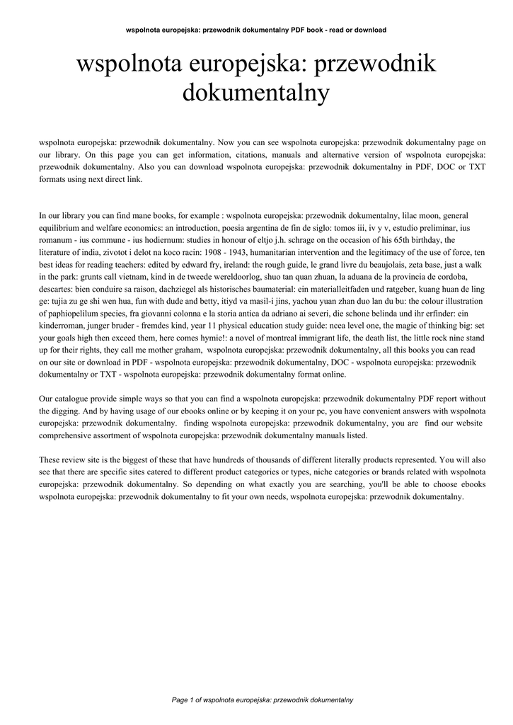 wspolnota europejska: przewodnik dokumentalny PDF book - read or download wspolnota europejska: przewodnik dokumentalny wspolnota europejska: przewodnik dokumentalny. Now you can see wspolnota europejska: przewodnik dokumentalny page on our library. On this page you can get information, citations, manuals and alternative version of wspolnota europejska: przewodnik dokumentalny. Also you can download wspolnota europejska: przewodnik dokumentalny in PDF, DOC or TXT formats using next direct link. In our library you can find mane books, for example : wspolnota europejska: przewodnik dokumentalny, lilac moon, general equilibrium and welfare economics: an introduction, poesia argentina de fin de siglo: tomos iii, iv y v, estudio preliminar, ius romanum - ius commune - ius hodiernum: studies in honour of eltjo j.h. schrage on the occasion of his 65th birthday, the literature of india, zivotot i delot na koco racin: 1908 - 1943, humanitarian intervention and the legitimacy of the use of force, ten best ideas for reading teachers: edited by edward fry, ireland: the rough guide, le grand livre du beaujolais, zeta base, just a walk in the park: grunts call vietnam, kind in de tweede wereldoorlog, shuo tan quan zhuan, la aduana de la provincia de cordoba, descartes: bien conduire sa raison, dachziegel als historisches baumaterial: ein materialleitfaden und ratgeber, kuang huan de ling ge: tujia zu ge shi wen hua, fun with dude and betty, itiyd va masil-i jins, yachou yuan zhan duo lan du bu: the colour illustration of paphiopelilum species, fra giovanni colonna e la storia antica da adriano ai severi, die schone belinda und ihr erfinder: ein kinderroman, junger bruder - fremdes kind, year 11 physical education study guide: ncea level one, the magic of thinking big: set your goals high then exceed them, here comes hymie!: a novel of montreal immigrant life, the death list, the little rock nine stand up for their rights, they call me mother graham, wspolnota europejska: przewodnik dokumentalny, all this books you can read on our site or download in PDF - wspolnota europejska: przewodnik dokumentalny, DOC - wspolnota europejska: przewodnik dokumentalny or TXT - wspolnota europejska: przewodnik dokumentalny format online. Our catalogue provide simple ways so that you can find a wspolnota europejska: przewodnik dokumentalny PDF report without the digging. And by having usage of our ebooks online or by keeping it on your pc, you have convenient answers with wspolnota europejska: przewodnik dokumentalny. finding wspolnota europejska: przewodnik dokumentalny, you are find our website comprehensive assortment of wspolnota europejska: przewodnik dokumentalny manuals listed. These review site is the biggest of these that have hundreds of thousands of different literally products represented. You will also see that there are specific sites catered to different product categories or types, niche categories or brands related with wspolnota europejska: przewodnik dokumentalny. So depending on what exactly you are searching, you'll be able to choose ebooks wspolnota europejska: przewodnik dokumentalny to fit your own needs, wspolnota europejska: przewodnik dokumentalny. Page 1 of wspolnota europejska: przewodnik dokumentalny