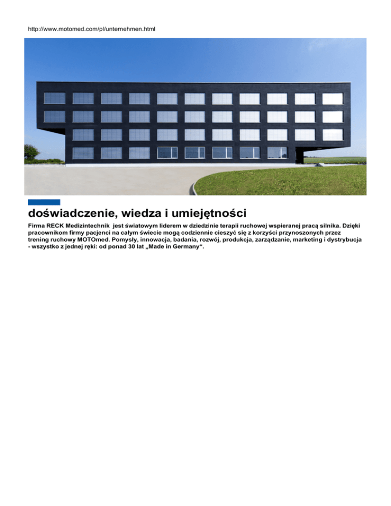 http://www.motomed.com/pl/unternehmen.html doświadczenie, wiedza i umiejętności Firma RECK Medizintechnik jest światowym liderem w dziedzinie terapii ruchowej wspieranej pracą silnika. Dzięki pracownikom firmy pacjenci na całym świecie mogą codziennie cieszyć się z korzyści przynoszonych przez trening ruchowy MOTOmed. Pomysły, innowacja, badania, rozwój, produkcja, zarządzanie, marketing i dystrybucja - wszystko z jednej ręki: od ponad 30 lat „Made in Germany“.