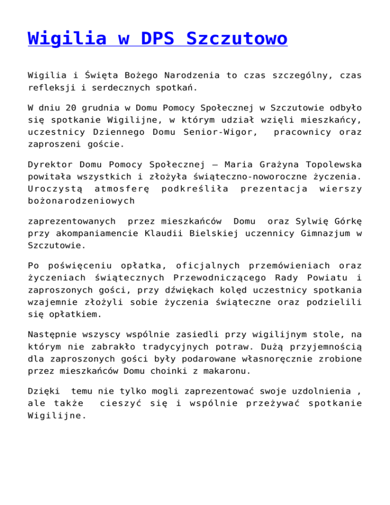 Wigilia w DPS Szczutowo,Informacja o godzinach