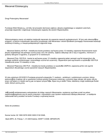 Foundation Effectus Papilionis Mecenat Edukacyjny Drogi Potencjalny Mecenasie! Fundacja Efekt Motyla ju¿ od kilku lat prowadzi darmowe zajêcia z jêzyka angielskiego w wiejskich szko³ach, przyznaje stypendia i organizuje motywacyjne wyjazdy dla swoich Stypendystów. Wykorzystujemy znan± od wieków instytucjê mecenatu do wsparcia naszych podopiecznych. W tym celu stworzyli¶my program, w którym indywidualni darczyñcy przybieraj± rolê Mecenasa i swoimi ¶rodkami pomagaj± finansowaæ edukacjê ambitnej m³odzie¿y z nieuprzywilejowanych regionów kraju. - Mecenat Srebrny 40 PLN - miesiêczna kwota przelewu wp³acana przez 12 miesiêcy zapewnia finansowanie nauki jêzyka angielskiego dla jednego ucznia przez ca³y rok szkolny. Zajêcia odbywaj± siê 2 razy w tygodniu, minimum 3 godziny lekcyjne w tygodniu, w grupach 6-12 osobowych. - Mecenat Z³oty 125 PLN - kwota ta wp³acana przez 12 miesiêcy zapewnia jeden semestr wyp³at stypendium dla jednego wybitnie uzdolnionego i pracowitego ucznia lub uczennicy. Stypendium jest wyp³acane w wysoko¶ci 300 PLN miesiêcznie przez 10 miesiêcy w roku. - Mecenat Platynowy 250 PLN - miesiêczna kwota przelewu w wysoko¶ci 250PLN, zapewnia pe³en rok wyp³at stypendium dla jednego ucznia sposóród naszych Stypendystów. W roku szkolnym 2012/2013 Fundacja przyzna³a stypendia 11 osobom - ambitnym i uzdolnionym uczniom, którzy jednocze¶nie znajduj± siê w wyj±tkowo trudnej sytuacji finansowo-rodzinnej, a pomimo tego staraj± siê swoj± ciê¿k± prac± wk³adan± w naukê zas³u¿yæ na lepsz± przysz³o¶æ. Byæ mo¿e dziêki Tobie, bêdziemy mogli zwiêkszyæ liczbê osób, którym pomo¿emy. Je¶li jeste¶ zainteresowany wst±pieniem do krêgu naszych Mecenasów, wystarczy wys³aæ e-mail na adres: [email protected] ze swoim imieniem i nazwiskiem oraz tytulem wiadomosci „Mecenas", a nastêpnie ustanowiæ sta³y przelew na konto Fundacji o wybranej kwocie. Dane do przelewu: Numer konta: 02 1060 0076 0000 3200 0132 0548, Bank BPH, Al. Pokoju 1, 31-548 Kraków; SWIFT CODE: BPHKPLPK http://www.papilionis.org _PDF_POWERED _PDF_GENERATED 4 March, 2017, 02:27