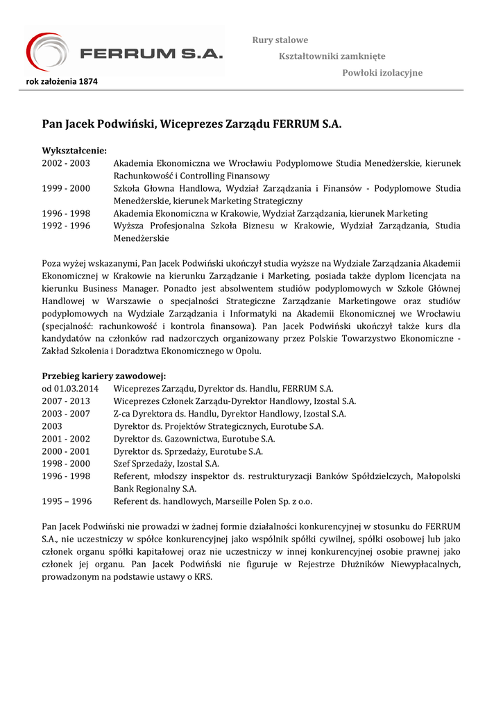 Rury stalowe Kształtowniki zamknięte rok założenia 1874 Powłoki izolacyjne Pan Jacek Podwiński, Wiceprezes Zarządu FERRUM S.A. Wykształcenie: 2002 - 2003 Akademia Ekonomiczna we Wrocławiu Podyplomowe Studia Menedżerskie, kierunek Rachunkowość i Controlling Finansowy 1999 - 2000 Szkoła Głowna Handlowa, Wydział Zarządzania i Finansów - Podyplomowe Studia Menedżerskie, kierunek Marketing Strategiczny 1996 - 1998 Akademia Ekonomiczna w Krakowie, Wydział Zarządzania, kierunek Marketing 1992 - 1996 Wyższa Profesjonalna Szkoła Biznesu w Krakowie, Wydział Zarządzania, Studia Menedżerskie Poza wyżej wskazanymi, Pan Jacek Podwiński ukończył studia wyższe na Wydziale Zarządzania Akademii Ekonomicznej w Krakowie na kierunku Zarządzanie i Marketing, posiada także dyplom licencjata na kierunku Business Manager. Ponadto jest absolwentem studiów podyplomowych w Szkole Głównej Handlowej w Warszawie o specjalności Strategiczne Zarządzanie Marketingowe oraz studiów podyplomowych na Wydziale Zarządzania i Informatyki na Akademii Ekonomicznej we Wrocławiu (specjalność: rachunkowość i kontrola finansowa). Pan Jacek Podwiński ukończył także kurs dla kandydatów na członków rad nadzorczych organizowany przez Polskie Towarzystwo Ekonomiczne Zakład Szkolenia i Doradztwa Ekonomicznego w Opolu. Przebieg kariery zawodowej: od 01.03.2014 Wiceprezes Zarządu, Dyrektor ds. Handlu, FERRUM S.A. 2007 - 2013 Wiceprezes Członek Zarządu-Dyrektor Handlowy, Izostal S.A. 2003 - 2007 Z-ca Dyrektora ds. Handlu, Dyrektor Handlowy, Izostal S.A. 2003 Dyrektor ds. Projektów Strategicznych, Eurotube S.A. 2001 - 2002 Dyrektor ds. Gazownictwa, Eurotube S.A. 2000 - 2001 Dyrektor ds. Sprzedaży, Eurotube S.A. 1998 - 2000 Szef Sprzedaży, Izostal S.A. 1996 - 1998 Referent, młodszy inspektor ds. restrukturyzacji Banków Spółdzielczych, Małopolski Bank Regionalny S.A. 1995 – 1996 Referent ds. handlowych, Marseille Polen Sp. z o.o. Pan Jacek Podwiński nie prowadzi w żadnej formie działalności konkurencyjnej w stosunku do FERRUM S.A., nie uczestniczy w spółce konkurencyjnej jako wspólnik spółki cywilnej, spółki osobowej lub jako członek organu spółki kapitałowej oraz nie uczestniczy w innej konkurencyjnej osobie prawnej jako członek jej organu. Pan Jacek Podwiński nie figuruje w Rejestrze Dłużników Niewypłacalnych, prowadzonym na podstawie ustawy o KRS.
