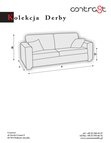 Kolekcja Derby B D C Contrast ul. Józefa Czumy 8 05-074 Halinów-Józefin A tel. +48 22 760 43 37 tel/fax +48 22 783 66 31 www.contrastmeble.pl D imensions width A height B depth C seat height D 1-del 65 cm 88 cm 93 cm 45 cm 1,5-del 80 cm 88 cm 93 cm 45 cm 2-del 130 cm 88 cm 93 cm 45 cm 3-del 160 cm 88 cm 93 cm 45 cm 3,5-del 195 cm 88 cm 93 cm 45 cm 80 + 60 cm 88 cm 93 cm 45 cm divan-sofa 65 65 cm 88 cm 158 cm 45 cm divan-sofa 80 80 cm 88 cm 158 cm 45 cm armrest 1 22 cm armrest 2 19 cm armrest 3 4 cm Y-del Ecorner elements H 90° 108 x 108 cm Hs 90° 93 x 93 cm H 45° footstool 72 x 66 cm