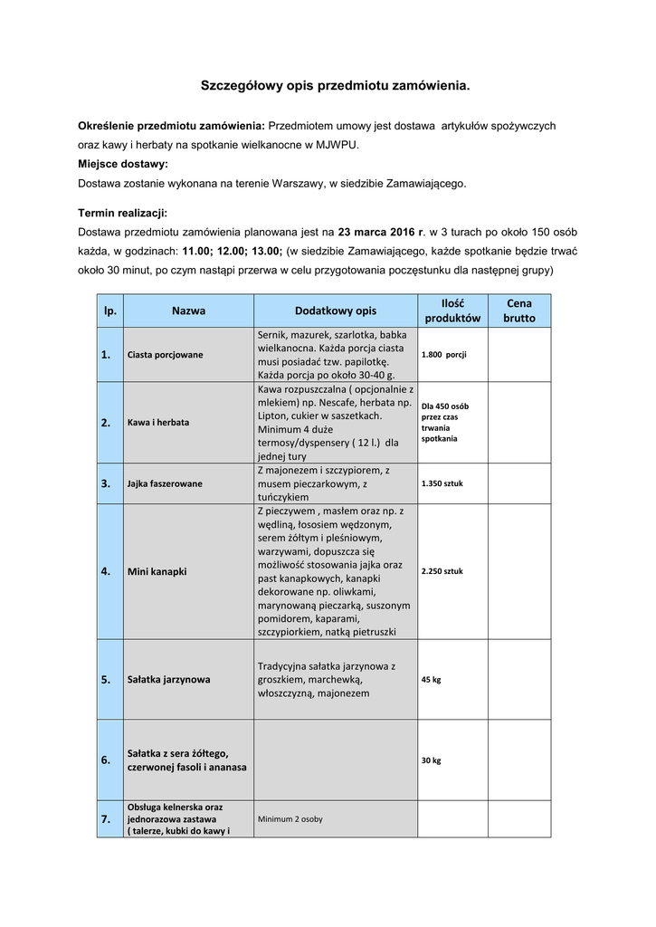 Szczegółowy opis przedmiotu zamówienia. Określenie przedmiotu zamówienia: Przedmiotem umowy jest dostawa artykułów spożywczych oraz kawy i herbaty na spotkanie wielkanocne w MJWPU. Miejsce dostawy: Dostawa zostanie wykonana na terenie Warszawy, w siedzibie Zamawiającego. Termin realizacji: Dostawa przedmiotu zamówienia planowana jest na 23 marca 2016 r. w 3 turach po około 150 osób każda, w godzinach: 11.00; 12.00; 13.00; (w siedzibie Zamawiającego, każde spotkanie będzie trwać około 30 minut, po czym nastąpi przerwa w celu przygotowania poczęstunku dla następnej grupy) lp. 1. Nazwa Ciasta porcjowane 2. Kawa i herbata 3. Jajka faszerowane 4. Mini kanapki 5. Sałatka jarzynowa 6. Sałatka z sera żółtego, czerwonej fasoli i ananasa 7. Obsługa kelnerska oraz jednorazowa zastawa ( talerze, kubki do kawy i Dodatkowy opis Sernik, mazurek, szarlotka, babka wielkanocna. Każda porcja ciasta musi posiadać tzw. papilotkę. Każda porcja po około 30-40 g. Kawa rozpuszczalna ( opcjonalnie z mlekiem) np. Nescafe, herbata np. Lipton, cukier w saszetkach. Minimum 4 duże termosy/dyspensery ( 12 l.) dla jednej tury Z majonezem i szczypiorem, z musem pieczarkowym, z tuńczykiem Z pieczywem , masłem oraz np. z wędliną, łososiem wędzonym, serem żółtym i pleśniowym, warzywami, dopuszcza się możliwość stosowania jajka oraz past kanapkowych, kanapki dekorowane np. oliwkami, marynowaną pieczarką, suszonym pomidorem, kaparami, szczypiorkiem, natką pietruszki Tradycyjna sałatka jarzynowa z groszkiem, marchewką, włoszczyzną, majonezem Ilość produktów 1.800 porcji Dla 450 osób przez czas trwania spotkania 1.350 sztuk 2.250 sztuk 45 kg 30 kg Minimum 2 osoby Cena brutto herbaty, łyżeczki, widelce, obrusy na stoły, serwetki ) RAZEM: Założenia ogólne: 1. Dostarczane towary muszą być wykonane z najwyższej jakości produktów naturalnych (nieprzetworzonych), świeżych (niemrożonych) oraz składników sezonowych. Oferowane produkty, muszą spełniać wymogi SANEPIDU i obowiązujące normy jakości żywieniowej. 2. Dodatkowo dostarczony towar musi zostać opakowany w taki sposób, aby jego opakowanie chroniło towar przed ubytkiem, zabrudzeniem lub uszkodzeniem. Sposób opakowania i przewozu powinien odpowiadać właściwościom towaru. 3. Wszystkie produkty o krótkotrwałym terminie spożycia muszą spełniać wymogi wyrobów dopuszczonych do obrotu i stosowania w żywieniu zbiorowym. 4. Wszystkie ciasta porcjowane, kanapki, jajka muszą być serwowane na tacach jednorazowego użytku (np. taca aluminiowa lub styropianowa) oraz dodatkowo szczelnie zabezpieczone folią spożywczą. 5. Zastawa jednorazowa (talerze, kubki do herbaty, kawy, widelce, łyżeczki, widelczyki do ciasta, serwetki jednorazowe).