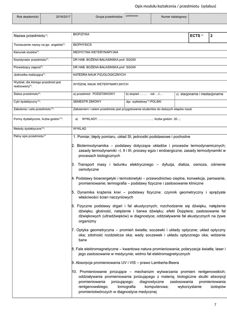 Opis modułu kształcenia / przedmiotu (sylabus) Rok akademicki: 2016/2017 Grupa przedmiotów: podstawowe Numer katalogowy: Nazwa przedmiotu1): BIOFIZYKA Tłumaczenie nazwy na jęz. angielski3): BIOPHYSICS Kierunek studiów4): MEDYCYNA WETERYNARYJNA Koordynator przedmiotu5): DR HAB. BOŻENA BAŁASINSKA prof. SGGW Prowadzący zajęcia6): DR HAB. BOŻENA BAŁASINSKA prof. SGGW Jednostka realizująca7): KATEDRA NAUK FIZJOLOGICZNYCH Wydział, dla którego przedmiot jest realizowany8): WYDZIAŁ NAUK WETERYNARYJNYCH Status przedmiotu9): a) przedmiot: PODSTAWOWY b) stopień ……. Cykl dydaktyczny10): SEMESTR ZIMOWY Jęz. wykładowy11):POLSKI Założenia i cele przedmiotu12): Założeniem i celem przedmiotu jest przygotowanie studentów do dalszych etapów nauki Formy dydaktyczne, liczba godzin 13): a) ECTS 2) rok …I… 2 c) stacjonarne i niestacjonarne WYKLADY………………………………………………; liczba godzin .30...; Metody dydaktyczne14): WYKLAD Pełny opis przedmiotu15 1. Pomiar, błędy pomiaru, układ SI, jednostki podstawowe i pochodne 2. Biotermodynamika – podstawy dotyczące układów i procesów termodynamicznych; zasady termodynamiki –I, II i III; procesy egzo i endoergiczne; zasady termodynamiki w procesach biologicznych 3. Transport masy i ładunku elektrycznego – dyfuzja, dializa, osmoza, ciśnienie osmotyczne 4. Podstawy bioenergetyki i termokinetyki – przewodnictwo cieplne, konwekcja, parowanie, promieniowanie; termografia – podstawy fizyczne i zastosowanie kliniczne 5. Dynamika krążenia krwi – podstawy fizyczne; czynnik geometryczny i sprężyste właściwości ścian naczyniowych 6. Fizyczne podstawy drgań i fal akustycznych; rozchodzenie się dźwięku, natężenie dźwięku; głośność, natężenie i barwa dźwięku; efekt Dopplera; zastosowanie fal dźwiękowych (ultradźwięków) w diagnostyce; oddziaływanie fal akustycznych na żywe organizmy 7. Optyka geometryczna – promień światła; soczewki i układy optyczne; układ optyczny oka; zdolność rozdzielcza oka; wady soczewek i układu optycznego oka; widzenie barw 8. Fale elektromagnetyczne – kwantowa natura promieniowania; polaryzacja światła; laser i jego zastosowanie w medycynie; widmo fal elektromagnetycznych 9. Absorpcja promieniowania UV i VIS – prawo Lamberta-Beera 10. Promieniowanie jonizujące – mechanizm wytwarzania promieni rentgenowskich; oddziaływania promieniowania jonizującego z materią; biologiczne skutki absorpcji promieniowania jonizującego; diagnostyczne zastosowania promieniowania rentgenowskiego; tomografia komputerowa; wykorzystanie izotopów promieniotwórczych w diagnostyce medycznej 7 11. Spektroskopia Magnetycznego Rezonansu Jądrowego (NMR) – podstawy fizyczne NMR, tomografia rezonansu magnetycznego, biomedyczne zastosowanie spektroskopii NMR Wymagania formalne (przedmioty wprowadzające)16): Założenia wstępne17): Efekty kształcenia18): Sposób weryfikacji efektów kształcenia19): PODSTAWOWA WIEDZA Z FIZYKI 01 – zna podstawowe terminy, prawa fizyczne, które potrzebne będą do realizacji innych przedmiotów; zna podstawy fizyczne działania wybranej aparatury diagnostycznej – USG, tomografia komputerowa, MRI; zna oddziaływania czynników fizycznych na organizm. EGZAMIN PISEMNY Forma dokumentacji osiągniętych efektów IMIENNE KARTY OCENY STUDENTA kształcenia 20): Elementy i wagi mające wpływ na ocenę końcową21): 51% - 100 % WYKŁAD Miejsce realizacji zajęć22): SALA WYKŁADOWA Literatura podstawowa i uzupełniająca23): 1. Biofizyka, pod red. F.Jaroszyka, PZWL 2. Wybrane zagadnienia z biofizyki. pod red. St. Miękisza, A. Hendricha. UWAGI24): 8 Wskaźniki ilościowe dla modułu kształcenia/przedmiotu 25 Całkowity nakład czasu pracy – przyporządkowanie ECTS Wykłady 30h Ćwiczenia laboratoryjne + terenowe 0h Udział w konsultacjach (1/3 wszystkich konsultacji) 0h Obecność na egzaminie 2h Dokończenie sprawozdań z zadań prowadzonych w trakcie ćwiczeń laboratoryjnych 0h Przygotowanie do kolokwium 0h Przygotowanie pracy pisemnej 0h Przygotowanie do egzaminu 10h Razem: 42 h ECTS W ramach całkowitego nakładu czasu pracy studenta - łączna liczba punktów ECTS, którą student uzyskuje na zajęciach wymagających bezpośredniego udziału nauczycieli akademickich: Wykłady 30h Ćwiczenia laboratoryjne + terenowe 0h Udział w konsultacjach (1/3 wszystkich konsultacji) 0h Egzamin 2h Razem: 32 h ECTS W ramach całkowitego nakładu czasu pracy studenta - łączna liczba punktów ECTS, którą student uzyskuje w ramach zajęć o charakterze praktycznym: Ćwiczenia laboratoryjne 0h Dokończenie sprawozdań z zadań prowadzonych w trakcie ćwiczeń laboratoryjnych 0h Udział w konsultacjach (1/3 wszystkich konsultacji) 0h Razem: 0h ECTS 9 Tabela zgodności kierunkowych efektów kształcenia efektami przedmiotu Nr /symbol efektu 01 26) Wymienione w wierszu efekty kształcenia: zna podstawowe terminy, prawa fizyczne, które potrzebne będą do realizacji innych przedmiotów; zna podstawy fizyczne działania wybranej aparatury diagnostycznej – USG, tomografia komputerowa, MRI; zna oddziaływania czynników fizycznych na organizm. Odniesienie do efektów dla programu kształcenia na kierunku K_W01 02 03 04 05 1 1