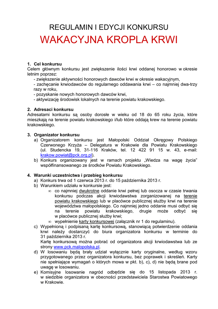 REGULAMIN I EDYCJI KONKURSU WAKACYJNA KROPLA KRWI 1. Cel konkursu Celem głównym konkursu jest zwiększenie ilości krwi oddanej honorowo w okresie letnim poprzez: - zwiększenie aktywności honorowych dawców krwi w okresie wakacyjnym, - zachęcanie krwiodawców do regularnego oddawania krwi – co najmniej dwa-trzy razy w roku, - pozyskanie nowych honorowych dawców krwi, - aktywizację środowisk lokalnych na terenie powiatu krakowskiego. 2. Adresaci konkursu Adresatami konkursu są osoby dorosłe w wieku od 18 do 65 roku życia, które mieszkają na terenie powiatu krakowskiego i/lub które oddają krew na terenie powiatu krakowskiego. 3. Organizator konkursu a) Organizatorem konkursu jest Małopolski Oddział Okręgowy Polskiego Czerwonego Krzyża – Delegatura w Krakowie dla Powiatu Krakowskiego (ul. Studencka 19, 31-116 Kraków, tel. 12 422 91 15 w. 43, e-mail: [email protected]). b) Konkurs organizowany jest w ramach projektu „Wiedza na wagę życia” współfinansowanego ze środków Powiatu Krakowskiego. 4. Warunki uczestnictwa i przebieg konkursu a) Konkurs trwa od 1 czerwca 2013 r. do 15 października 2013 r. b) Warunkiem udziału w konkursie jest: • co najmniej dwukrotne oddanie krwi pełnej lub osocza w czasie trwania konkursu podczas akcji krwiodawstwa zorganizowanej na terenie powiatu krakowskiego lub w placówce publicznej służby krwi na terenie województwa małopolskiego. Co najmniej jedno oddanie musi odbyć się na terenie powiatu krakowskiego, drugie może odbyć się w placówce publicznej służby krwi; • wypełnienie karty konkursowej (załącznik nr 1 do regulaminu). c) Wypełnioną i podpisaną kartę konkursową, stanowiącą potwierdzenie oddania krwi należy dostarczyć do biura organizatora konkursu w terminie do 31 października 2013 r. Kartę konkursową można pobrać od organizatora akcji krwiodawstwa lub ze strony www.pck.malopolska.pl. d) W losowaniu będą brały udział wyłącznie karty oryginalne, według wzoru przygotowanego przez organizatora konkursu, bez poprawek i skreśleń. Karty nie spełniające wymagań o których mowa w pkt. b), c), d) nie będą brane pod uwagę w losowaniu. e) Komisyjne losowanie nagród odbędzie się do 15 listopada 2013 r. w siedzibie organizatora w obecności przedstawiciela Starostwa Powiatowego w Krakowie. f) Wyniki konkursu opublikowane zostaną na stronie internetowej organizatora. Organizator skontaktuje się z laureatami konkursu telefonicznie. 5. Nagrody a) Wylosowana zostanie jedna nagroda główna (sprzęt elektroniczny) oraz 3-5 nagród pocieszenia (zestawy upominków). b) Nagrody będą do odebrania do dnia 30 listopada 2013 r. w siedzibie organizatora. c) Nieodebranie nagrody we wskazanym terminie będzie równoznaczne z rezygnacją z nagrody. 6. Postanowienia końcowe a) Udział w konkursie jest równoznaczny z akceptacją niniejszego regulaminu. b) Organizator konkursu zastrzega sobie możliwość zmian w regulaminie. c) Sytuacje nieobjęte niniejszym regulaminem rozstrzyga organizator konkursu. d) Dane osobowe uczestników konkursu przetwarzane będą zgodnie z Ustawą o ochronie danych osobowych (Dz. U. nr 133/97, poz. 883). Uczestnikom Konkursu przysługuje prawo dostępu do treści swoich danych oraz ich poprawiania, w tym celu powinni skontaktować się oni z organizatorem, który jest administratorem danych w rozumieniu Ustawy o ochronie danych osobowych (DZ. U. Nr 133/97, poz. 883). e) Konkurs nie jest "grą losową" w rozumieniu ustawy z 29 lipca 1992 r. o grach losowych i zakładach wzajemnych (Dz. U. Nr 68, poz. 341, z późn. zm.).