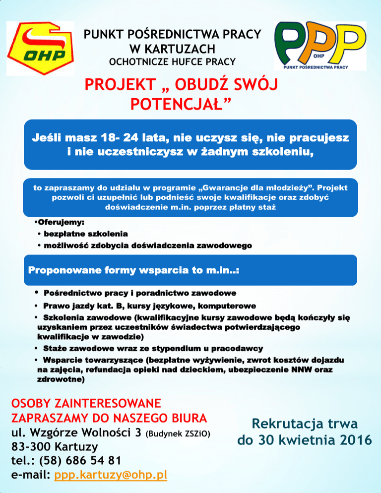 PUNKT POŚREDNICTWA PRACY W KARTUZACH OCHOTNICZE HUFCE PRACY PROJEKT „ OBUDŹ SWÓJ POTENCJAŁ” Jeśli masz 18- 24 lata, nie uczysz się, nie pracujesz i nie uczestniczysz w żadnym szkoleniu, to zapraszamy do udziału w programie „Gwarancje dla młodzieży”. Projekt pozwoli ci uzupełnić lub podnieść swoje kwalifikacje oraz zdobyć doświadczenie m.in. poprzez płatny staż •Oferujemy: • bezpłatne szkolenia • możliwość zdobycia doświadczenia zawodowego Proponowane formy wsparcia to m.in..: • Pośrednictwo pracy i poradnictwo zawodowe • Prawo jazdy kat. B, kursy językowe, komputerowe • Szkolenia zawodowe (kwalifikacyjne kursy zawodowe będą kończyły się uzyskaniem przez uczestników świadectwa potwierdzającego kwalifikacje w zawodzie) • Staże zawodowe wraz ze stypendium u pracodawcy • Wsparcie towarzyszące (bezpłatne wyżywienie, zwrot kosztów dojazdu na zajęcia, refundacja opieki nad dzieckiem, ubezpieczenie NNW oraz zdrowotne) OSOBY ZAINTERESOWANE ZAPRASZAMY DO NASZEGO BIURA ul. Wzgórze Wolności 3 (Budynek ZSZiO) 83-300 Kartuzy tel.: (58) 686 54 81 e-mail: [email protected] Rekrutacja trwa do 30 kwietnia 2016