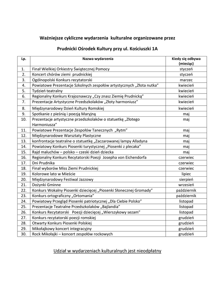 Ważniejsze cykliczne wydarzenia kulturalne organizowane przez Prudnicki Ośrodek Kultury przy ul. Kościuszki 1A Lp. Nazwa wydarzenia Kiedy się odbywa (miesiąc) 1. 2. 3. 4. 5. 6. 7. Finał Wielkiej Orkiestry Świątecznej Pomocy Koncert chórów ziemi prudnickiej Ogólnopolski Konkurs recytatorski Powiatowe Prezentacje Szkolnych zespołów artystycznych „Złota nutka” Tydzień teatralny Regionalny Konkurs Krajoznawczy „Czy znasz Ziemię Prudnicką” Prezentacje Artystyczne Przedszkolaków „Złoty harmoniusz” styczeń styczeń marzec kwiecień kwiecień kwiecień kwiecień 8. 9. 10. Międzynarodowy Dzień Kultury Romskiej Spotkanie z pieśnią i poezją Maryjną Prezentacje artystyczne przedszkolaków o statuetkę „Złotego Harmoniusza” Powiatowe Prezentacje Zespołów Tanecznych „Rytm” Międzynarodowe Warsztaty Plastyczne konfrontacje teatralne o statuetkę „Zaczarowanej lampy Alladyna Powiatowy Konkurs Piosenki turystycznej „Piosenki z plecaka” Rajd maluchów – polsko – czeski dzień dziecka Regionalny Konkurs Recytatorski Poezji Josepha von Eichendorfa Dni Prudnika Finał wyborów Miss Ziemi Prudnickiej Kolorowe lato w Mieście Międzynarodowy Festiwal Jazzowy Dożynki Gminne Konkurs Wokalny Piosenki dziecięcej „Piosenki Słonecznej Gromady” Konkurs ortograficzny „Ortomania” Powiatowy Przegląd Piosenki patriotycznej „Dla Ciebie Polsko” Prezentacje Teatralne Przedszkolaków „Bajlandia” Konkurs Recytatorski Poezji dziecięcej „Wierszykowy sezam” Konkurs recytatorski poezji romskiej Otwarty Konkurs Piosenki Polskiej Mikołajkowy koncert integracyjny Rock Mikołajki – koncert zespołów rockowych kwiecień maj maj 11. 12. 13. 14. 15. 16. 17. 18. 19. 20. 21. 22. 23. 24. 25. 26. 27. 28. 29. 30. Udział w wydarzeniach kulturalnych jest nieodpłatny maj maj maj maj maj czerwiec czerwiec czerwiec lipiec sierpień wrzesień październik październik listopad listopad listopad grudzień grudzień grudzień grudzień
