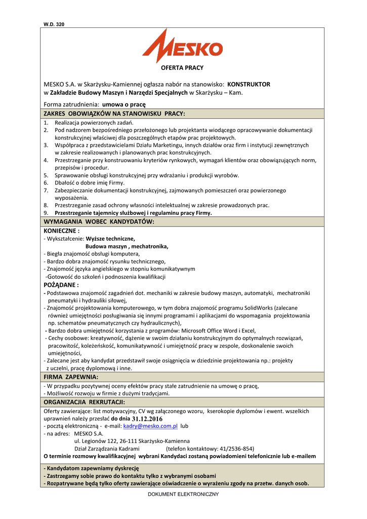 W.D. 320 OFERTA PRACY MESKO S.A. w Skarżysku-Kamiennej ogłasza nabór na stanowisko: KONSTRUKTOR w Zakładzie Budowy Maszyn i Narzędzi Specjalnych w Skarżysku – Kam. Forma zatrudnienia: umowa o pracę ZAKRES OBOWIĄZKÓW NA STANOWISKU PRACY: 1. 2. 3. 4. 5. 6. 7. 8. 9. Realizacja powierzonych zadań. Pod nadzorem bezpośredniego przełożonego lub projektanta wiodącego opracowywanie dokumentacji konstrukcyjnej właściwej dla poszczególnych etapów prac projektowych. Współpraca z przedstawicielami Działu Marketingu, innych działów oraz firm i instytucji zewnętrznych w zakresie realizowanych i planowanych prac konstrukcyjnych. Przestrzeganie przy konstruowaniu kryteriów rynkowych, wymagań klientów oraz obowiązujących norm, przepisów i procedur. Sprawowanie obsługi konstrukcyjnej przy wdrażaniu i produkcji wyrobów. Dbałość o dobre imię Firmy. Zabezpieczanie dokumentacji konstrukcyjnej, zajmowanych pomieszczeń oraz powierzonego wyposażenia. Przestrzeganie zasad ochrony własności intelektualnej w zakresie prowadzonych prac. Przestrzeganie tajemnicy służbowej i regulaminu pracy Firmy. WYMAGANIA WOBEC KANDYDATÓW: KONIECZNE : - Wykształcenie: Wyższe techniczne, Budowa maszyn , mechatronika, - Biegła znajomość obsługi komputera, - Bardzo dobra znajomość rysunku technicznego, - Znajomość języka angielskiego w stopniu komunikatywnym -Gotowość do szkoleń i podnoszenia kwalifikacji POŻĄDANE : - Podstawowa znajomość zagadnień dot. mechaniki w zakresie budowy maszyn, automatyki, mechatroniki pneumatyki i hydrauliki siłowej, - Znajomość projektowania komputerowego, w tym dobra znajomość programu SolidWorks (zalecane również umiejętności posługiwania się innymi programami i aplikacjami do wspomagania projektowania np. schematów pneumatycznych czy hydraulicznych), - Bardzo dobra umiejętność korzystania z programów: Microsoft Office Word i Excel, - Cechy osobowe: kreatywność, dążenie w swoim działaniu konstrukcyjnym do optymalnych rozwiązań, pracowitość, koleżeńskość, komunikatywność i umiejętność pracy w zespole, doskonalenie swoich umiejętności, - Zalecane jest aby kandydat przedstawił swoje osiągnięcia w dziedzinie projektowania np.: projekty z uczelni, pracę dyplomową i inne. FIRMA ZAPEWNIA: - W przypadku pozytywnej oceny efektów pracy stałe zatrudnienie na umowę o pracę, - Możliwość rozwoju w firmie z dużymi tradycjami. ORGANIZACJIA REKRUTACJI: Oferty zawierające: list motywacyjny, CV wg załączonego wzoru, kserokopie dyplomów i ewent. wszelkich uprawnień należy przesłać do dnia 15.09.2016r. 31.12.2016 - pocztą elektroniczną - e-mail: [email protected] lub - na adres: MESKO S.A. ul. Legionów 122, 26-111 Skarżysko-Kamienna Dział Zarządzania Kadrami (telefon kontaktowy: 41/2536-854) O terminie rozmowy kwalifikacyjnej wybrani Kandydaci zostaną powiadomieni telefonicznie lub e-mailem - Kandydatom zapewniamy dyskrecję - Zastrzegamy sobie prawo do kontaktu tylko z wybranymi osobami - Rozpatrywane będą tylko oferty zawierające oświadczenie o wyrażeniu zgody na przetw. danych osob. DOKUMENT ELEKTRONICZNY W.D. 320 DOKUMENT ELEKTRONICZNY