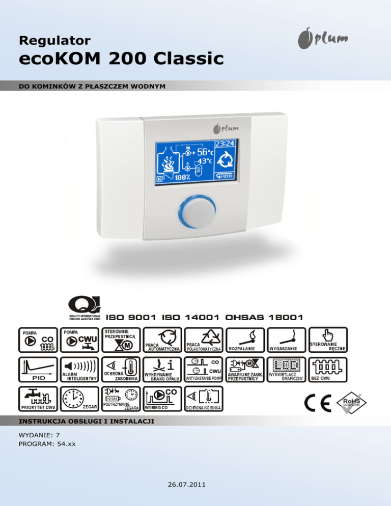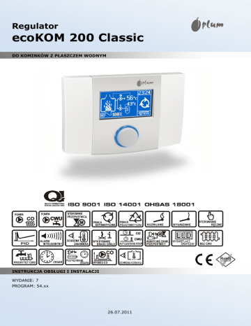 Regulator ecoKOM 200 Classic DO KOMINKÓW Z PŁASZCZEM WODNYM INSTRUKCJA OBSŁUGI I INSTALACJI WYDANIE: 7 PROGRAM: 54.xx 26.07.2011 2 Spis treści 1. BEZPIECZEŃSTWO INSTALOWANIA UŻYTKOWANIA .................................................. 4 2. INFORMACJE OGÓLNE ................................. 4 3. WYKONANIA REGUALTORA .......................... 5 4. DYREKTYWA WEEE 2002/96/WE ................... 5 5. PRZECHOWYWANIE DOKUMENTACJI ............. 5 INSTRUKCJA OBSŁUGI 7 6. OBSŁUGA REGULATORA ............................... 8 6.1. Zadawanie temperatur .......................... 8 7. MENU REGULATORA .................................... 9 8. TRYBY PRACY REGULATORA ....................... 10 8. TRYBY PRACY REGULATORA ....................... 10 8.1. Tryb pracy „Automatyczny” ................. 10 8.2. Tryb pracy „Półautomatyczny” ............. 10 8.3. Tryb pracy „Rozpalanie” ...................... 11 8.4. Tryb pracy „Wygaszanie” .................... 11 8.5. Tryb pracy „Ręczny” ........................... 11 9. FUNKCJE CWU REGUALATORA .................... 12 9.1. Funkcje\Bez priorytetu ........................ 12 9.2. Funkcje\Priorytet CWU ........................ 12 9.3. Funkcje\Bez CWU ............................... 12 10. ALARMY .................................................... 12 11. MENU OPCJE ............................................. 13 11.1. Opcje palenia ..................................... 13 11.2. Wykrywanie braku opału ..................... 14 11.3. Konfiguracja We/Wy ........................... 14 11.4. Wyjście H ........................................... 15 11.5. Kalibracja przepustnicy. ...................... 15 11.6. Ustawienia serwisowe ......................... 16 11.7. Przywrócenie parametrów fabrycznych . 16 11.8. Tabela parametrów domyślnych........... 17 12. MENU OBSŁUGA ........................................ 17 12.1. Menu obsługa\ Ustawienia ................... 17 12.2. Menu obsługa\ Ekran .......................... 17 12.3. Menu obsługa\ Głośność ...................... 18 12.4. Menu obsługa\ Zegar .......................... 18 13. WYŁĄCZENIE ............................................ 18 INSTRUKCJA INSTALACJI 19 14. DANE TECHNICZNE ................................... 20 14.1. Skład zestawu .................................... 20 15. MONTAŻ ECOKOM 200 ............................... 20 15.1. Instalacja regulatora. .......................... 20 15.2. Podłączenie obwodów zewnętrznych. ... 21 16. SCHEMAT APLIKACYJNY ............................. 22 16.1.1. 16.1.2. 16.1.3. 16.1.4. 16.1.5. 16.1.6. Obsługa złącz ................................. 24 Podłączenie obwodów sieciowych ....... 24 Podłączenie wyjścia H ...................... 24 Podłączenie czujników temperatury .... 25 Instalacja przepustnicy PPD .............. 25 Podłączenie przepustnicy PPD ........... 26 17. ZAMKNIĘCIE OBUDOWY............................. 26 18. USTAWIENIA SERWISOWE ......................... 27 19. TYPOWE NIEDOMAGANIA UKŁADU .............. 29 Spis rysunków I Rys. 2.1 Schemat funkcyjny ............................................ 4 Rys. 3.1 Tabela wykonań regulatora. ................................ 5 Rys. 6.1 Ekran powitalny ................................................. 8 Rys. 6.2 Ekran główny .................................................... 8 Rys. 7.1 Wywołanie menu regulatora ................................ 9 Rys. 7.2 Wygląd menu regulatora .................................... 9 Rys. 7.3 Tryby menu głównego regulatora ........................ 9 Rys. 7.4 Widok struktury menu. ....................................... 9 Rys. 8.1 Ikony trybów pracy regulatora ...........................10 Rys. 8.2 Ekran pracy w trybie „Automatycznym” ...............10 Rys. 8.3 Ekran pracy w trybie „Półautomatycznym” ...........10 Rys. 8.4 Ekran pracy trybu „Rozpalanie” ..........................11 Rys. 8.5 Ekran pracy trybu „Wygaszanie” .........................11 Rys. 8.6 Ekran pracy trybu „Ręczny” ...............................11 Rys. 10.1 Ekran alarmu ..................................................12 Rys. 11.1 Działanie detekcji braku opału ..........................14 Rys. 11.2 Ustawienie szybkości opadania temperatury.......14 Rys. 11.3 Ekran logowania użytkownika ...........................16 Rys. 12.1 Elektroniczna tabliczka znamionowa. .................17 Rys. 12.2 Ekran opcji wyświetlacza. ................................17 Rys. 12.3 Ekran opcji dźwięku. .......................................18 Rys. 12.4 Ekran ustawiania zegara ..................................18 Rys. 13.1 Ekran wyłączenia ............................................18 Rys. 15.1 Sposób otwarcia obudowy ................................20 Rys. 15.2 Instalacja regulatora na ścianie ........................21 Rys. 15.3 Widok wnętrza regulatora z zaciskami ...............21 Rys. 16.1 Schemat aplikacyjny .......................................22 Rys. 16.2 Schemat aplikacyjny z instalacjami systemu zamkniętego .................................................................23 Rys. 16.3 Obsługa złącz zaciskowych ...............................24 Rys. 16.4 Podłączenie zasilania sieciowego .......................24 Rys. 16.5 Podłączenie wyjścia H ......................................25 Rys. 16.6 Podłączenie zaworu trójdrogowego ...................25 Rys. 16.7 Podłączanie czujników temperatur ....................25 Rys. 16.8 Sposób podłączenia przepustnicy ......................26 Rys. 16.9 Podłączenie przepustnicy PPD do regulatora .......26 Rys. 17.1 Zamknięcie obudowy krok pierwszy ..................26 Rys. 17.2 Zamknięcie obudowy krok drugi .......................26 Rys. 18.2 Informacja o błędnie wprowadzonym haśle ........27 Rys. 19.1 Rysunek instalacyjny obudowy .........................33 1. BEZPIECZEŃSTWO I UŻYTKOWANIA INSTALOWANIA Regulator może być użytkowany tylko w obrębie gosp
